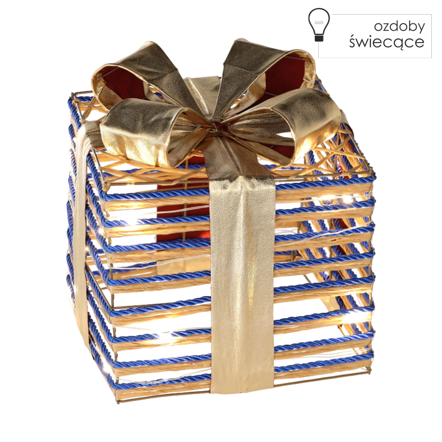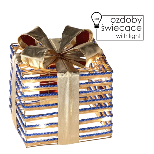 Ez a stílusos karácsonyi dekoráció, kék masnis ajándék formájában, meghitt, meleg fényt áraszt a beépített LED fényeknek köszönhetően. A 25 × 25 cm-es méret látványos, mégis elegáns dísz, amely könnyen kombinálható más dekorációkkal.