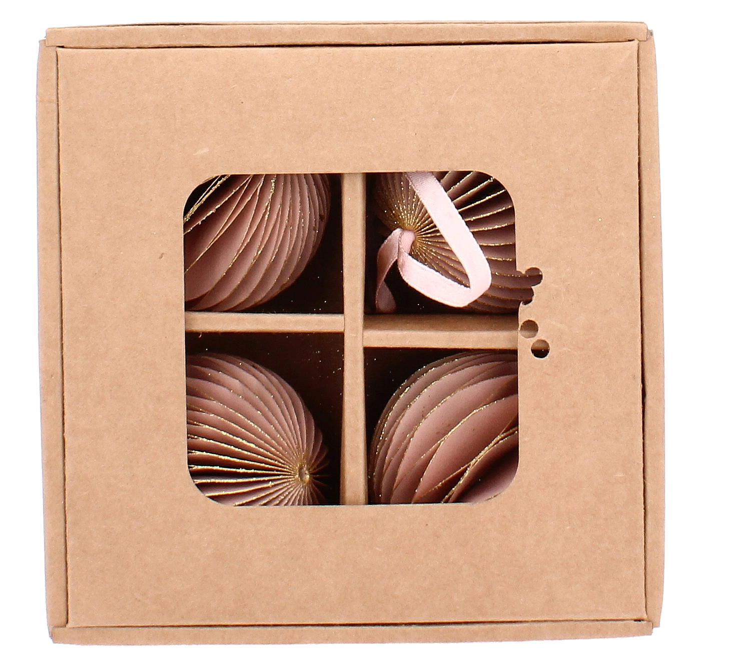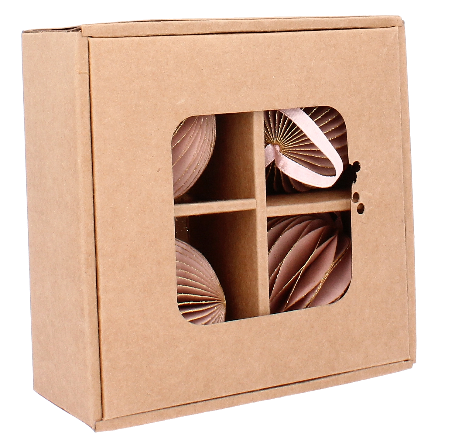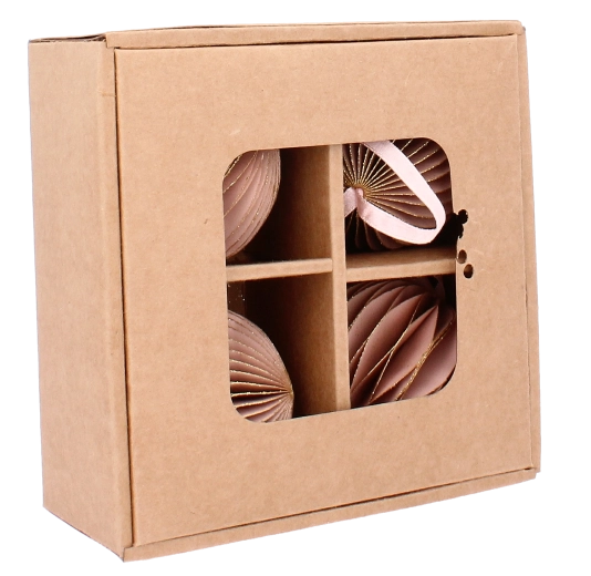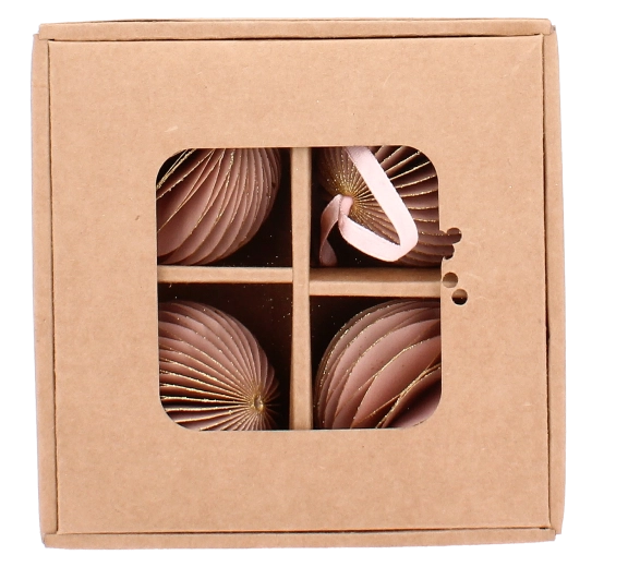 Stílusos, négy darabos rózsaszín papír karácsonyi dísz készlet 7 cm átmérővel, amely finom és elegáns hangulatot kölcsönöz a fának és a dekorációknak. Minden dísz könnyű, gyermek- és kisállatbarát, és a felakasztáshoz mellékelt zsinórnak köszönhetően könnyen elhelyezhető a fán, girlandon vagy koszorún. Az összehajtható kialakítás egyszerű tárolást és hosszan tartó használatot biztosít az ünnepek után is.