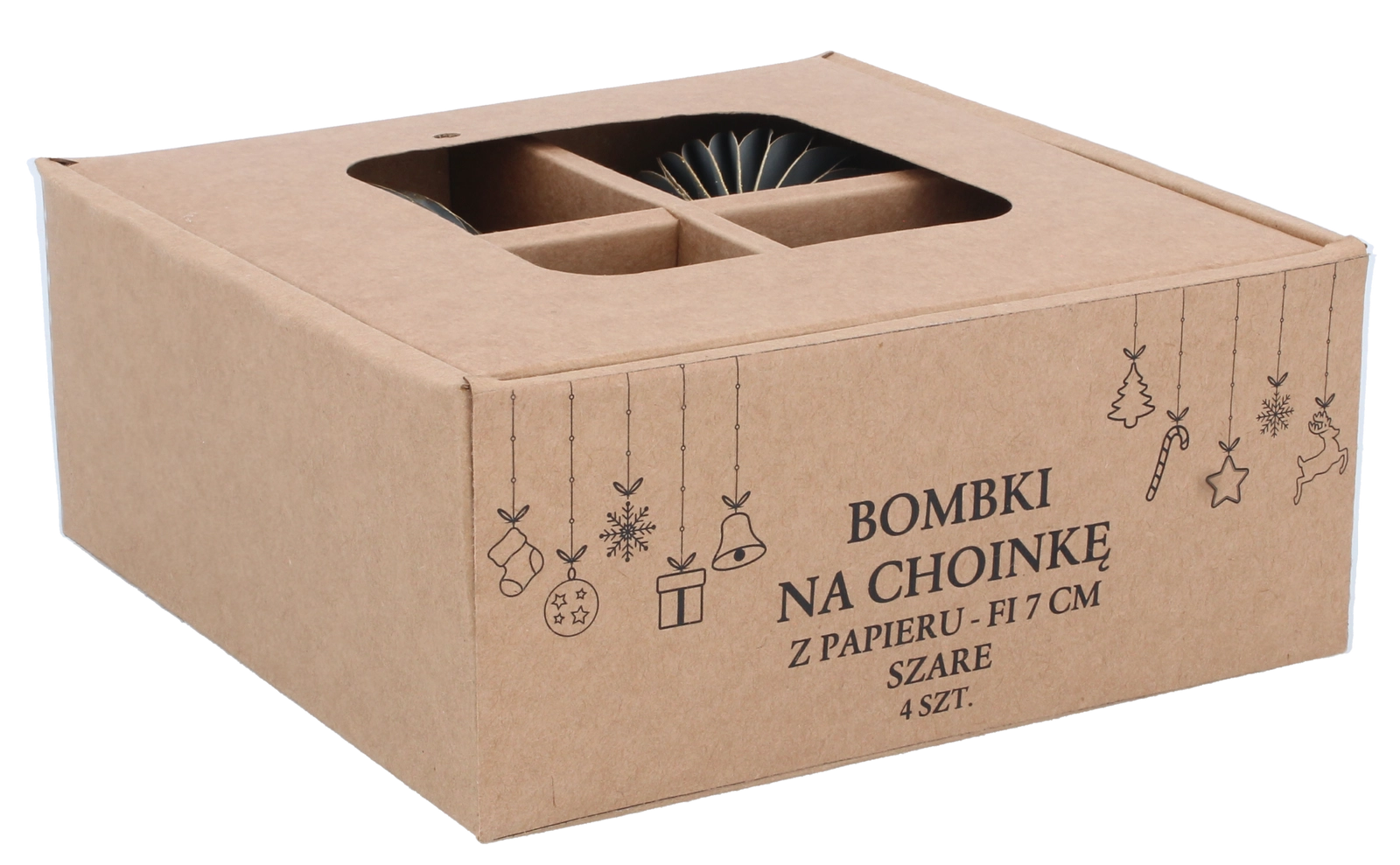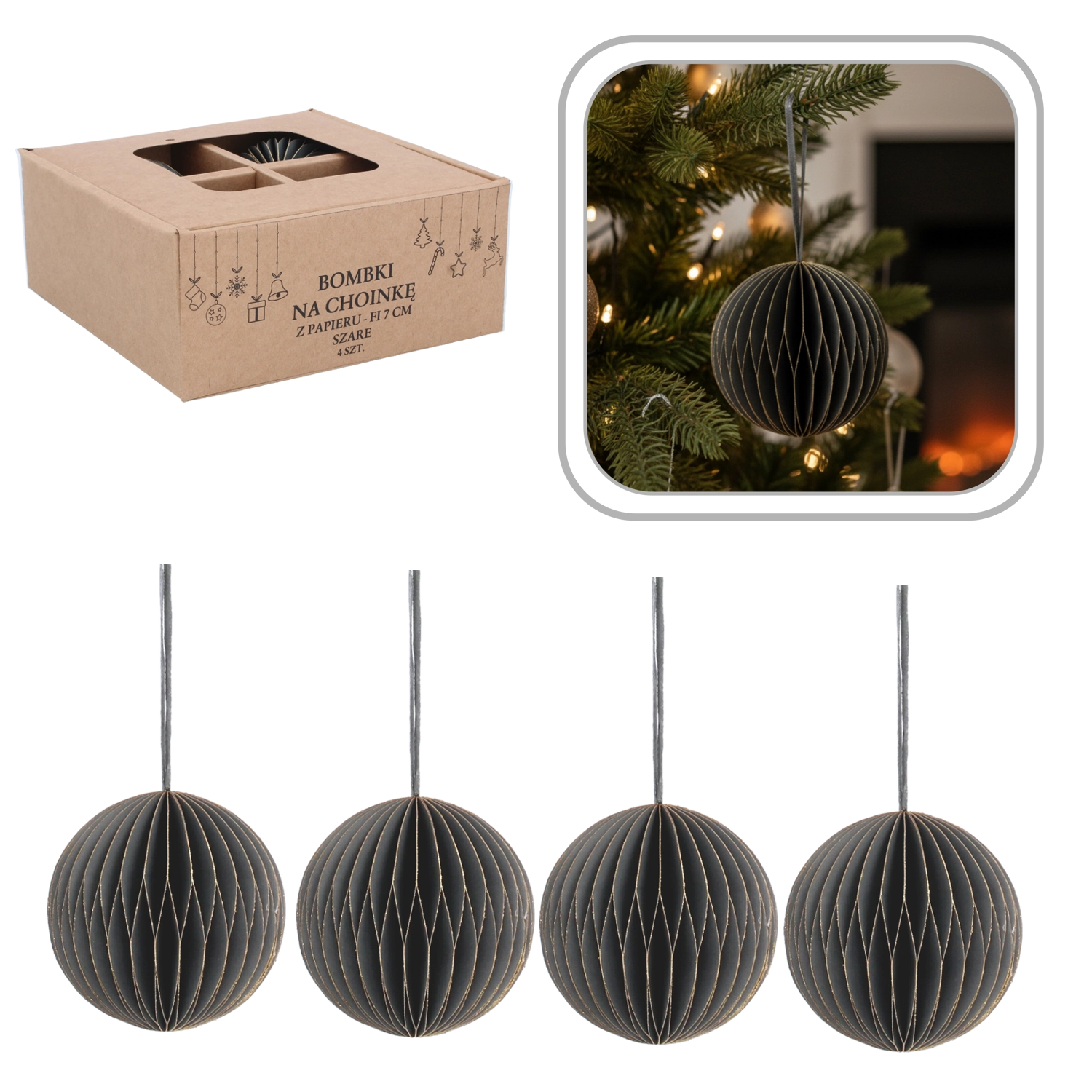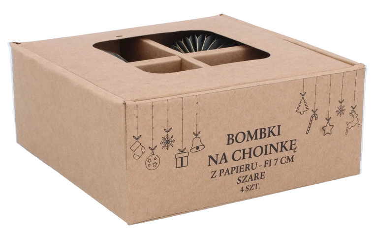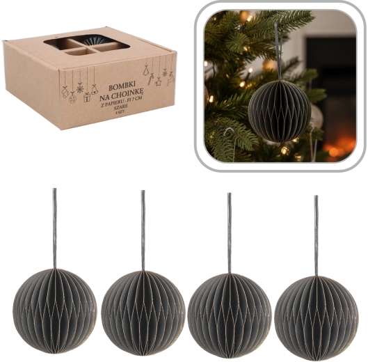 Elegáns, négy darabos papír karácsonyfadísz-készlet 7 cm átmérővel szürke színben, amely modern, harmonikus és biztonságos kiegészítője ünnepi dekorációdnak. Könnyűek, nem törékenyek és tartósak, a könnyű felakasztást szolgáló zsinórokkal a fára, koszorúkra és girlandokra. Minimalista dizájnjuk remekül kombinálható más díszekkel, és a belső térnek elegánsan kiegyensúlyozott megjelenést kölcsönöz.