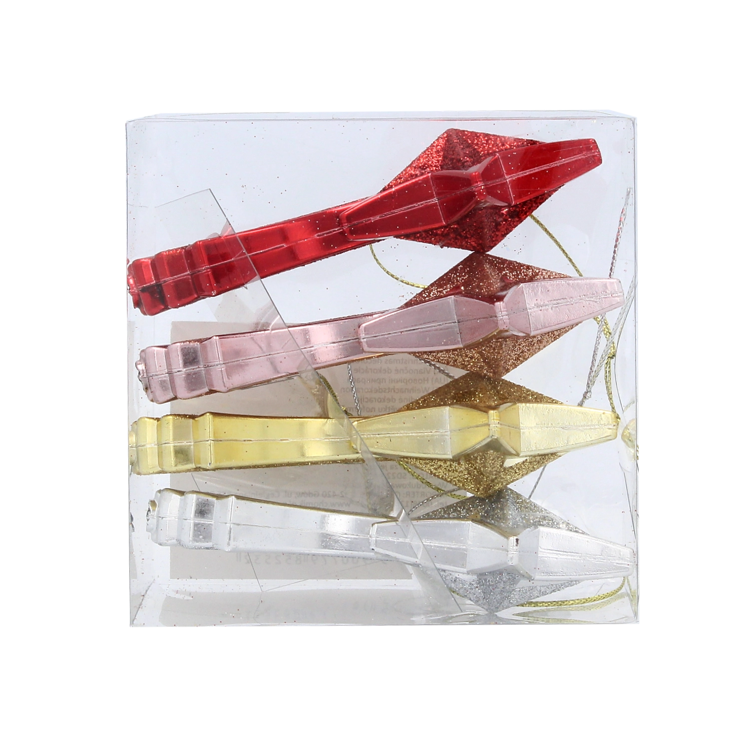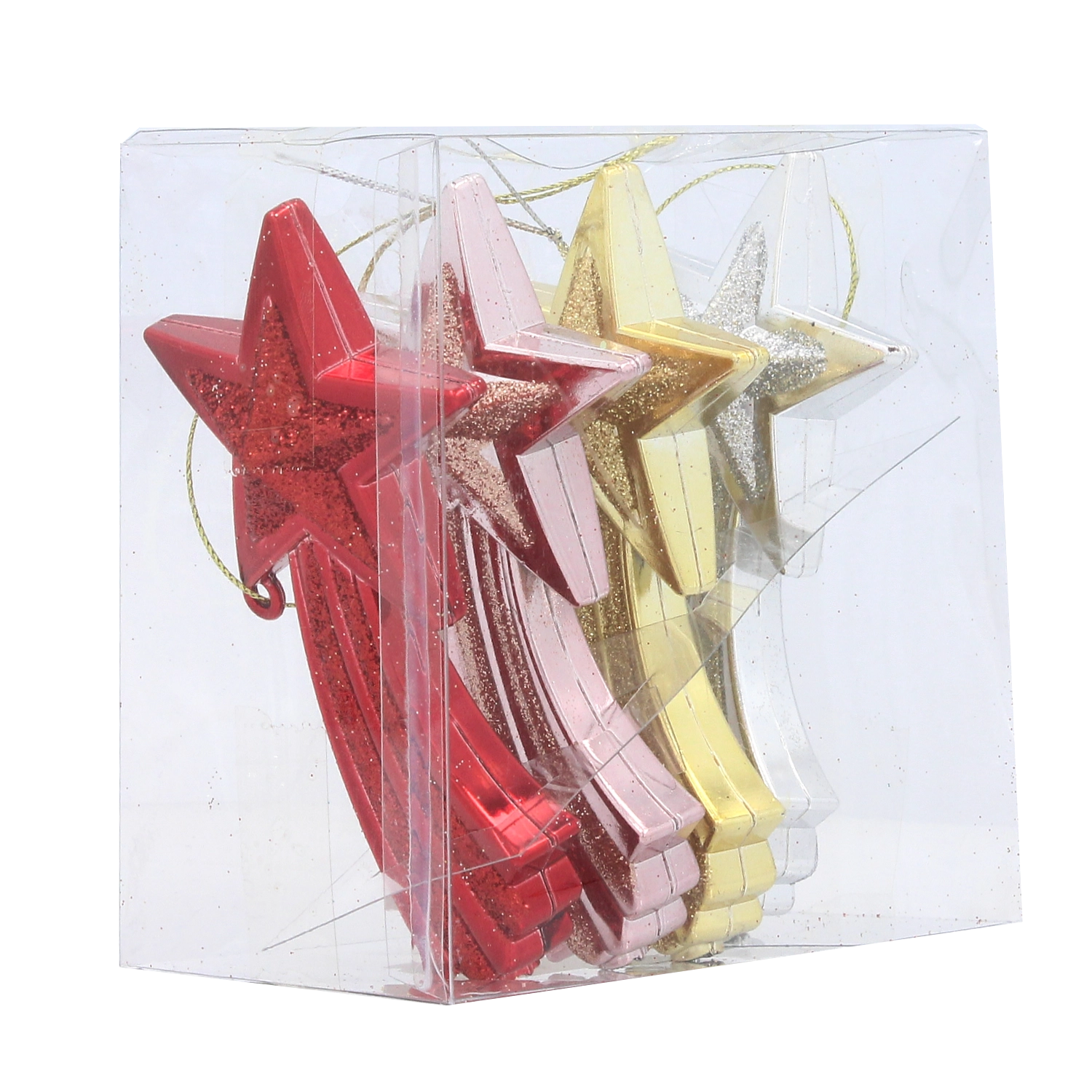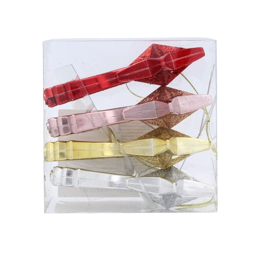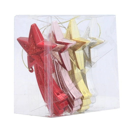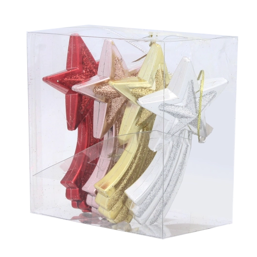Ez a dekoratív szett az ikonikus hullócsillag motívumot hozza el fényes és csillogó kivitelben, amely szépen veri vissza a karácsonyi égők fényét. A minőségi kidolgozásnak és az alacsony tömegnek köszönhetően a díszek könnyen felakaszthatók az ágakra, koszorúkra vagy dekoratív kampókra, és stabilan a helyükön maradnak.