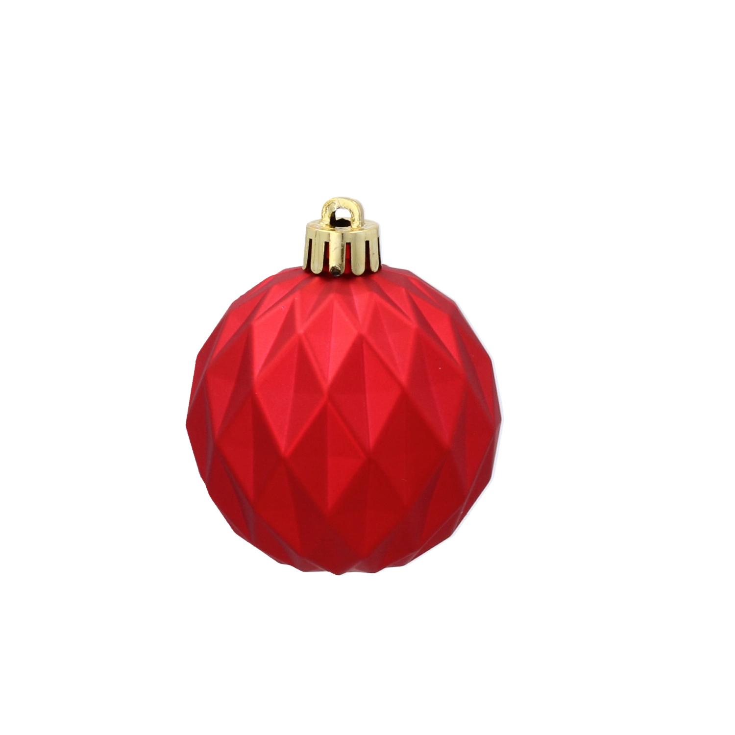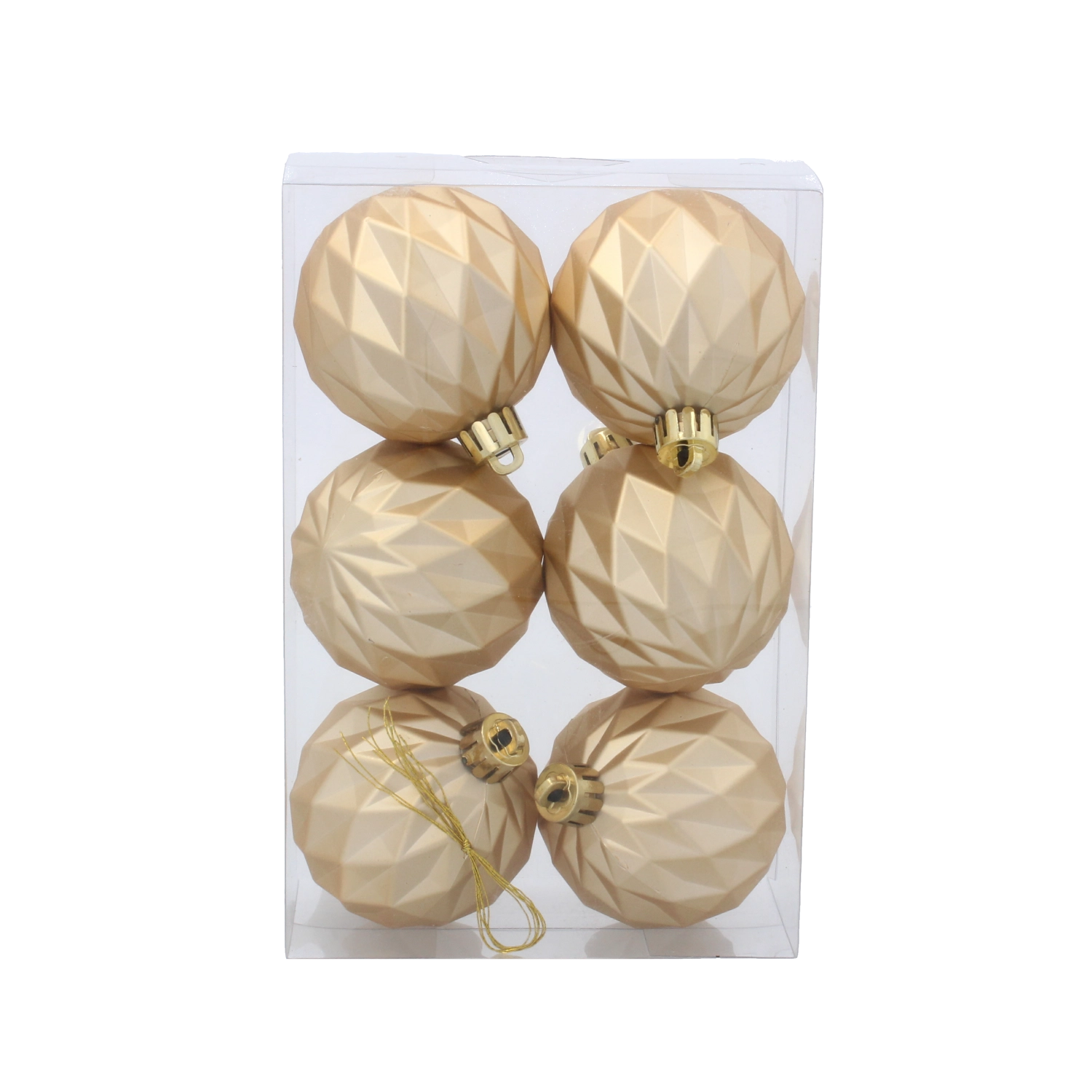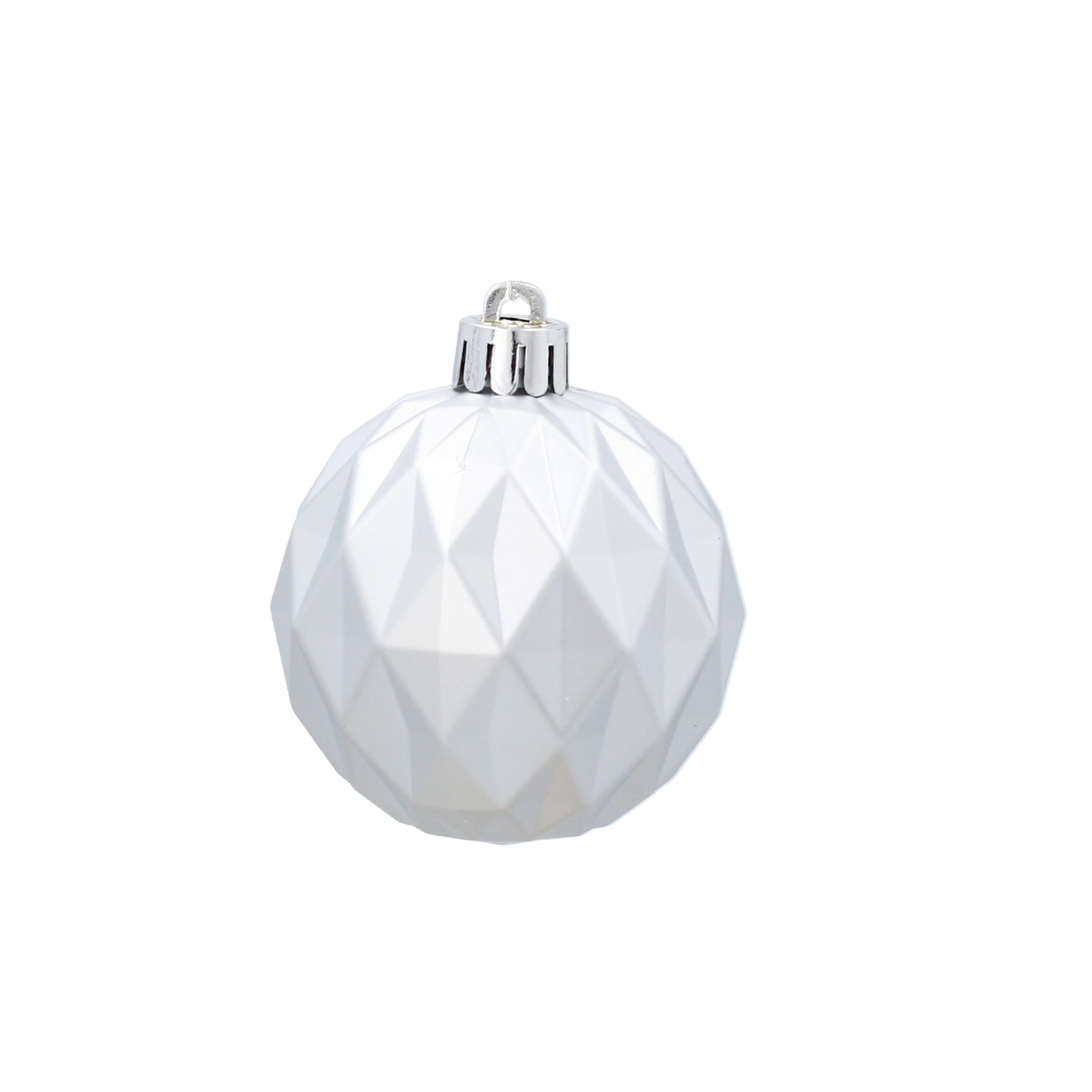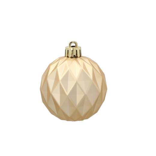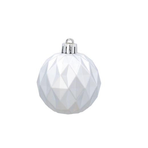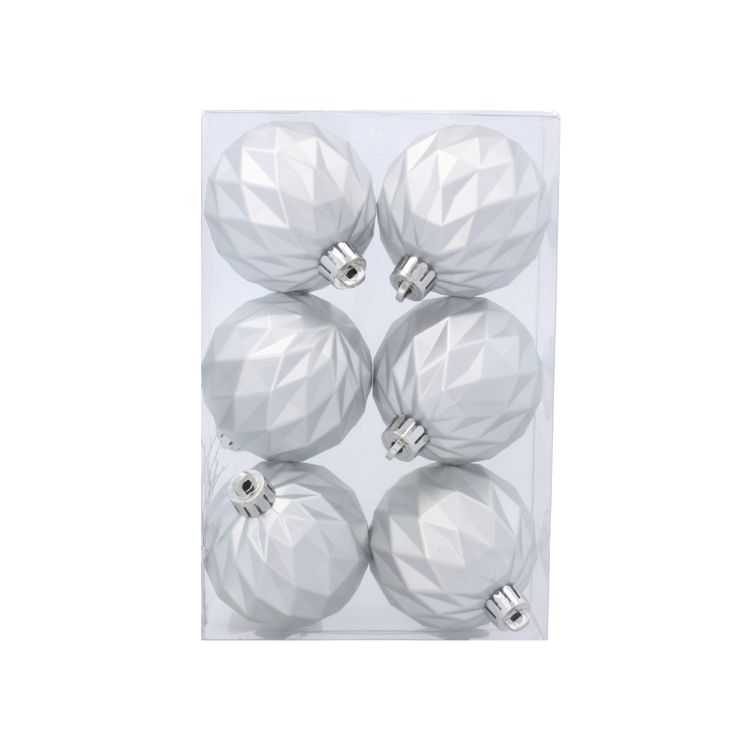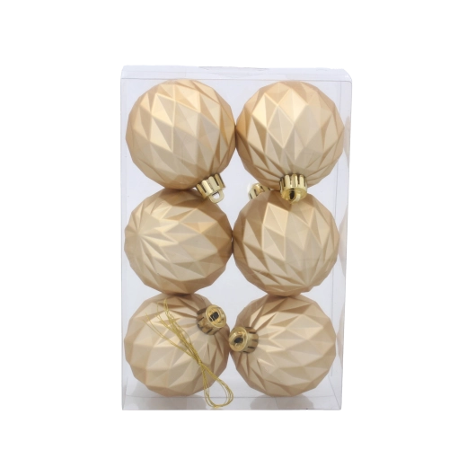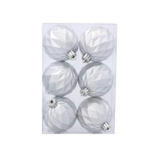 Ez a készlet 6 könnyű és tartós díszt tartalmaz gyémánt mintájú geometrikus felülettel, amely matt kivitelben is finom visszfényeket kelt. Törésbiztos anyagának köszönhetően ideális gyermekek és háziállatok mellé, és kiválóan alkalmas karácsonyfa, koszorúk vagy girlandok díszítésére.