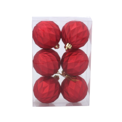 Adj modern lendületet a fádnak hat darab, 6 cm átmérőjű karácsonyi gömbbel. A könnyű, törésbiztos műanyag és a matt geometrikus dizájn garantálja az elegáns megjelenést, az egyszerű felakasztást és a hosszú élettartamot. A piros, arany és ezüst stílusos színkombináció remekül illik a legtöbb ünnepi dekorációhoz.