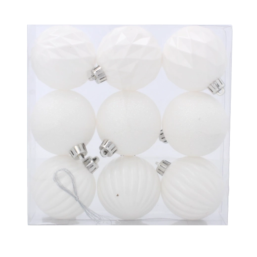 Elegáns, kilenc darabos fehér karácsonyi gömbkészlet 6 cm átmérővel, amely ünnepi ragyogást kölcsönöz a fának és az otthonodnak. A matt, fényes és csillogó felületek kombinációja harmonikus összhatást teremt, amely könnyen összehangolható más dekorációkkal. A könnyű és tartós műanyag biztonságos és törhetetlen használatot biztosít gyermekekkel és háziállatokkal élő otthonokban is.