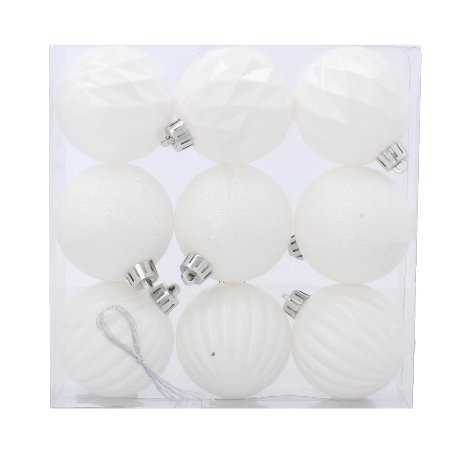 Adj tiszta és időtlen megjelenést karácsonyi dekorációdnak. Ez a 9 fehér díszből álló készlet különböző felületkezeléseket ötvöz – mattot, fényest és csillogót –, amelyek gazdag és kiegyensúlyozott hatást keltenek a fán. A semleges fehér szín remekül illik természetes és színes díszítésekhez egyaránt.