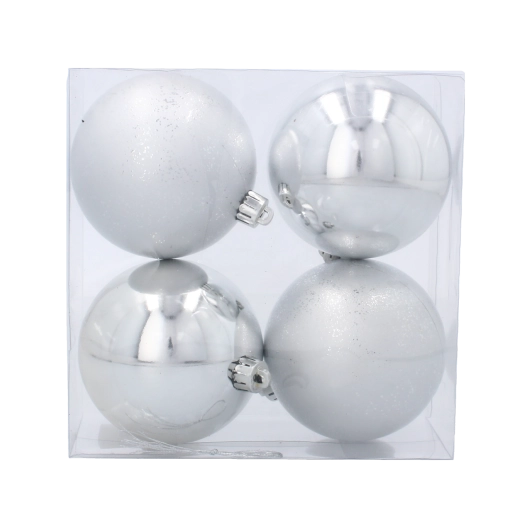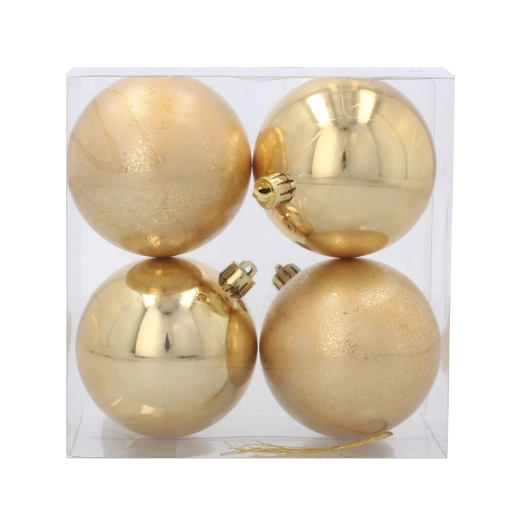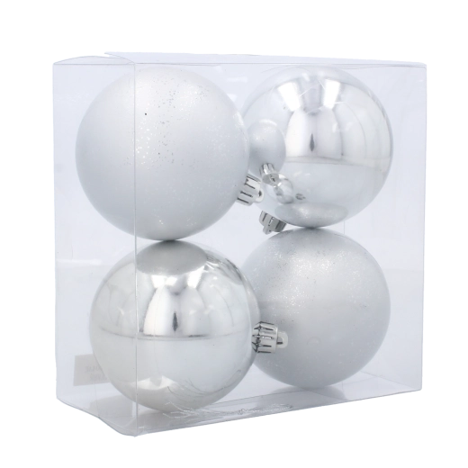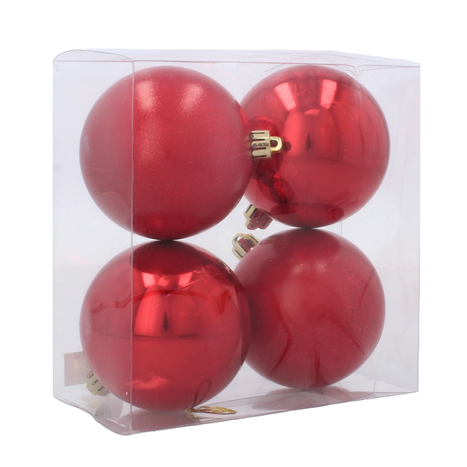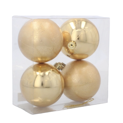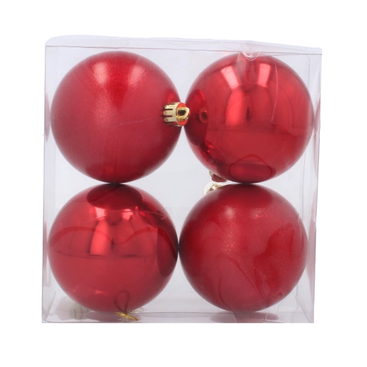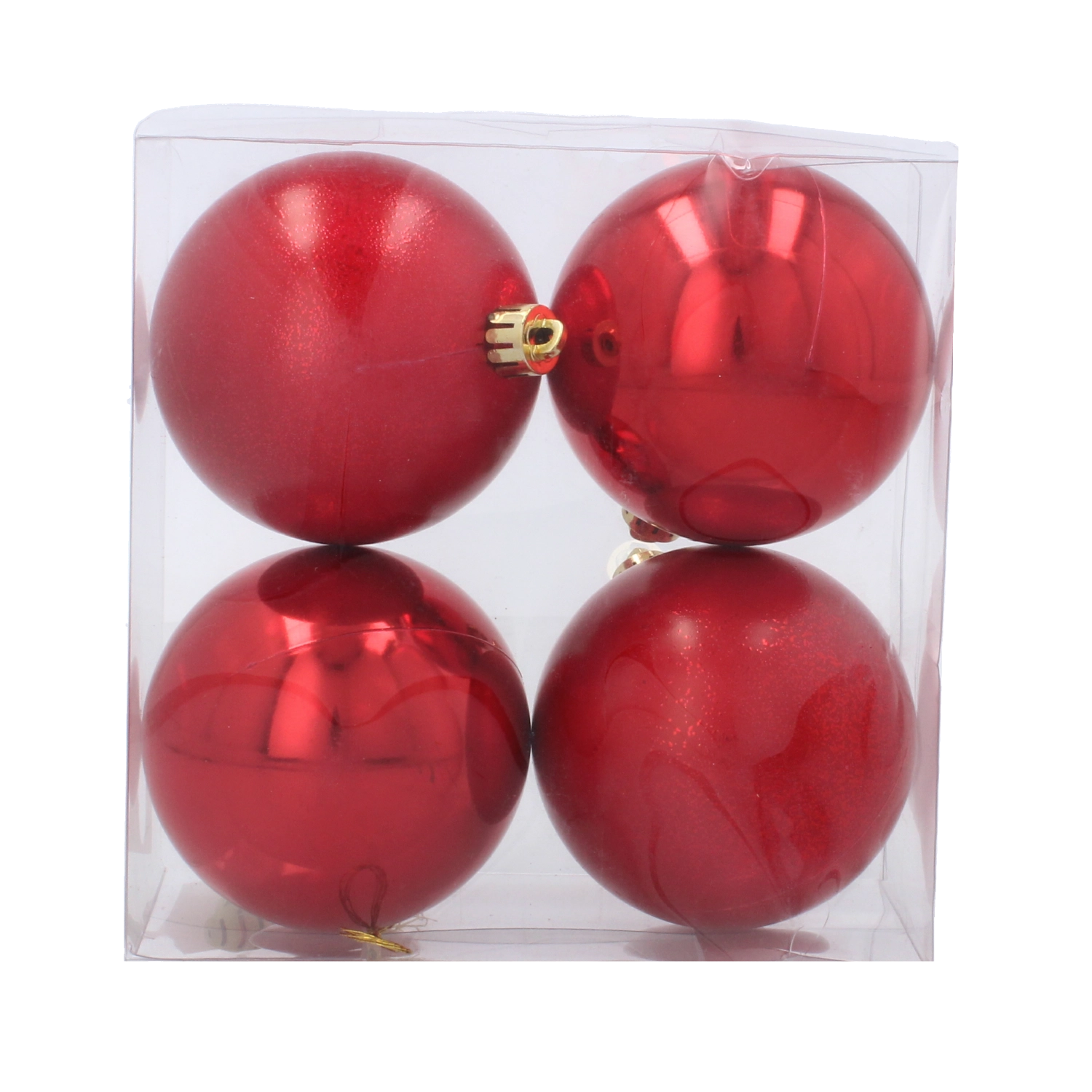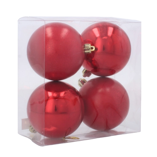 Vigyen otthonába hagyományos ünnepi hangulatot négy darab, 8 cm átmérőjű karácsonyi gömb szettjével piros, arany és ezüst színekben. A tartós műanyag biztonságos és hosszú élettartamú használatot biztosít, míg a fényes felület és az élénk színek elegáns akcentust adnak a fának. Minden dísz akasztószalaggal a könnyű felhelyezéshez készül.