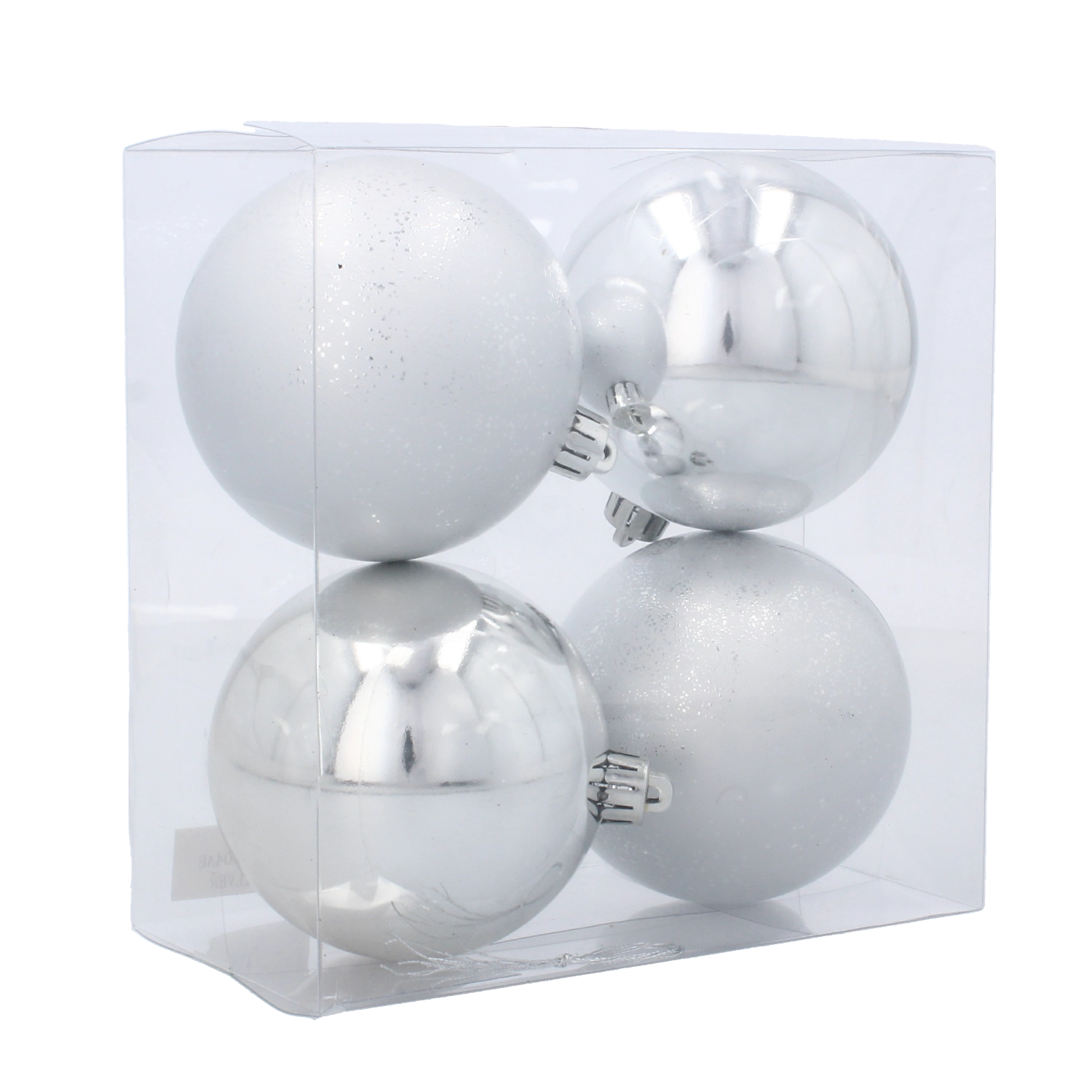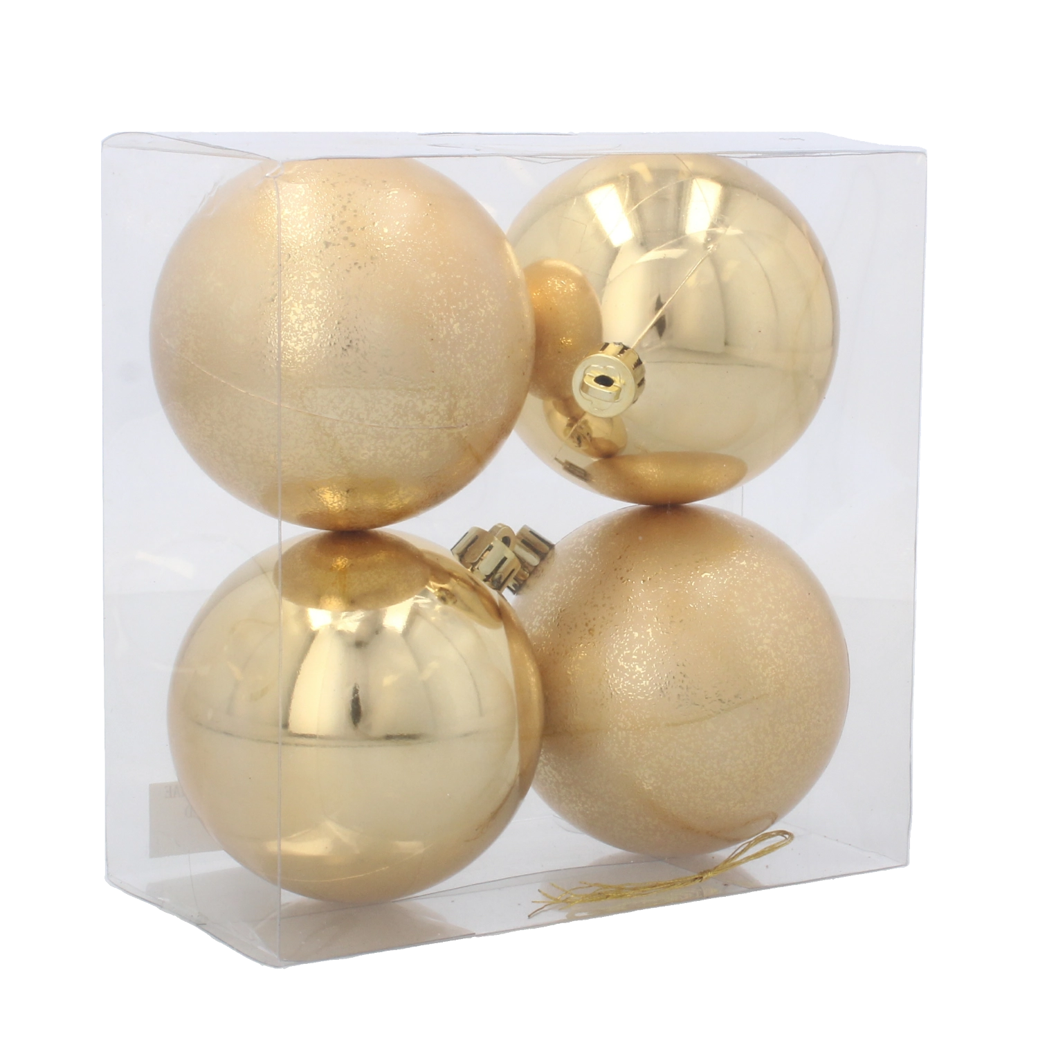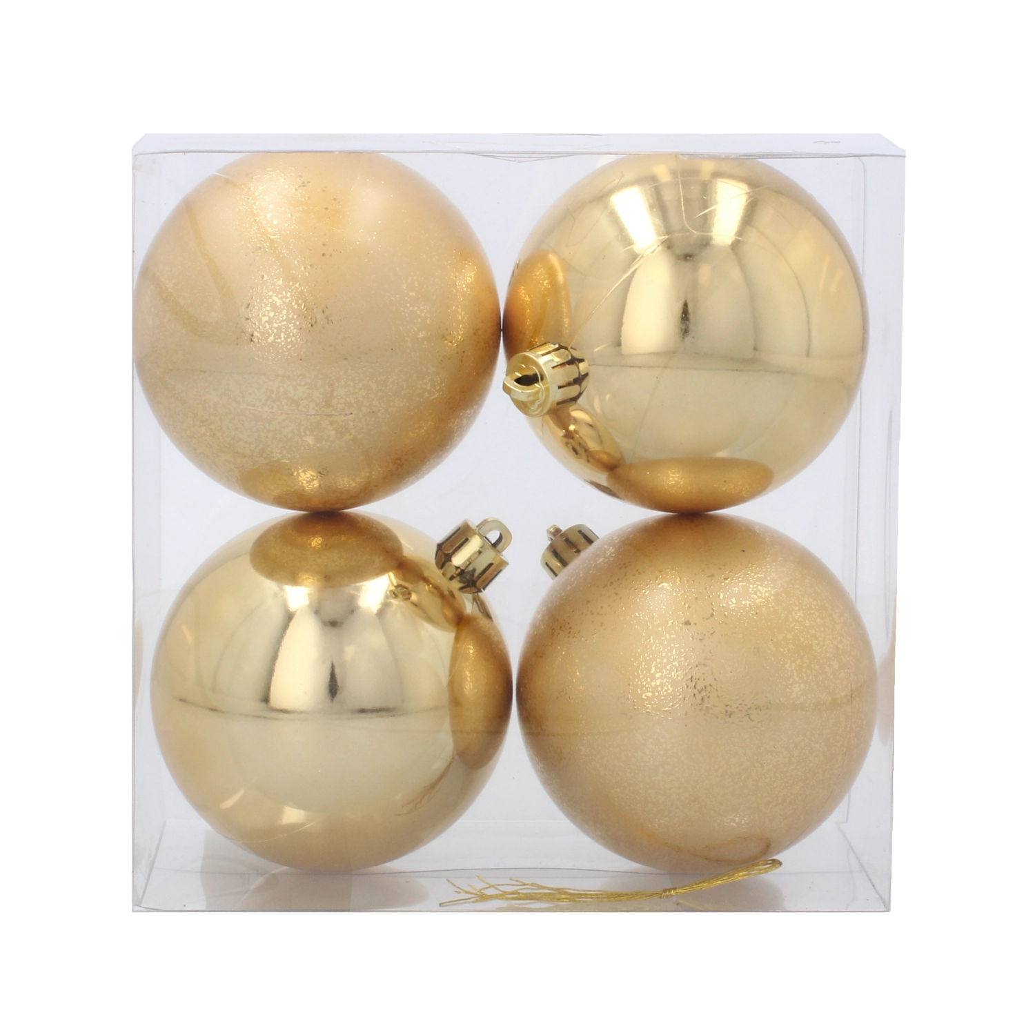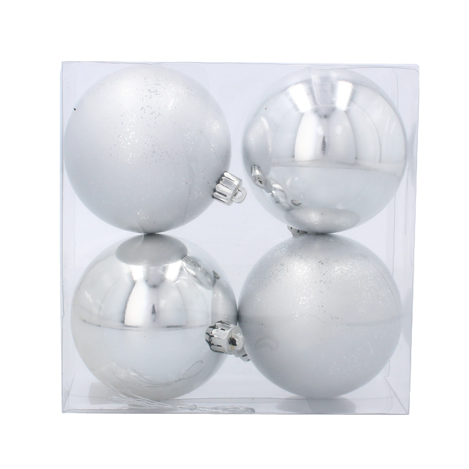Vigyen otthonába hagyományos ünnepi hangulatot négy darab, 8 cm átmérőjű karácsonyi gömb szettjével piros, arany és ezüst színekben. A tartós műanyag biztonságos és hosszú élettartamú használatot biztosít, míg a fényes felület és az élénk színek elegáns akcentust adnak a fának. Minden dísz akasztószalaggal a könnyű felhelyezéshez készül.