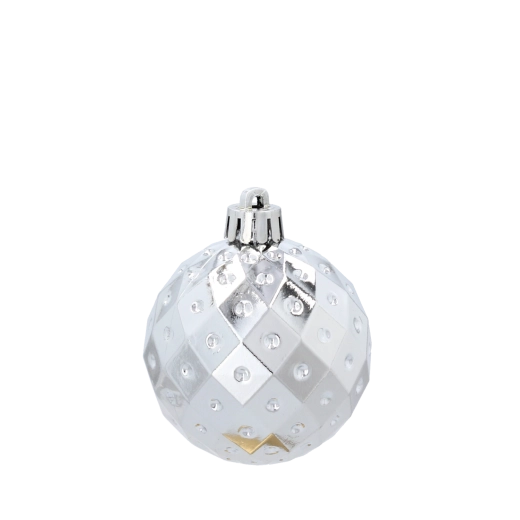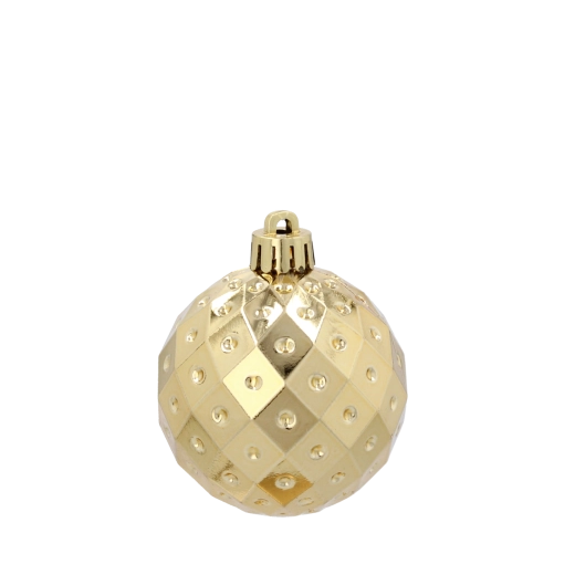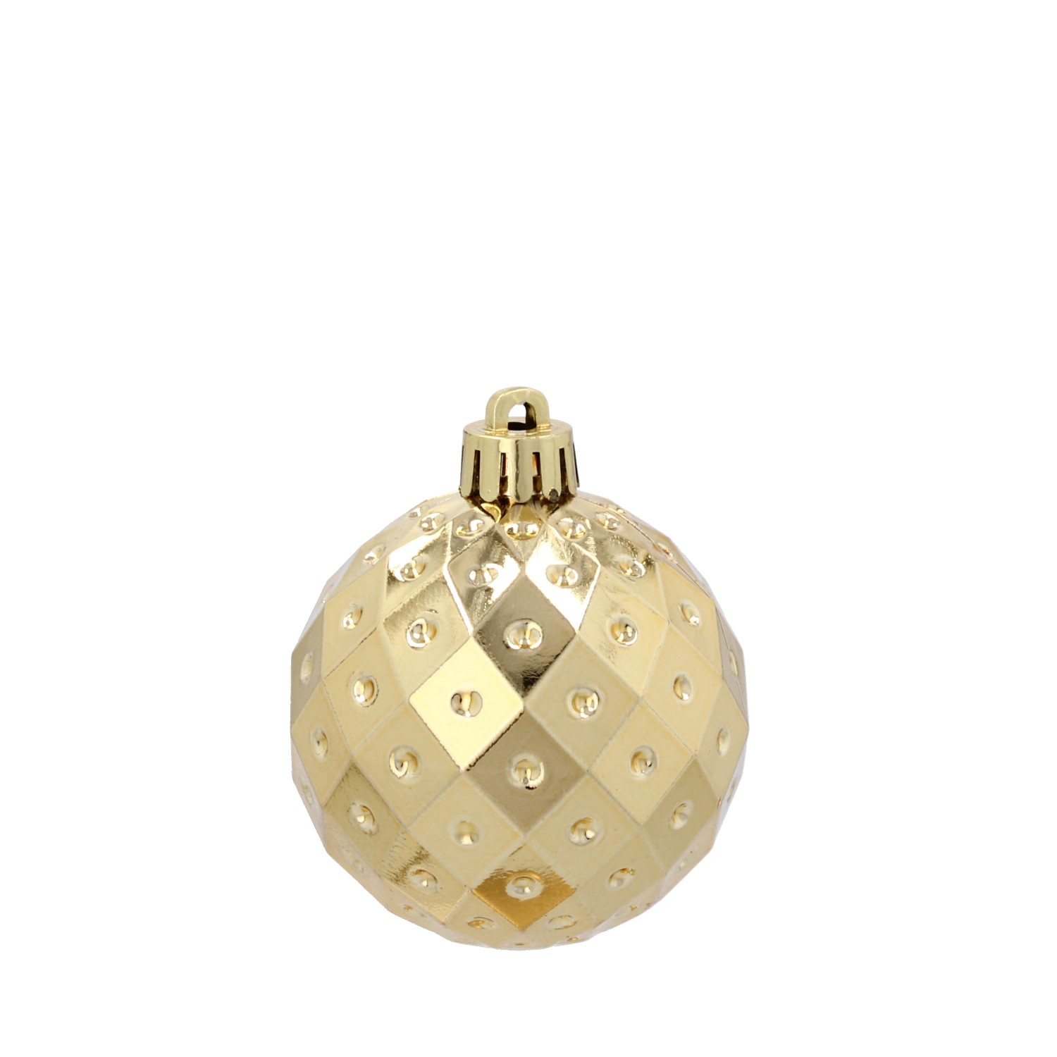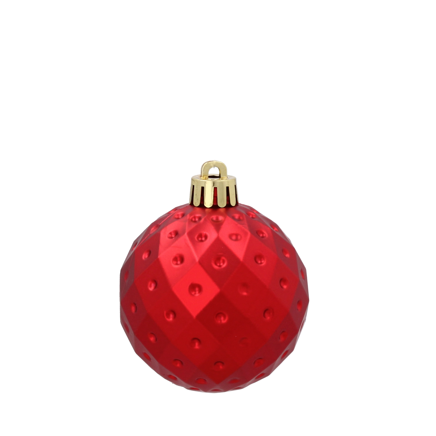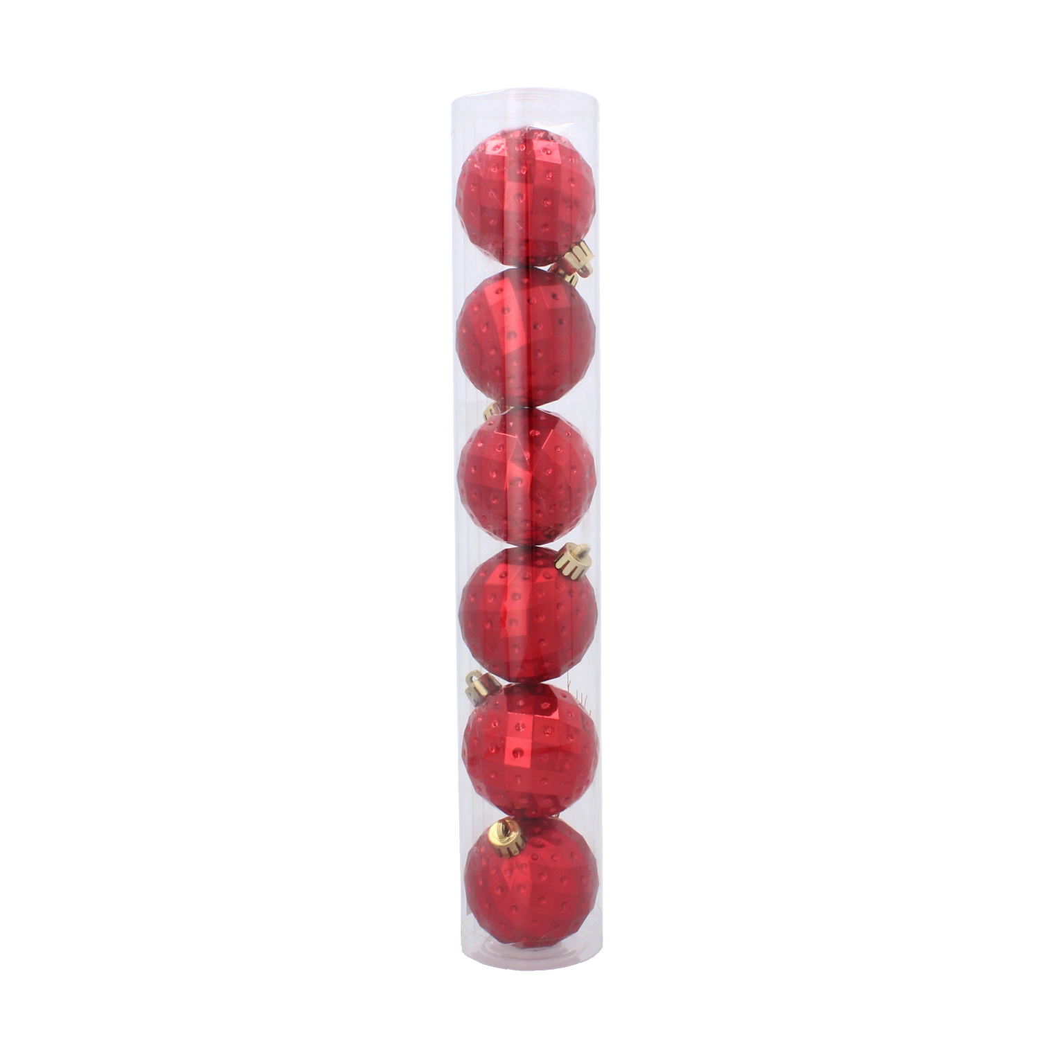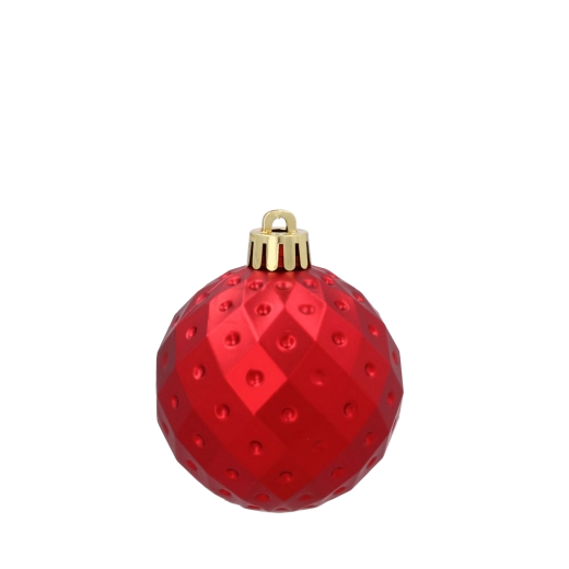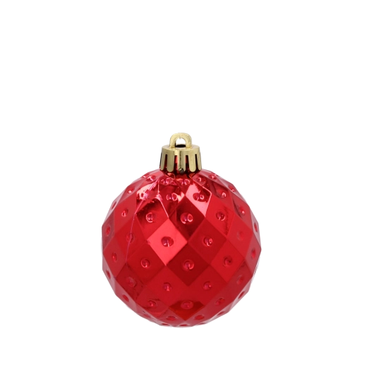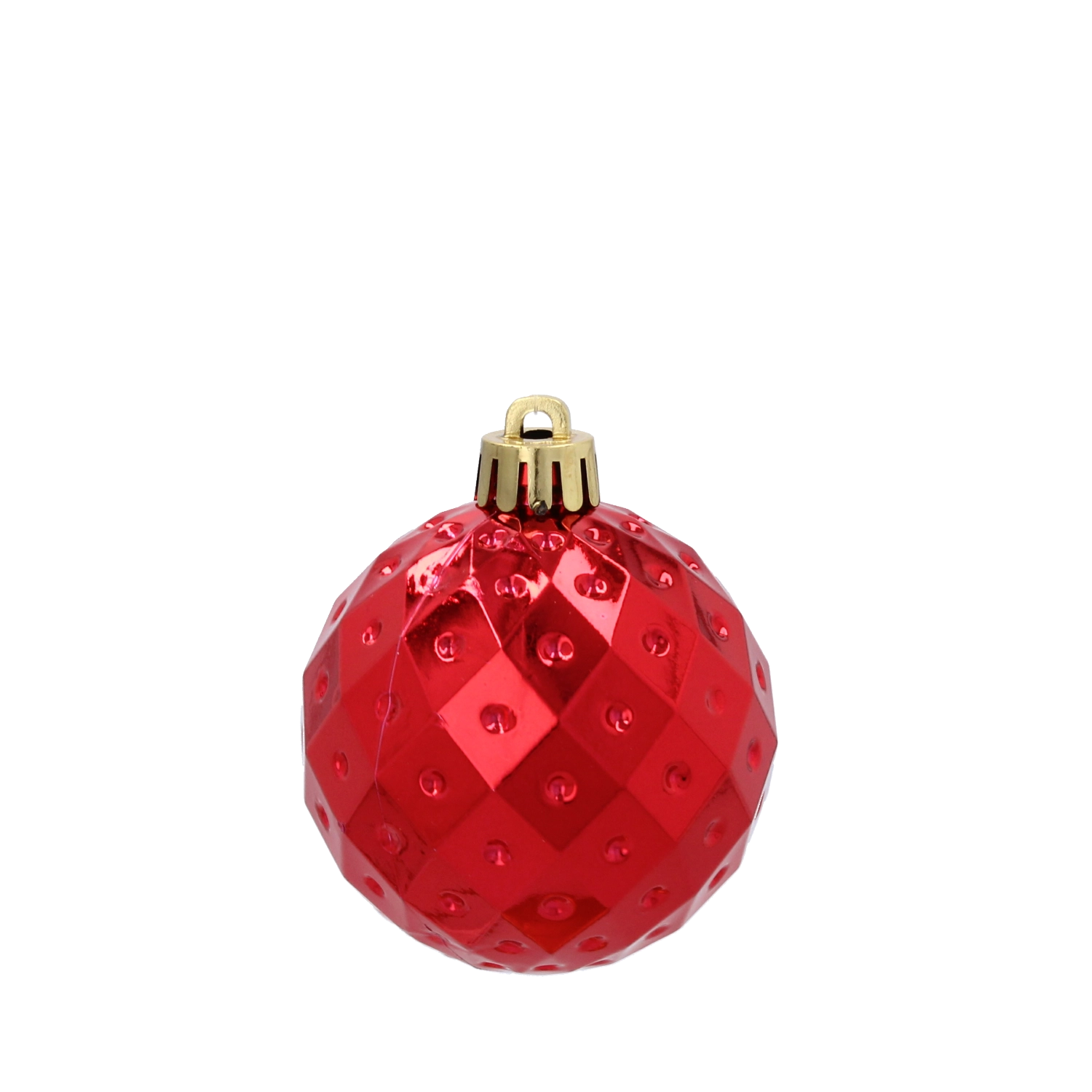 Elegáns, hatdarabos, 6 cm átmérőjű karácsonyi gömb szett piros, arany és ezüst színkombinációban, amely beragyogja bármelyik fát. A díszek törhetetlen műanyagból készülnek a biztonságos használatért, modern geometrikus domborítással rendelkeznek, és praktikus, átlátszó tubusban érkeznek akasztózsinórokkal az egyszerű felakasztáshoz.