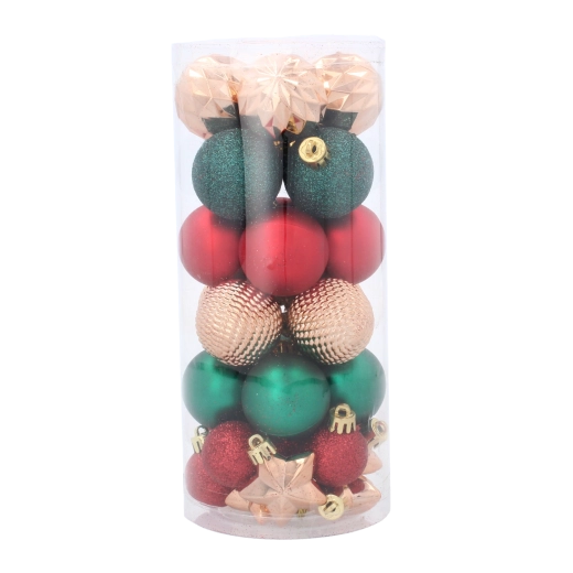 Teremtsen otthonában harmonikus és ünnepi hangulatot az elegáns, 32 darabos karácsonyi dísz készlettel, 3–4 cm átmérőben. A tartós műanyag hosszú élettartamot és biztonságos használatot garantál, míg az arany- és ezüstszínű zsinórok megkönnyítik a felakasztást. A hagyományos piros, arany és zöld színkombináció remekül illik a fára, koszorúkra és más dekorációkhoz.