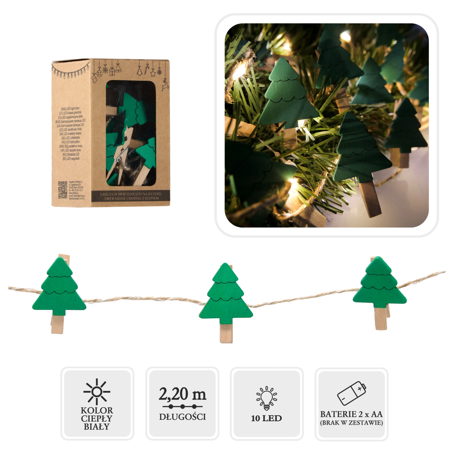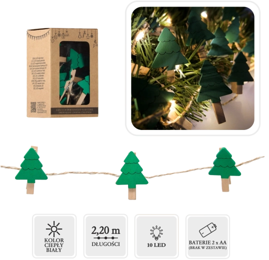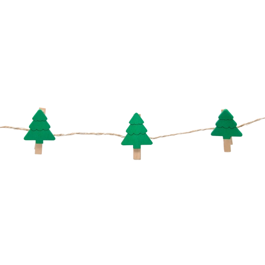 Ez a dekoratív LED fényfüzér ötvözi a fényt és a funkcionalitást. A karácsonyfát formázó fa csipeszekkel könnyedén kiállíthatod a fényképeket, képeslapokat, névjegyeket vagy apró díszeket. A meleg fehér LED-ek meghitt fényt adnak, amely kiemeli a karácsony varázsát a nappaliban, a gyerekszobában vagy az ünnepi asztalon.