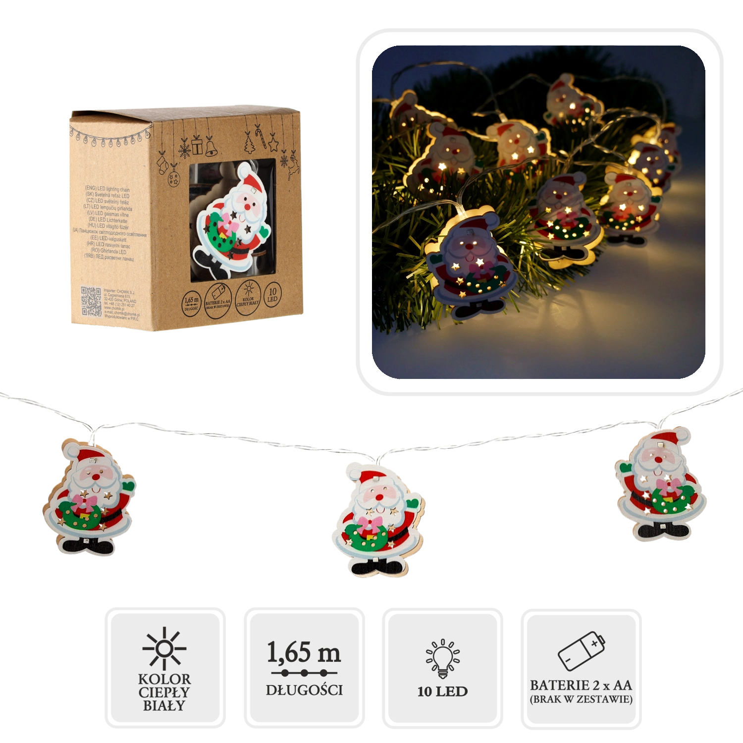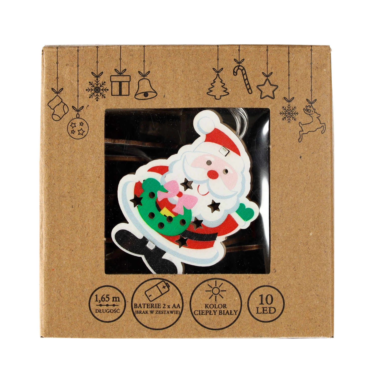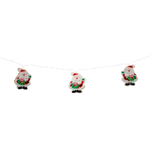 Stílusos fa fényfüzér MIKULÁSSAL, ideális beltéri karácsonyi dekorációhoz. A meleg fehér fény barátságos és otthonos, miközben a könnyű kivitel és a vékony vezeték megkönnyíti az elrendezést a karácsonyfán, koszorún, korláton vagy polcokon.