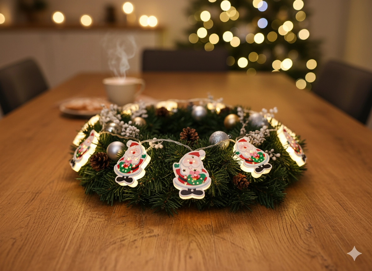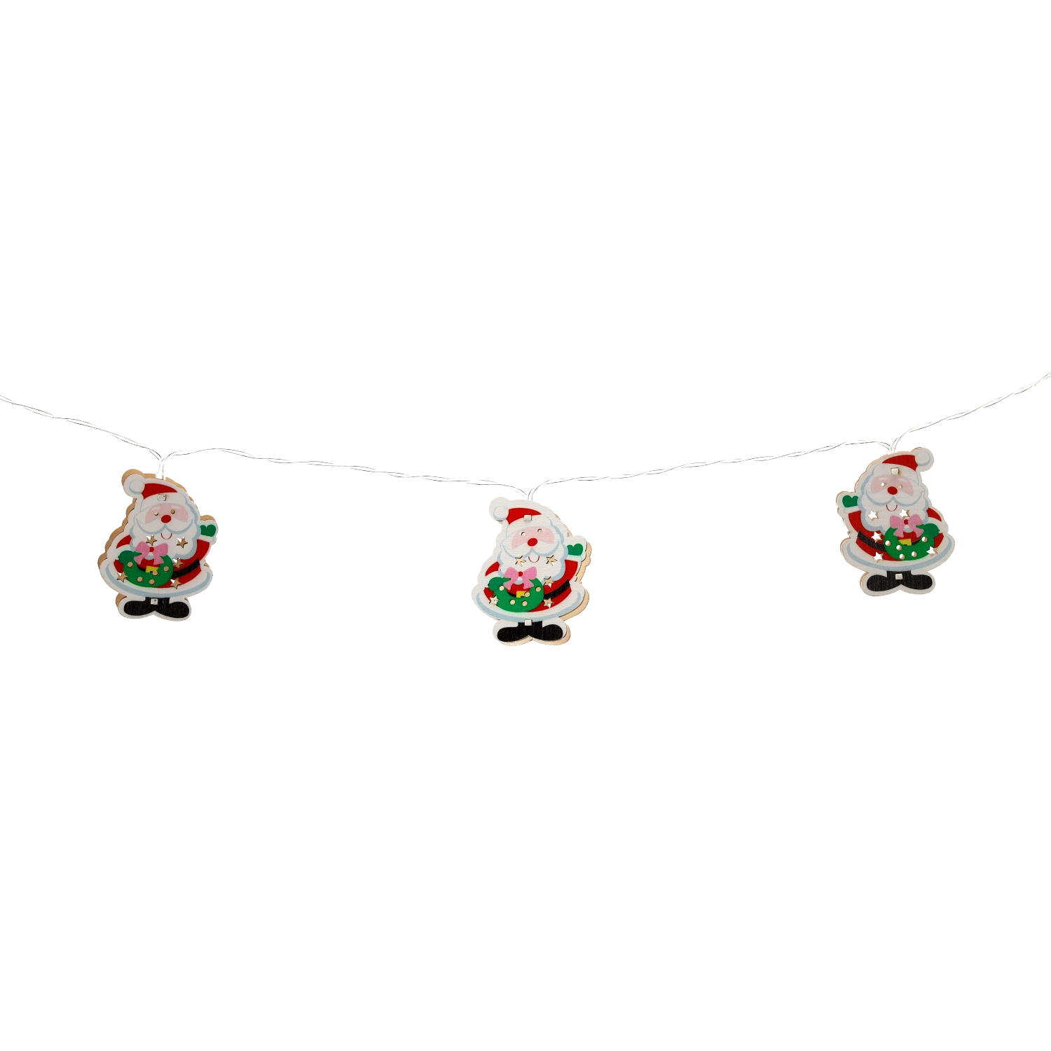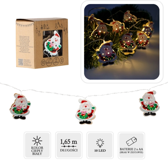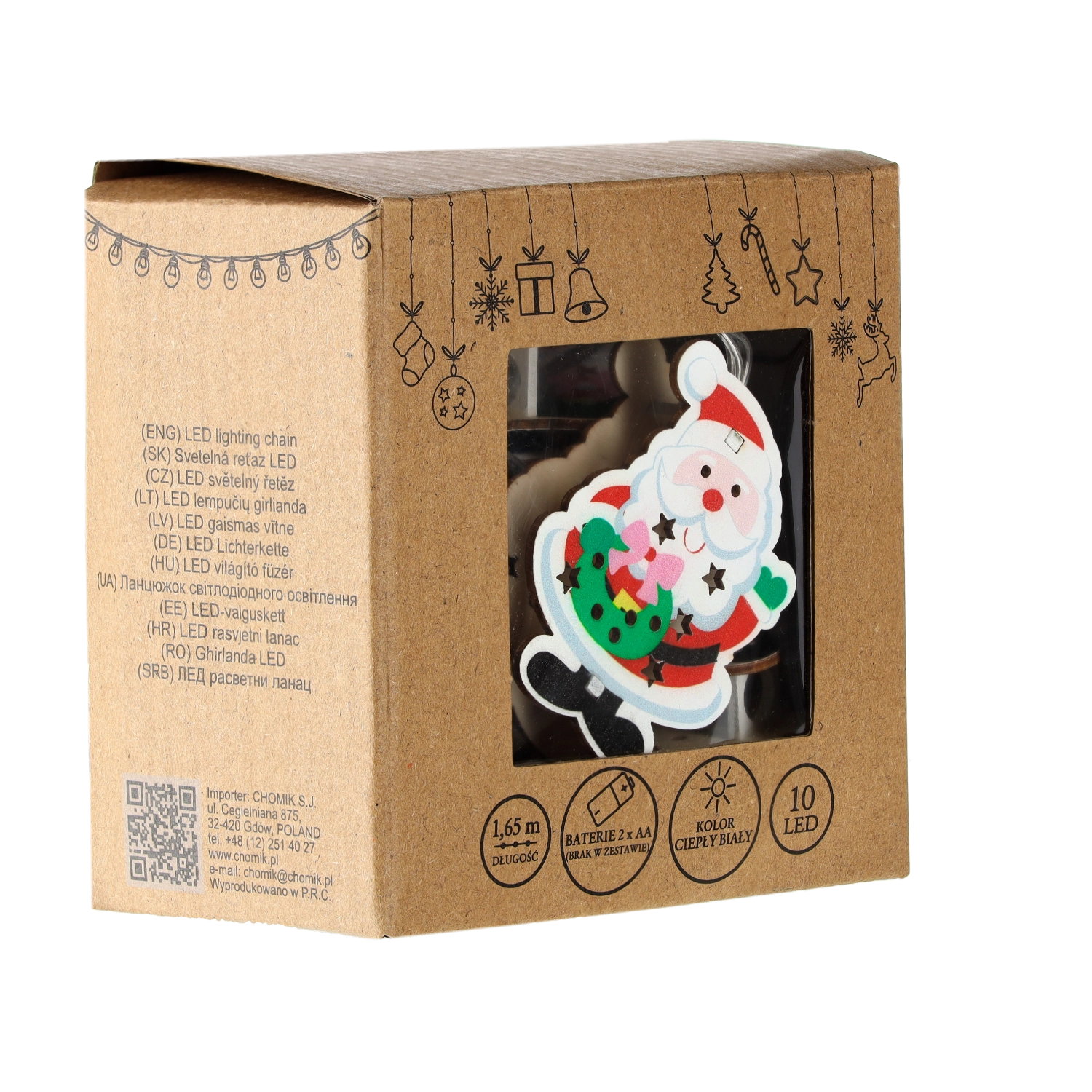 Stílusos fa fényfüzér MIKULÁSSAL, ideális beltéri karácsonyi dekorációhoz. A meleg fehér fény barátságos és otthonos, miközben a könnyű kivitel és a vékony vezeték megkönnyíti az elrendezést a karácsonyfán, koszorún, korláton vagy polcokon.