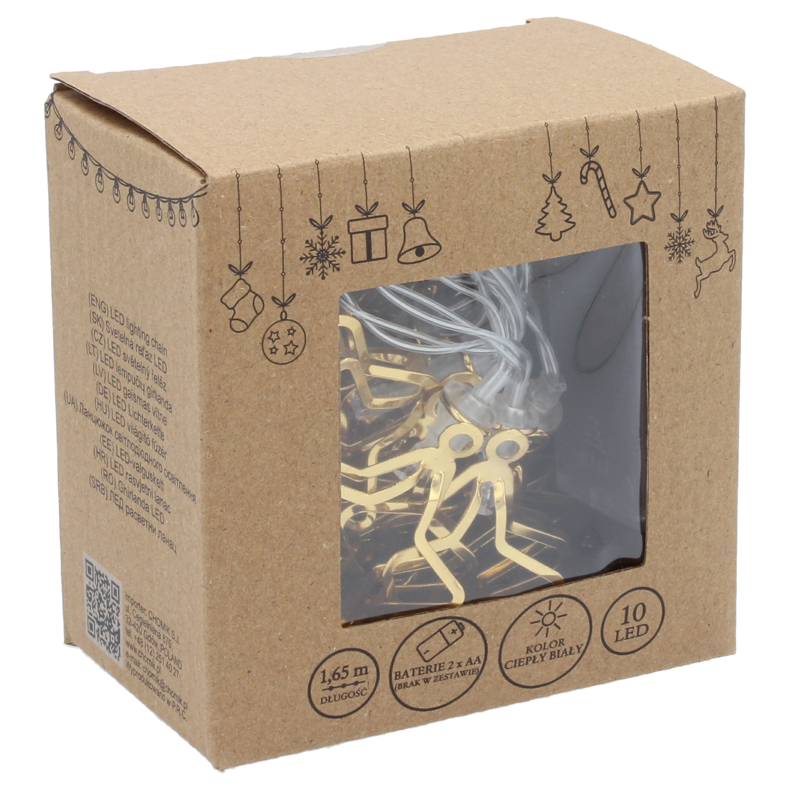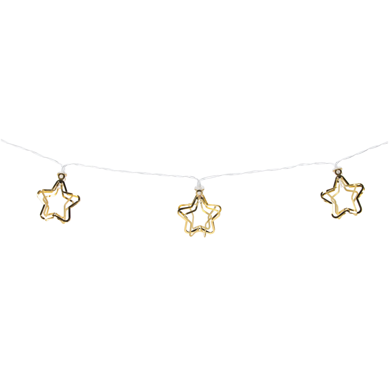 Vigyen karácsonyi varázst otthonába a stílusos LED füzérrel, 3D arany fém csillagokkal. A meleg fehér fény meghitt hangulatot teremt, és a 2× AA elemes tápellátásnak köszönhetően kábelek nélkül bárhová elhelyezheti – asztalra, komódra, kandallóra vagy koszorúra.