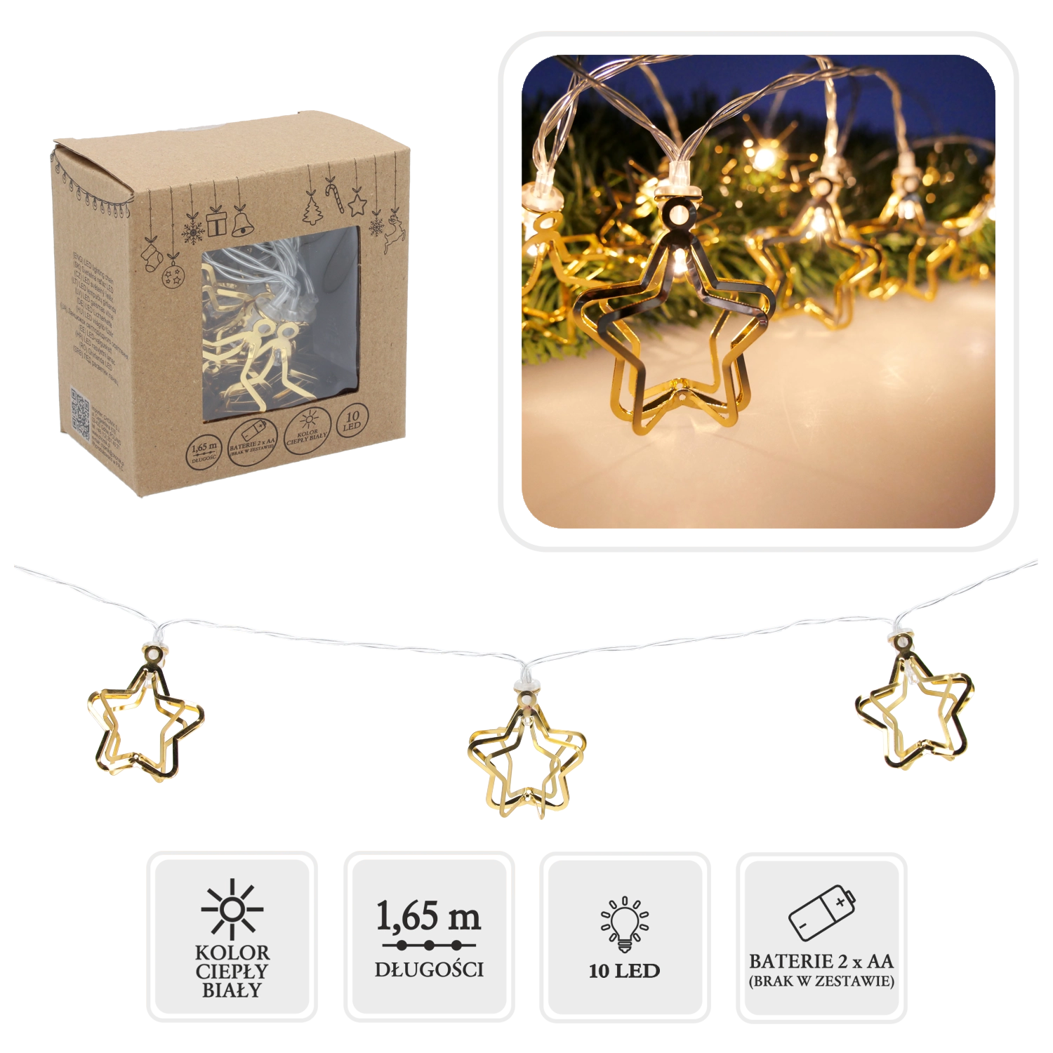Dekoratív LED füzér 10 meleg fényű diódával, áttetsző, arany hatású csillagokban – ideális ünnepi díszítéshez és egész éves lakásdekorhoz is. A fém 3D csillagok elegánsak, és ragyogást adnak minden elrendezésnek – a glamour stílustól a bohóig.
