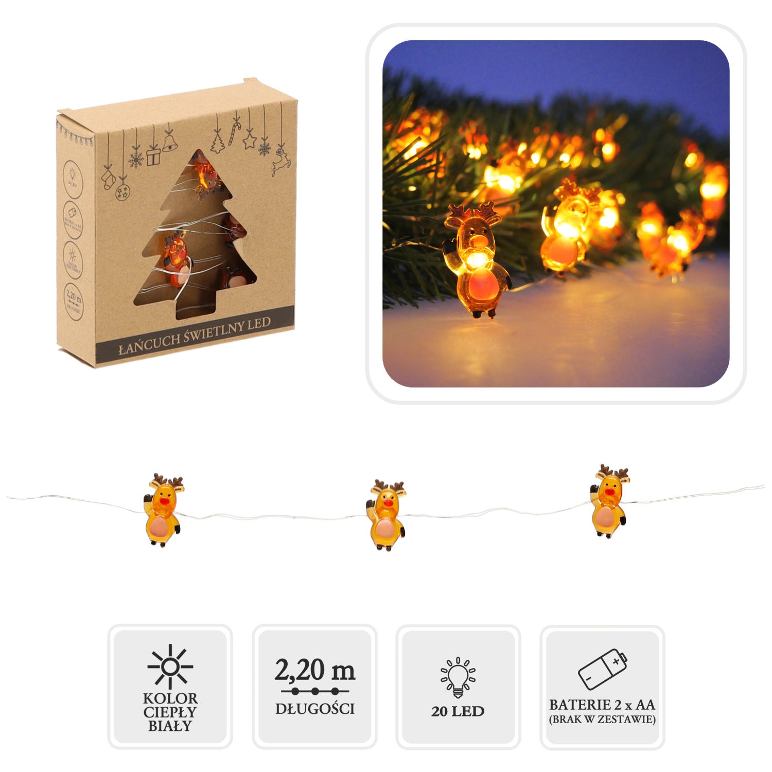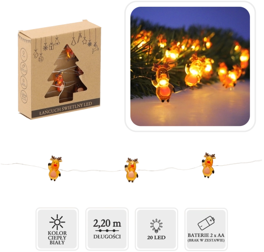 Varázsold otthonodba a karácsony hangulatát a bájos őzikékkel díszített fényfüzérrel. A 20 meleg fényű LED otthonos hangulatot teremt, a rugalmas drót könnyen körbetekerhető a dekorációkon, a 2× AA elemes tápellátás pedig kábelek nélkül biztosítja az elhelyezést. Ideális ablakra, kandallópárkányra, koszorúra vagy gyerekszobába.