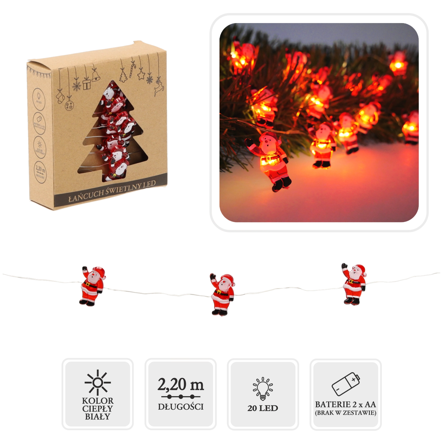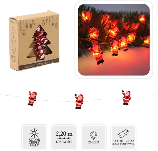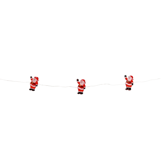 A SANTÁS karácsonyi fényfüzér játékos dekoráció, amely azonnal kellemes, meleg hangulatot visz a belső terekbe. Minden LED-et egy aranyos Mikulás-motívum borít, amely szépen mutat a fenyőágakon, a kandallópárkányon és a gyerekszobában is.