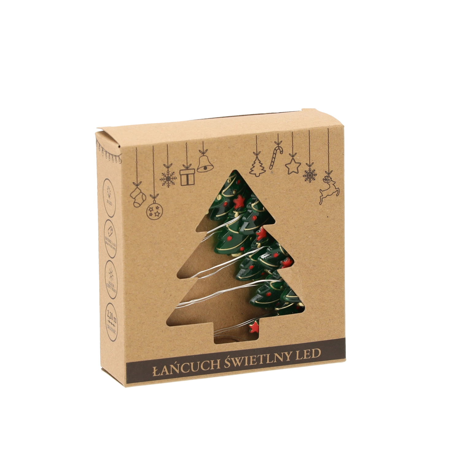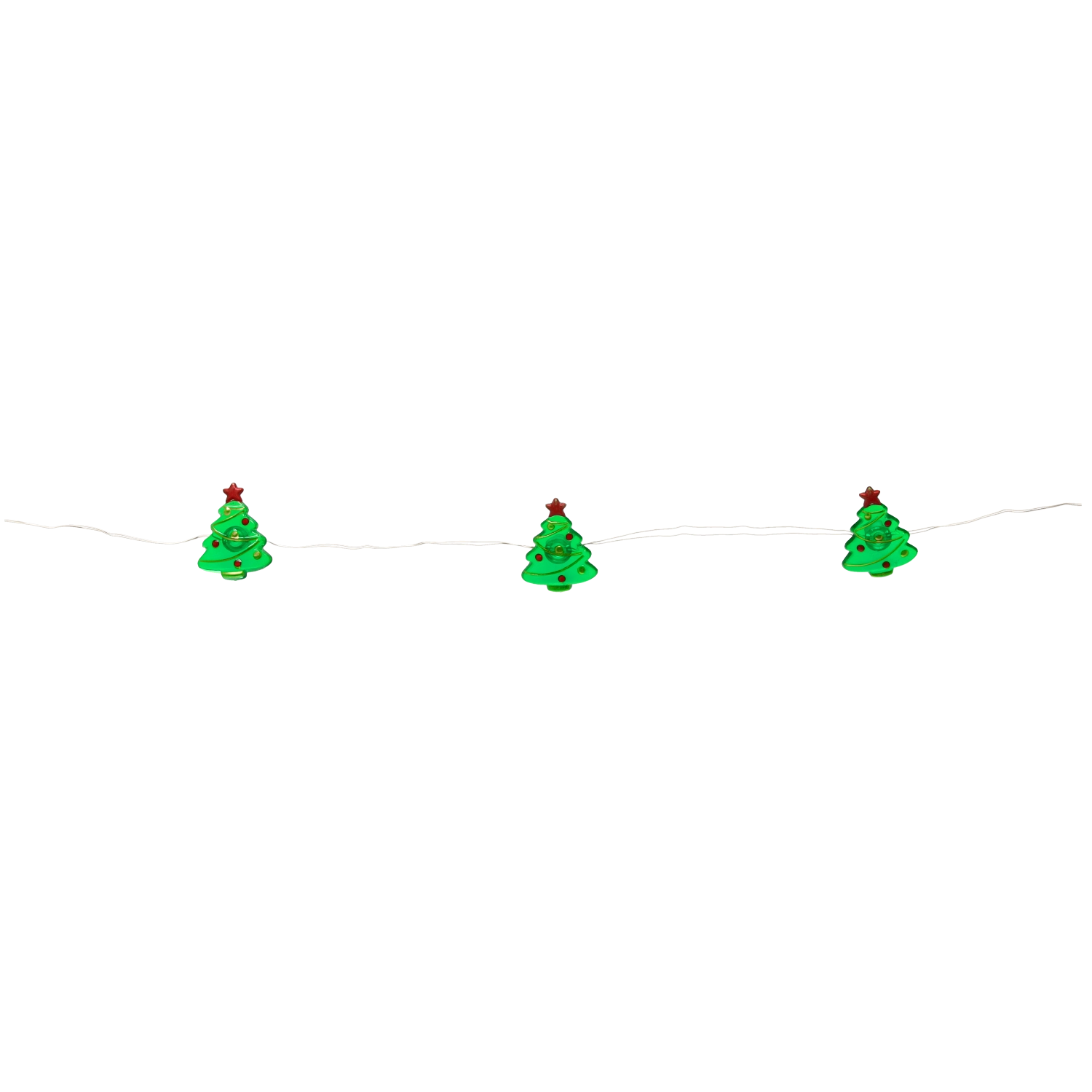 Apró, karácsonyfát formázó díszek a vékony, átlátszó kábelen elegáns hatást keltenek, és nem zavarják az összképet.