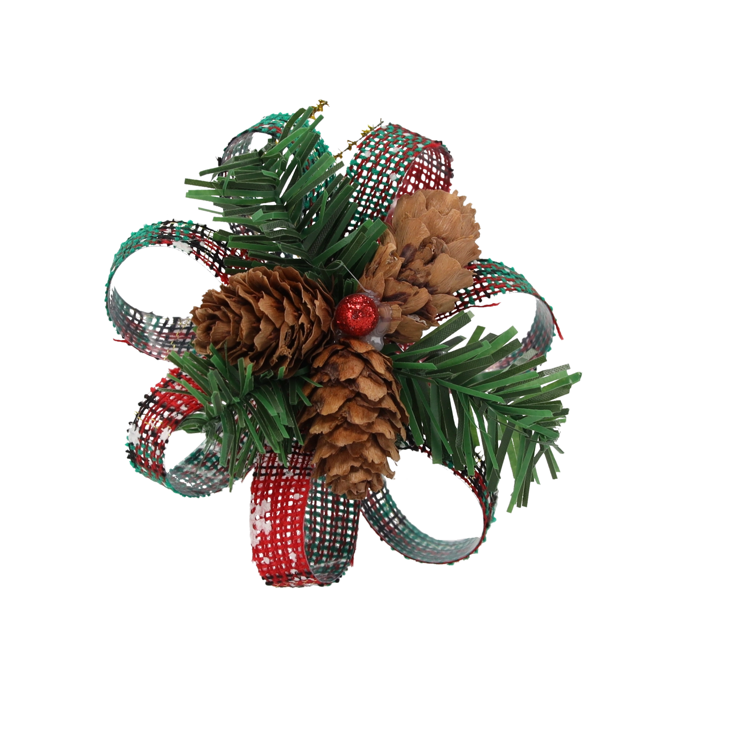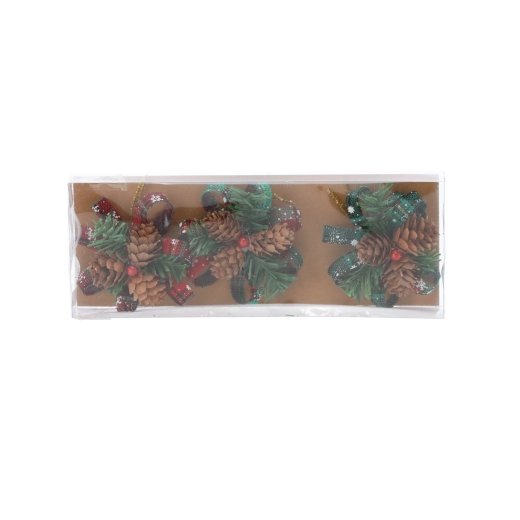 Élethű mű tűlevelek és természetes tobozok adnak a dekorációnak autentikus, rusztikus megjelenést, amelyek erőfeszítés nélkül teremtik meg a téli hangulatot.