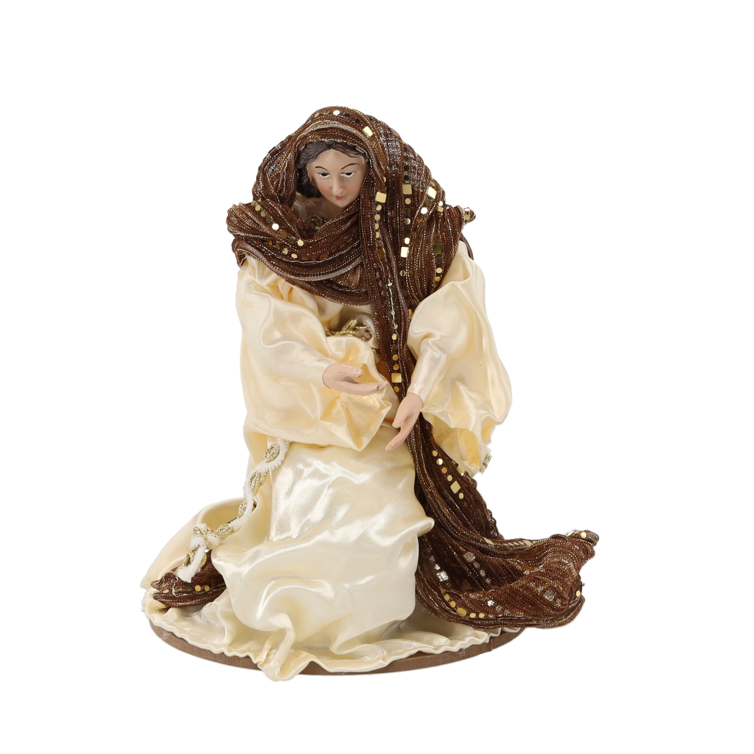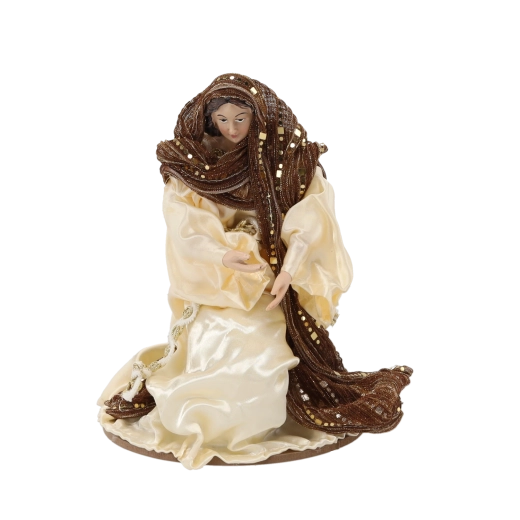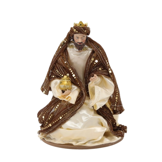 Ez a reprezentatív betlehemi készlet tartalmazza a Szent Családot, egy angyalt, a három királyt, egy pásztort és két állatot. A krémszínű és barna árnyalatú, arany részletekkel díszített figurák elegáns és időtálló hatást keltenek, így remekül illeszkednek klasszikus és modern enteriőrökbe egyaránt. A gyanta anyag hosszú élettartamot és stabilitást biztosít.
