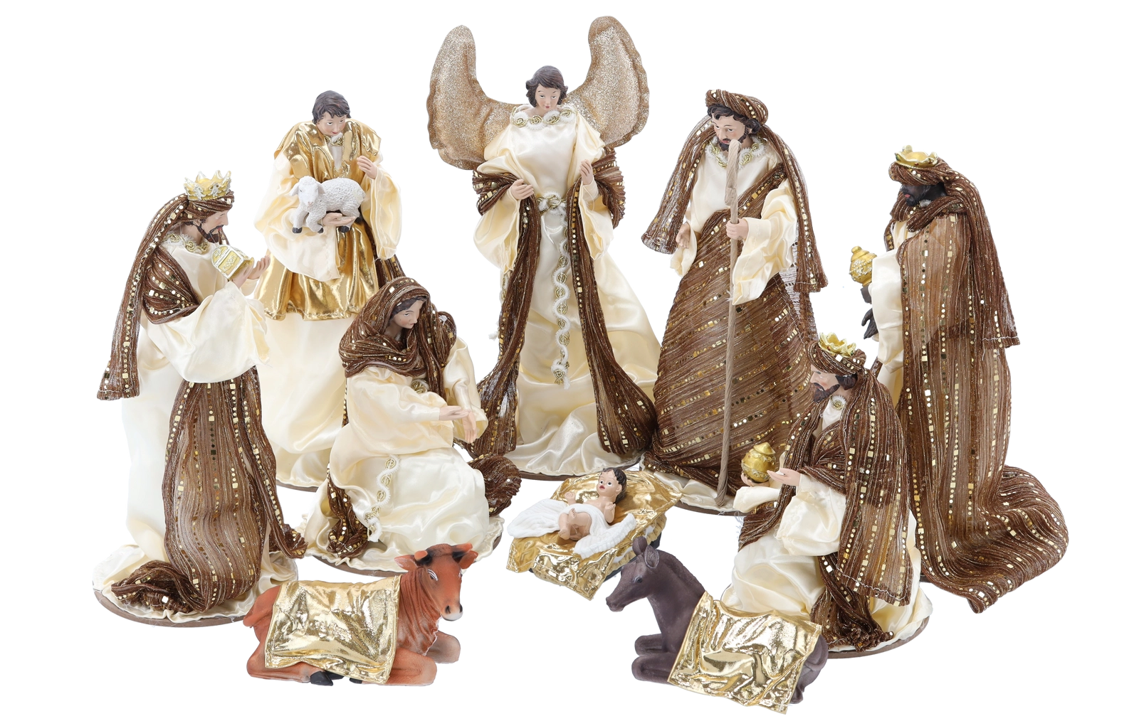 Teremtsen otthon varázslatos karácsonyi hangulatot a 10 darabos, akár 33 cm magas betlehemi figurák teljes készletével. A tartós gyantából készült, részletgazdag figurák elegáns aranybarna akcentusokkal hagyományos és ünnepi jelleget kölcsönöznek dekorációjának – ideális karácsonyi díszítés központi elemeként nappaliban, kápolnában vagy plébánián.