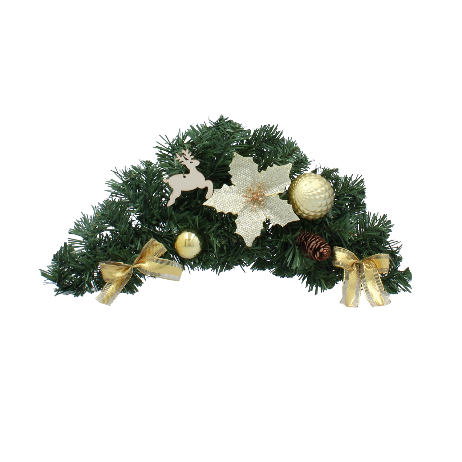 Elegáns, 46 cm hosszú függő karácsonyi dísz arany színben, amely azonnal megteremti az ünnepi hangulatot otthonában. A arany masnik, betlehemi csillagok, gömbök és a műhó kombinációja harmonikus és ünnepélyes hatást kelt. A masszív díszrögzítésnek köszönhetően beltéri és kültéri használatra egyaránt alkalmas, és remekül mutat ajtón, falon vagy ablakon.