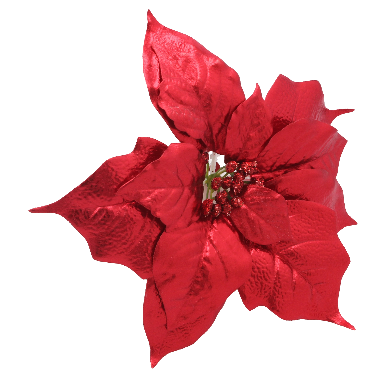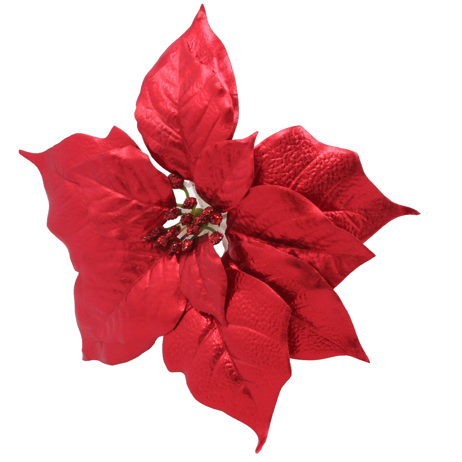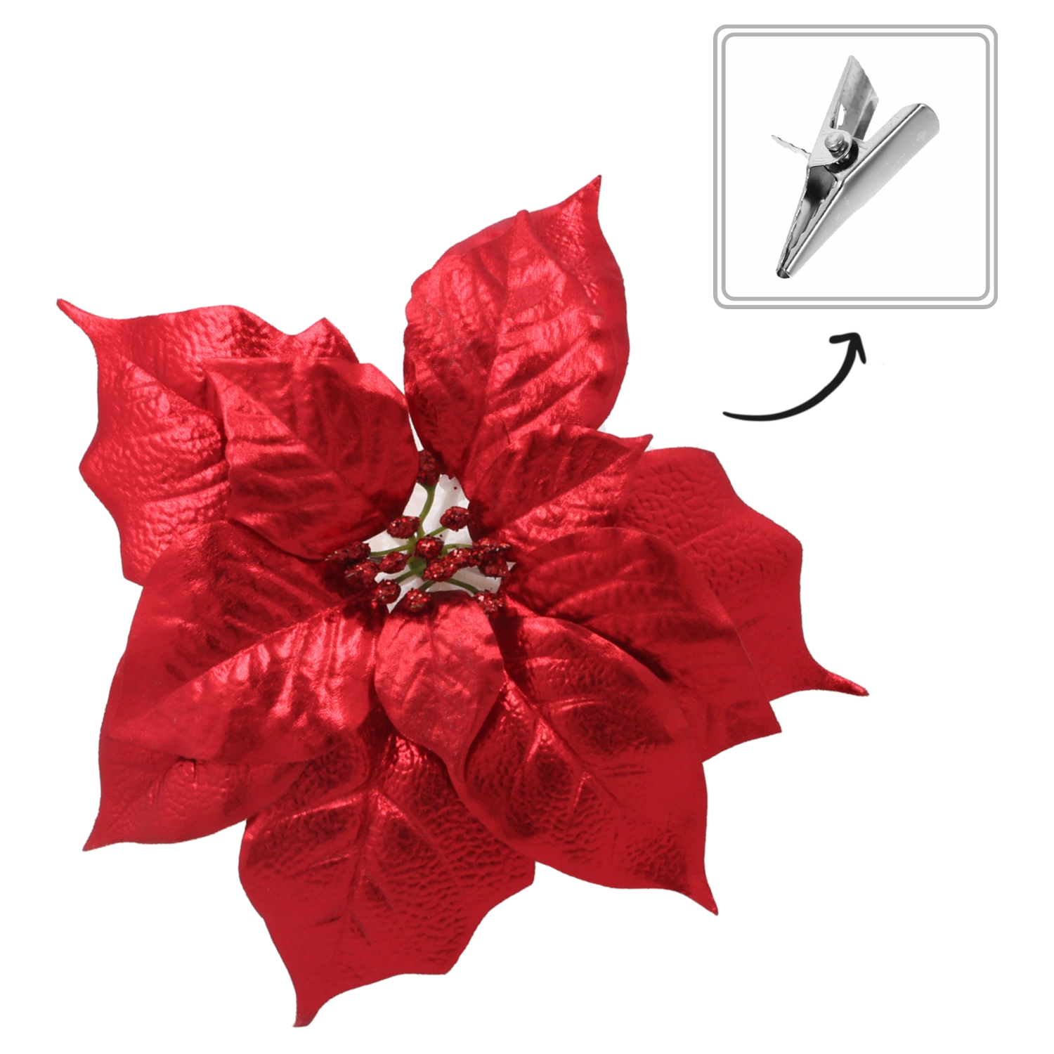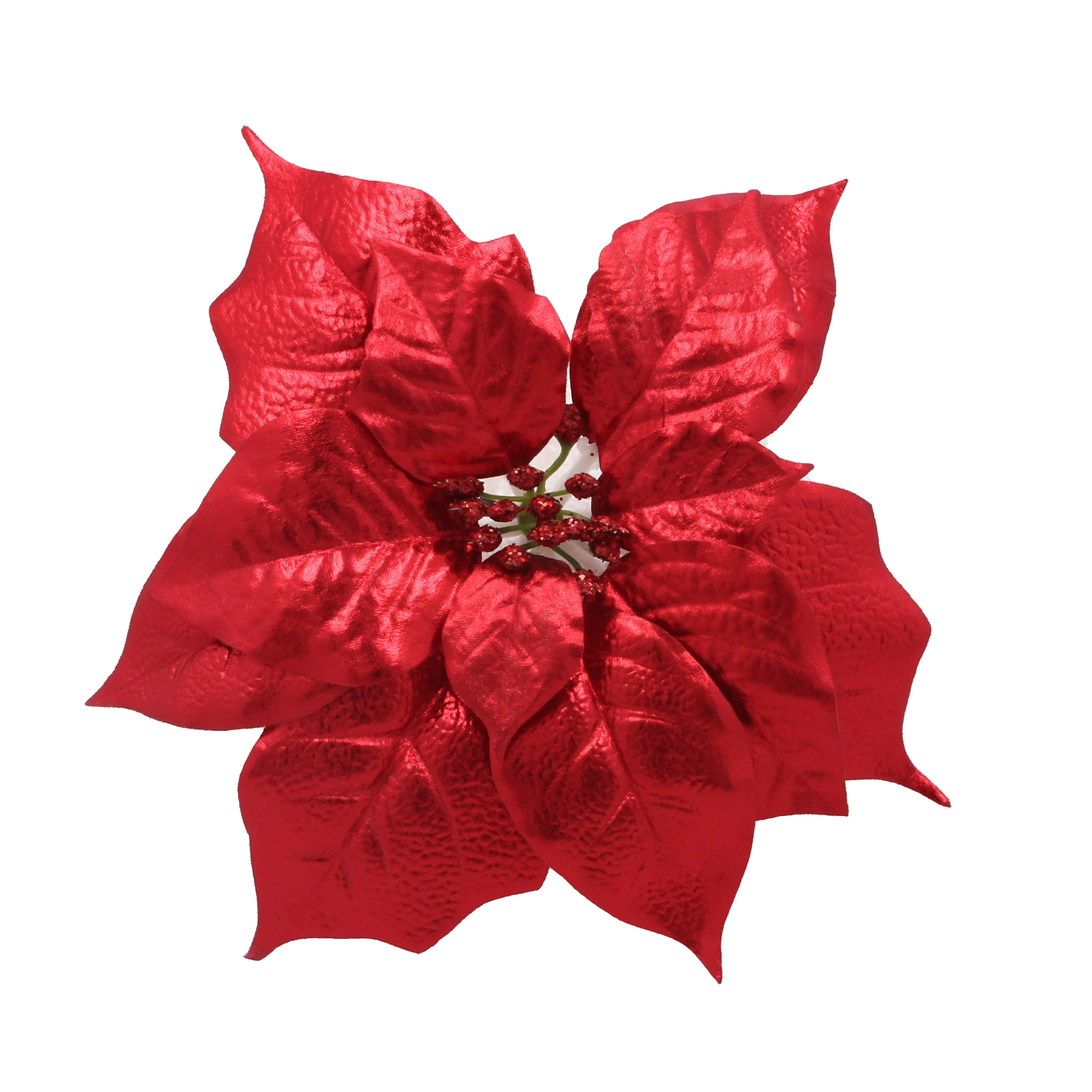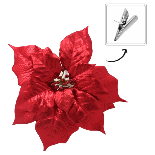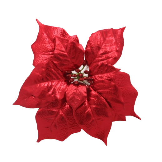 Ez a realisztikus mű miklávirág (poinsettia) hűen utánozza a virág természetes formáját és textúráját, a brokátos díszítésnek köszönhetően pedig szépen veri vissza a karácsonyi fények csillogását. Univerzális dizájnja könnyedén illeszkedik a modern és hagyományos dekorstílusokhoz is, és harmonikus ünnepi kompozíciót teremt.