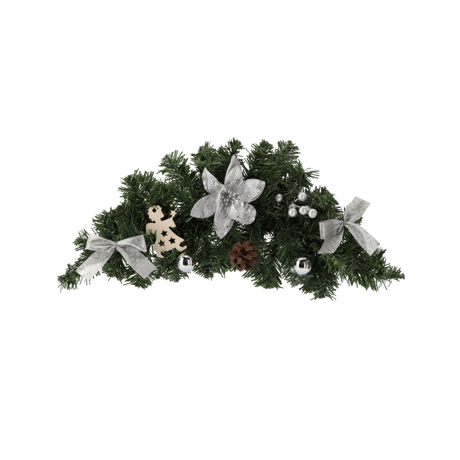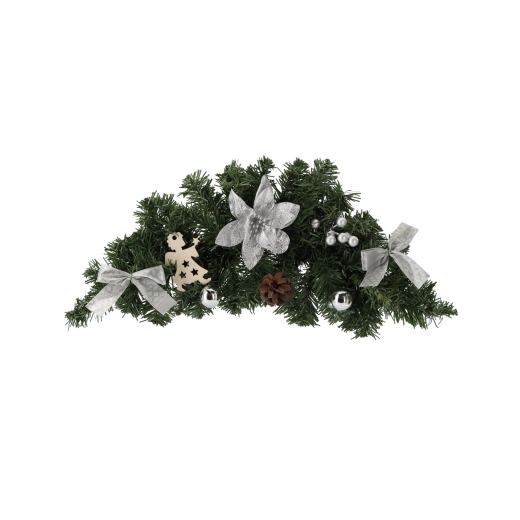 Elegáns, 46 cm hosszú függő karácsonyi dekoráció ezüst kivitelben, amely ünnepi hangulatot kölcsönöz otthonának. Univerzális dizájnjának köszönhetően könnyen elhelyezhető ajtón, falon és ablakon, ahol csillogásával és visszafogott eleganciájával tűnik ki.