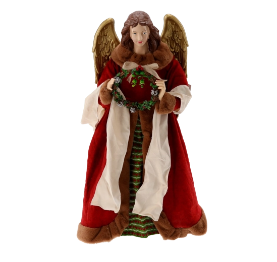 A 90 cm magas, nagy angyalfigura bármely térnek ünnepi hangulatot kölcsönöz. A vörös, fehér és zöld tónusú, gazdagon rétegzett öltözék puha prémmel és arany szárnyakkal elegáns hatást kelt, míg a kézzel festett arc és tenyerek életteli kifejezést adnak a dekorációnak. Stabil szerkezetének és kis tömegének köszönhetően könnyen elhelyezhető komódon, betlehem mellett, pódiumon, sőt csúcsdíszként a karácsonyfán is.