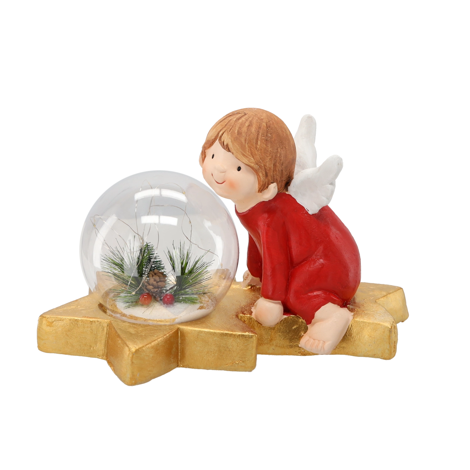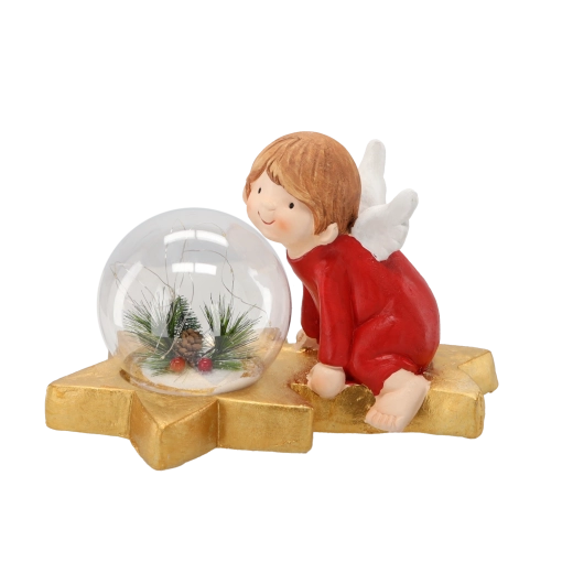 Bájos karácsonyi angyalka figura átlátszó LED gömbbel, amely varázslatos hangulatot teremt otthonában. Az arany csillagon térdelő, piros ruhás angyalka mellett egy dekoratív gömb ragyog tűlevelekkel, bogyókkal és tobozzal. A részletgazdag kidolgozásnak, a fényes felületnek és a finom LED megvilágításnak köszönhetően ez a dekoráció tökéletes az asztalra, polcra vagy komódra. AAA elemek nem tartoznak a csomaghoz.