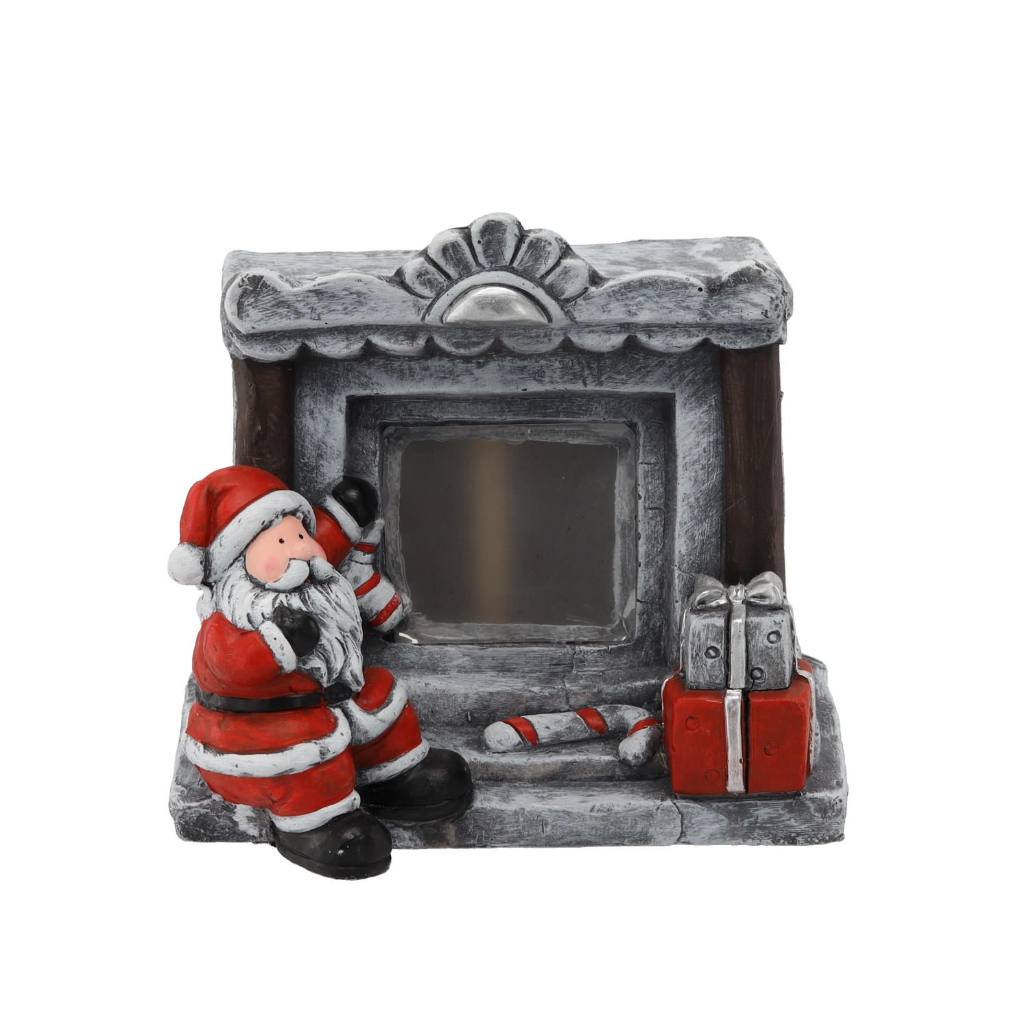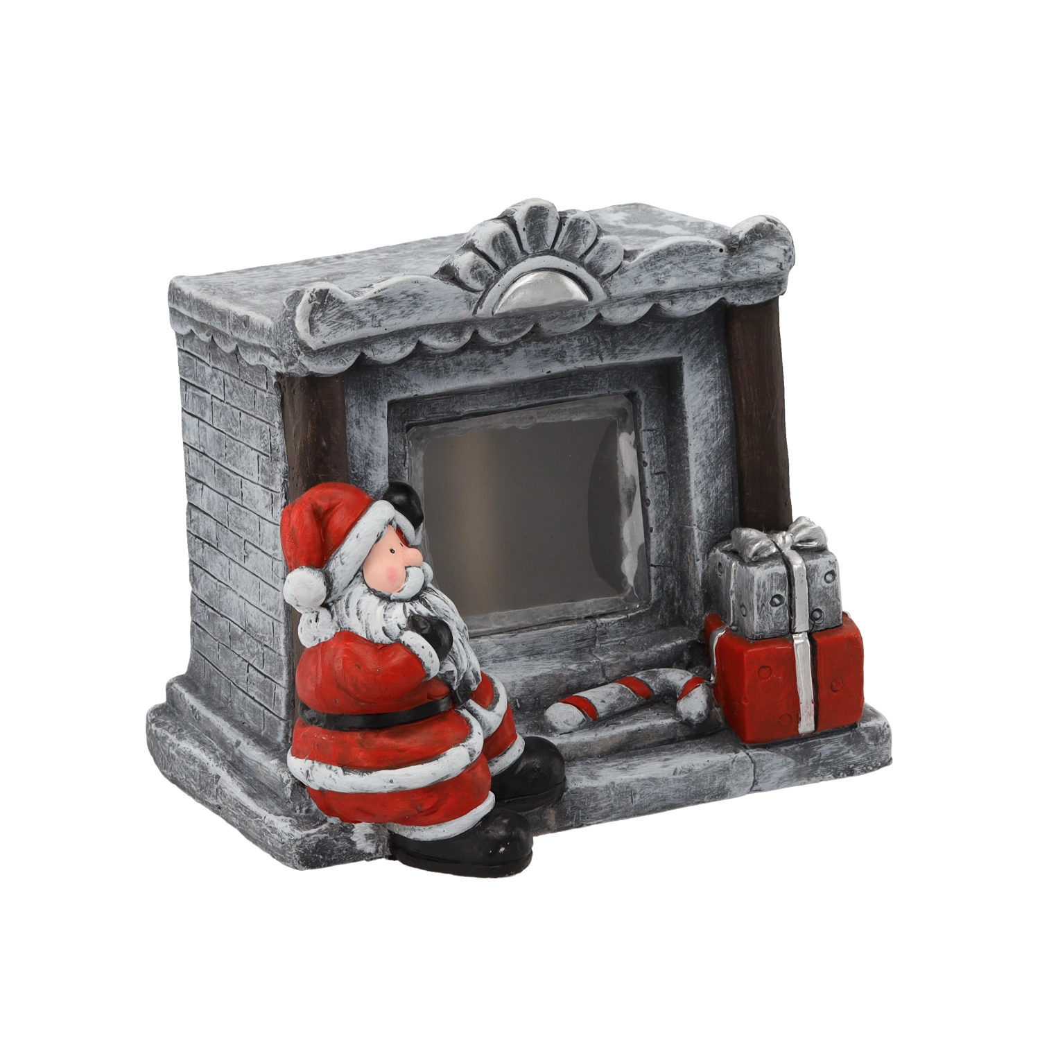 A kandalló kőhatása, a MIKULÁS, az ajándékok és a nyalókarudak gondosan formázottak és festettek, hogy az asztalon vagy polcon is kitűnjenek.