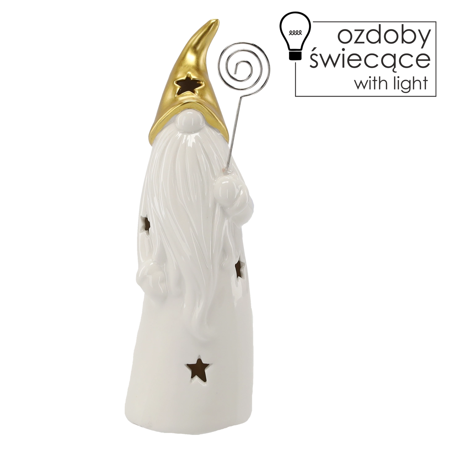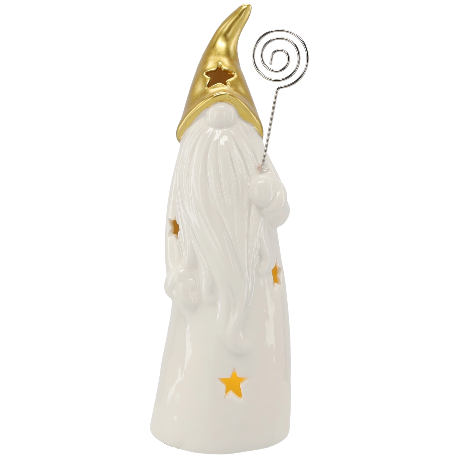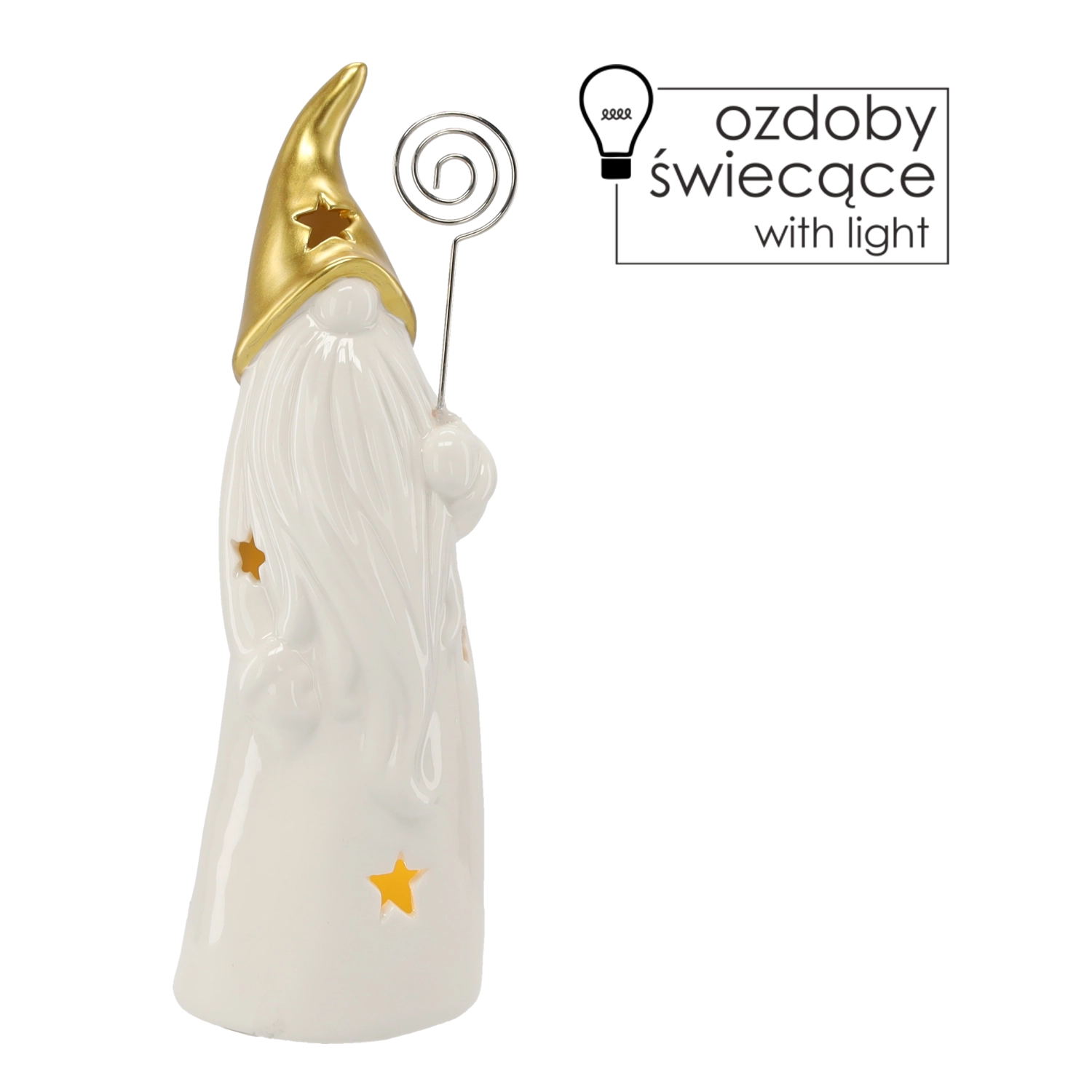 Dekoratív kerámia varázslófigura arany, hegyes sapkával, hosszú fehér szakállal és csillag alakú kivágásokkal, amelyek bekapcsolva finom fényhangulatot teremtenek. Beépített LED világítással, elemmel működik (a csomagban), ideális karácsonyi és egész évben használható dekorációként asztalra, komódra vagy ablakpárkányra.