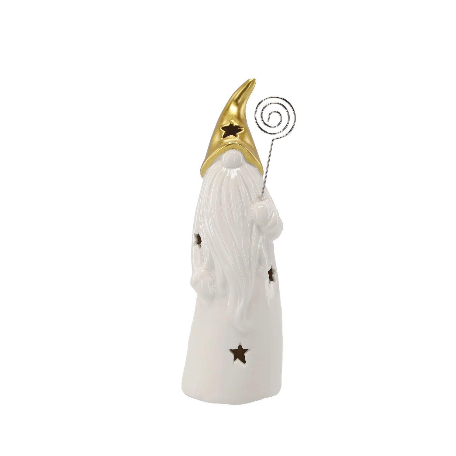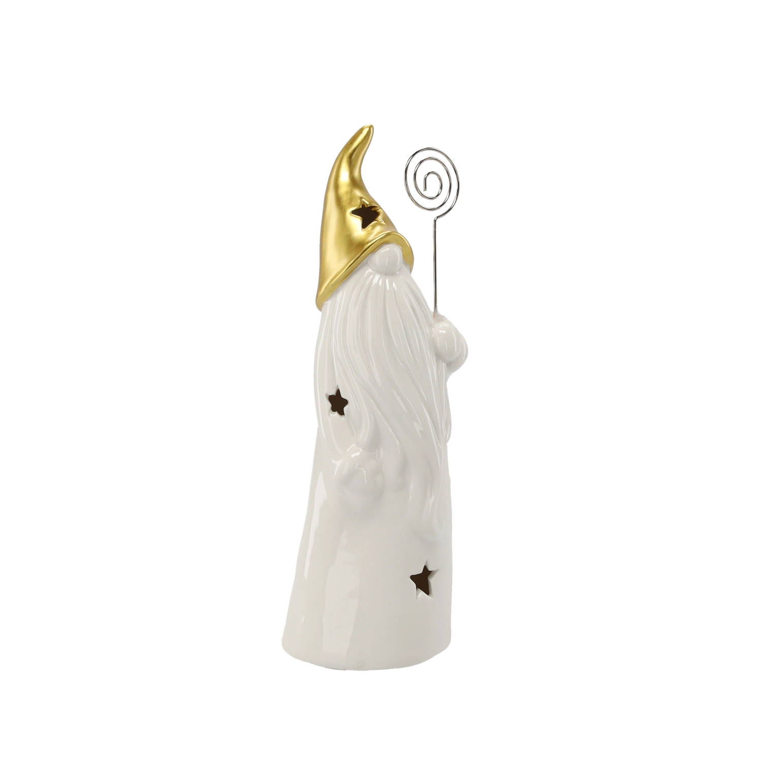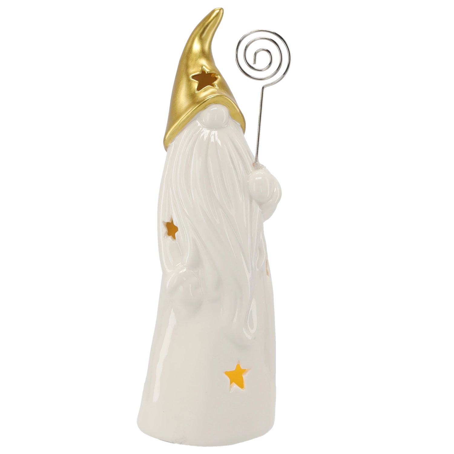 Dekoratív kerámia varázslófigura arany, hegyes sapkával, hosszú fehér szakállal és csillag alakú kivágásokkal, amelyek bekapcsolva finom fényhangulatot teremtenek. Beépített LED világítással, elemmel működik (a csomagban), ideális karácsonyi és egész évben használható dekorációként asztalra, komódra vagy ablakpárkányra.