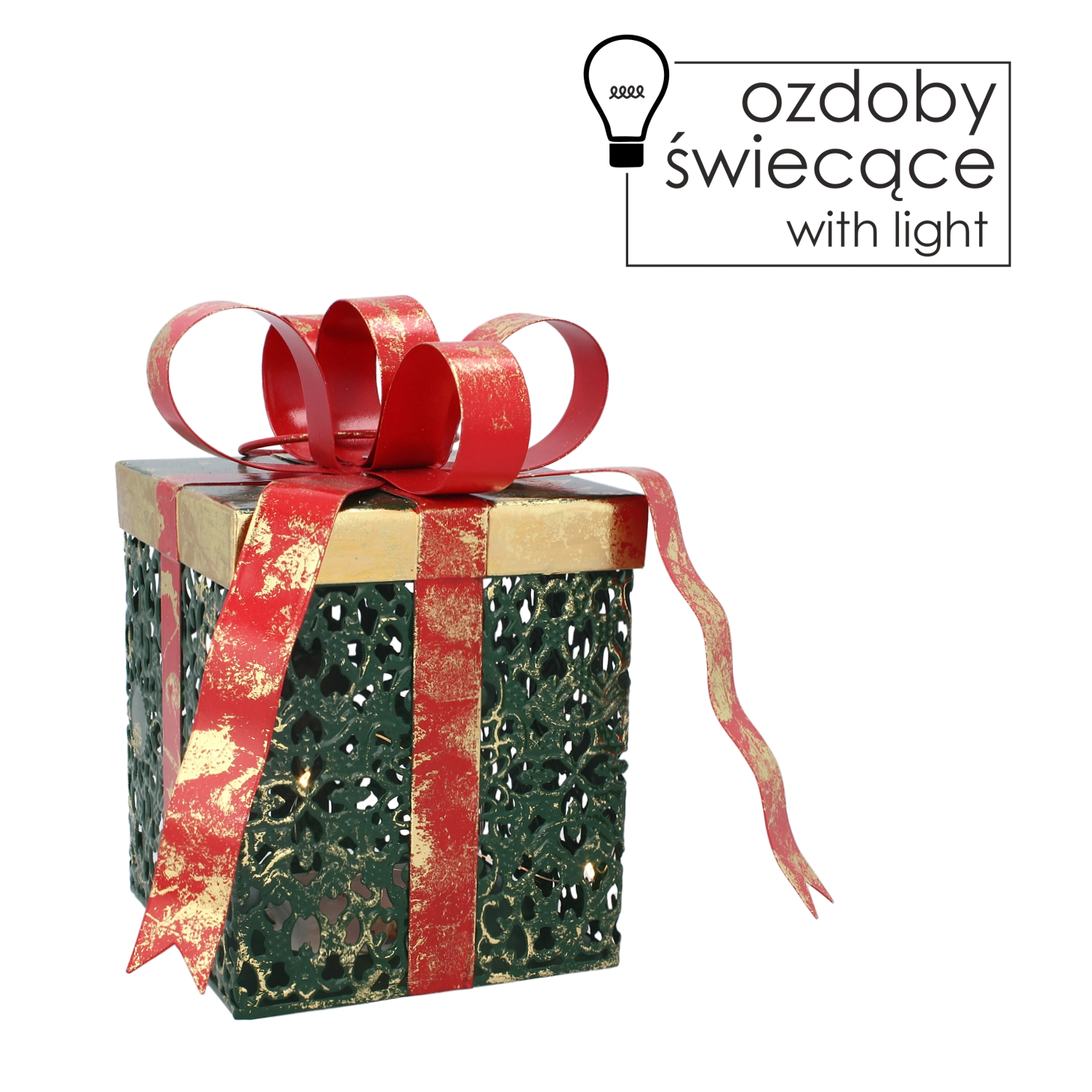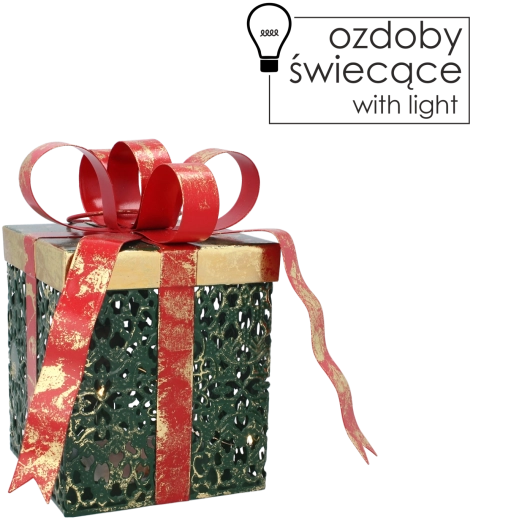 Ez a fémből készült, ajándék formájú dekoráció tökéletes választás a karácsonyi díszítés finomhangolásához. A meleg fehér LED fény kellemes esti megvilágítást biztosít, amely nyugodt, harmonikus atmoszférát teremt. A letisztult dizájnt a látványos piros masni egészíti ki, kiemelve az ünnepi jelleget.