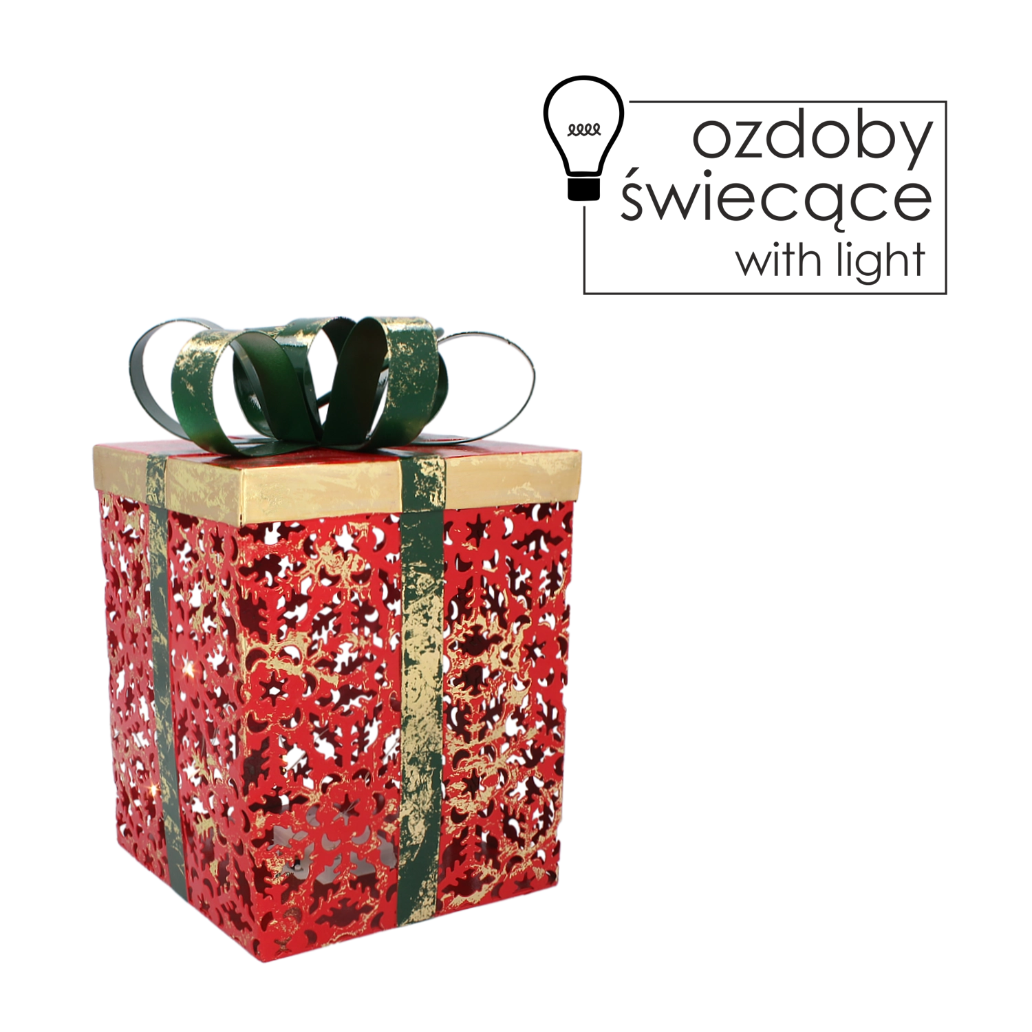 Varázsoljon karácsonyi hangulatot otthonába ezzel a stílusos, ajándék alakú fém dekorációval. A piros kivitel finom kivágásokkal engedi a LED világítás meleg fényét átszűrődni, látványos fényeffekteket keltve, míg a zöld masni a hagyományos ünnepi megjelenést hangsúlyozza.