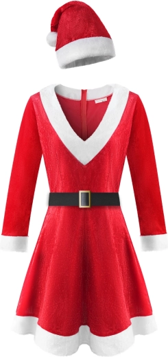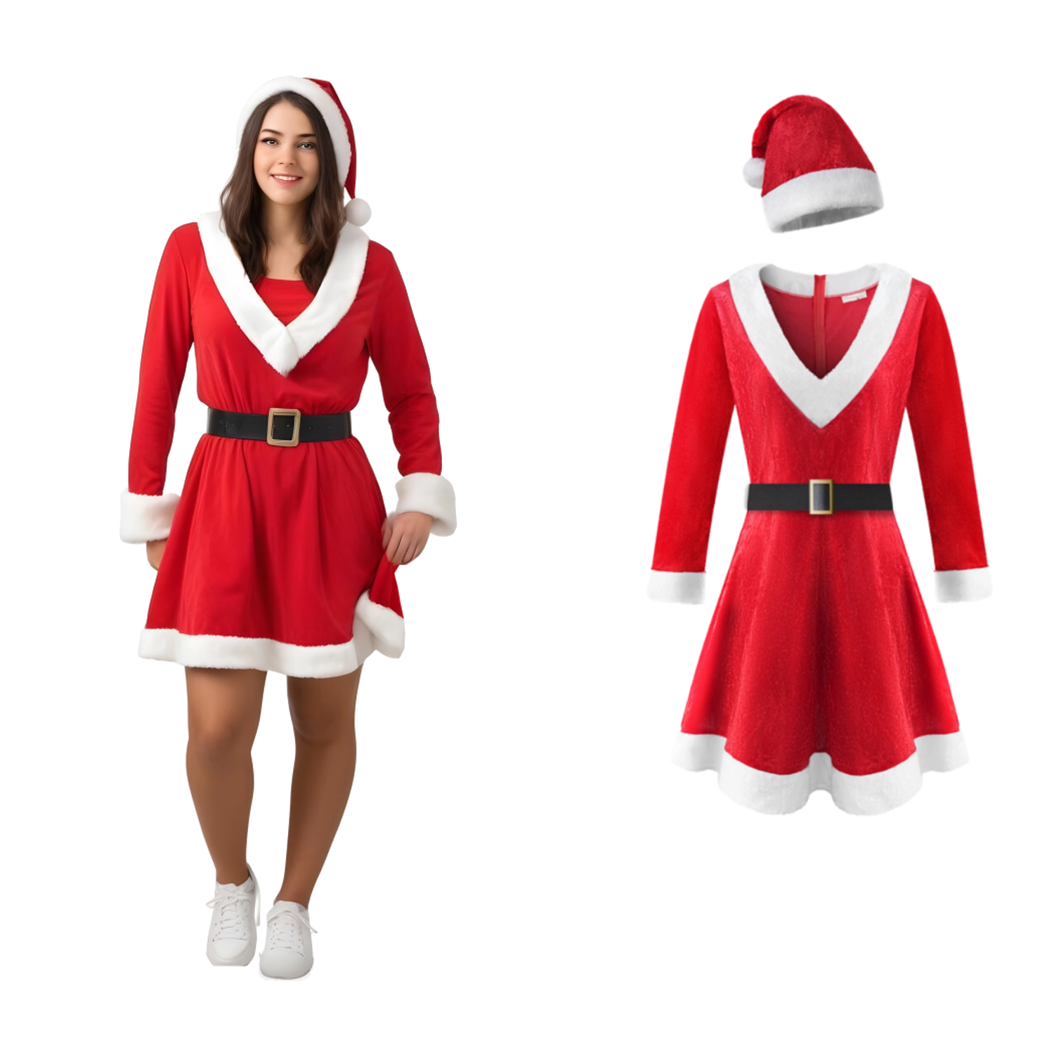 A csomagban megtalálod a ruhát, a Mikulás-sapkát és a fekete, csattal ellátott övet – harmonikus outfit, további kiegészítők keresgélése nélkül.