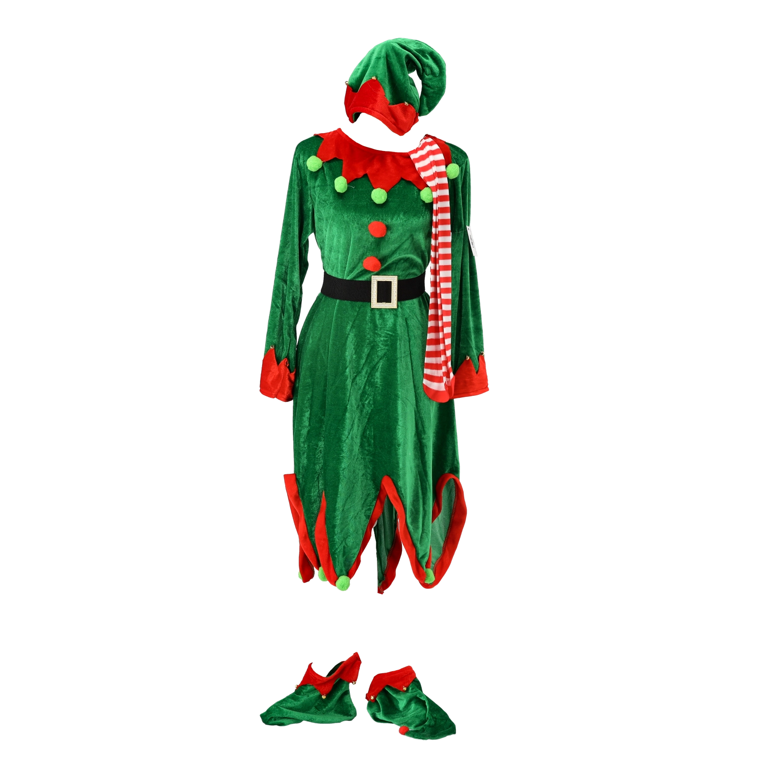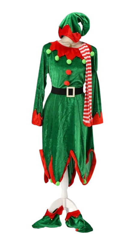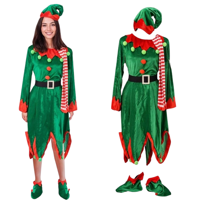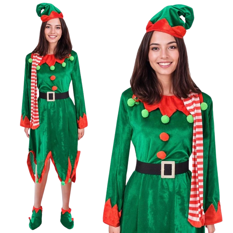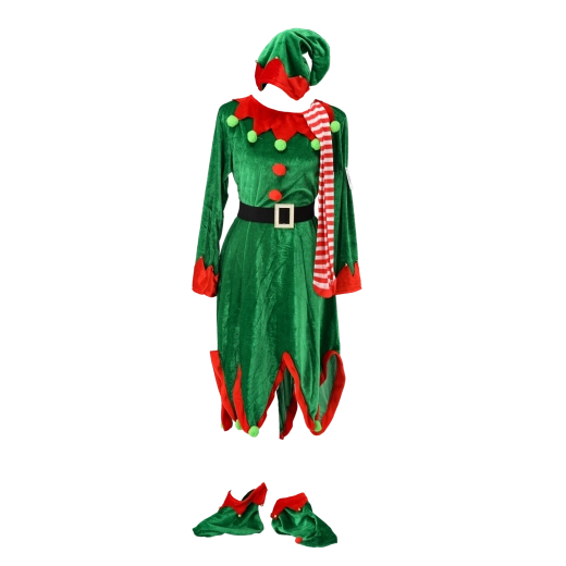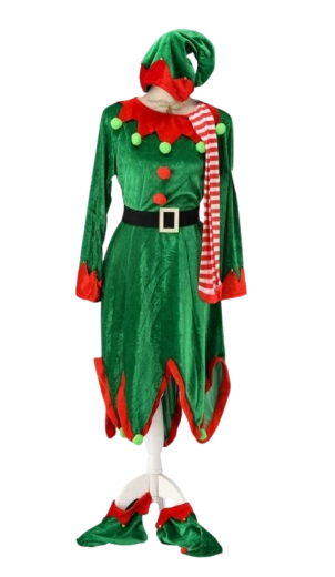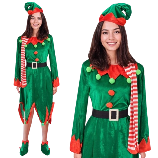 Változz Szent Miklós segítőjévé, és élvezd a vidám ünnepeket ebben a kényelmes, előnyös manójelmezben. Alapja a puha, bársonyos hatású zöld ruha piros gallérral és cakkos szegéllyel, amelyet kiegészít a csúcsos sapka, a csatos öv, a csíkos sál/harisnya és a cipőszárak. Minden összehangolt színekben a tökéletes, ünnepi megjelenésért.