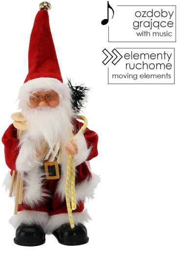Vigyél otthonodba téli varázst és karácsonyi hangulatot. Ez a bájos, sílécekkel felszerelt Mikulás dekoratív figura, amely karácsonyi dallamokat játszik, mozgó elemekkel rendelkezik, és minőségi kidolgozásának valamint hagyományos, prémes szegélyű piros öltözetének köszönhetően azonnal ünnepi atmoszférát teremt.