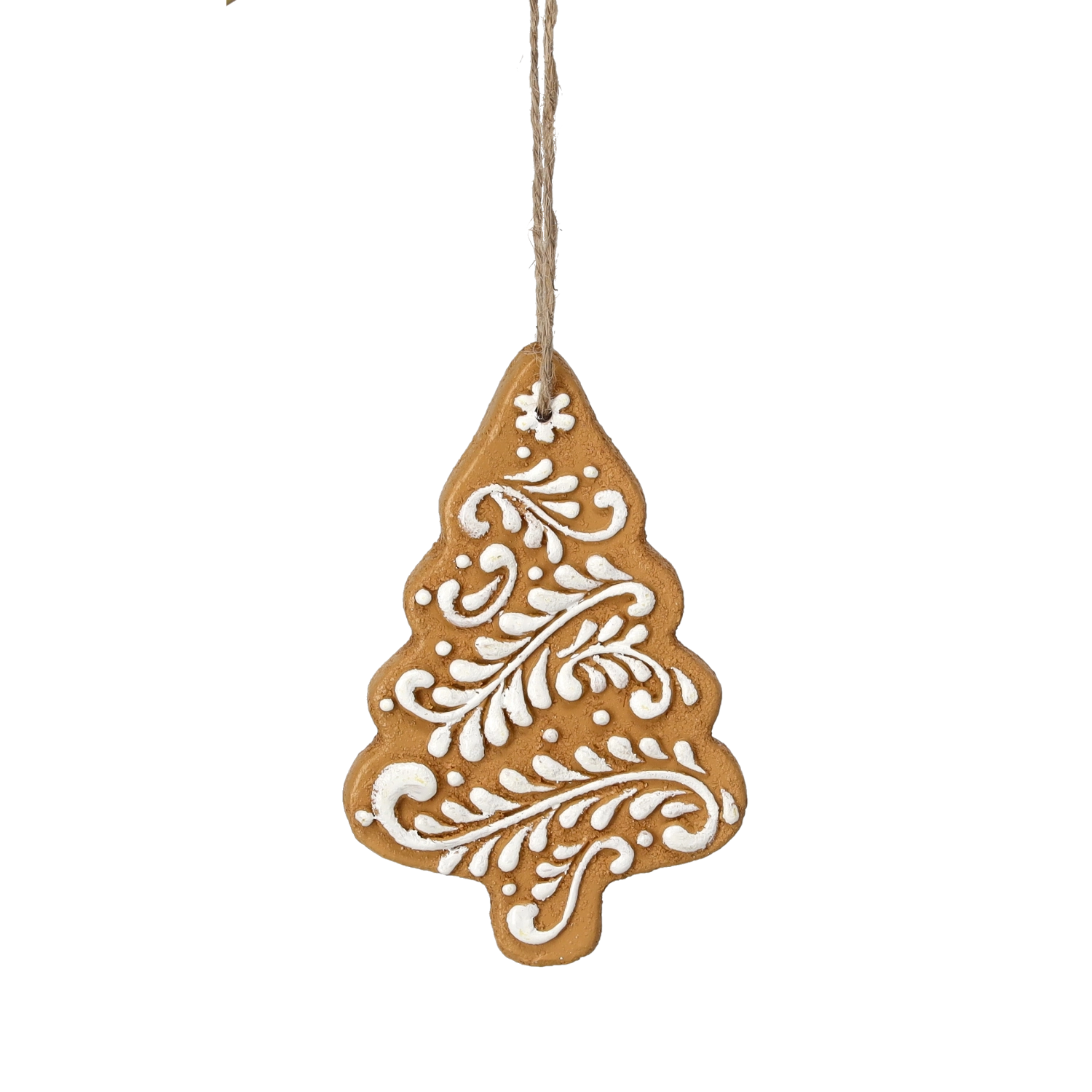 Részletgazdag fehér díszítések barna alapon hűen idézik a díszített mézeskalácsokat, így a dekoráció hagyományos, ünnepi hangulatot áraszt.