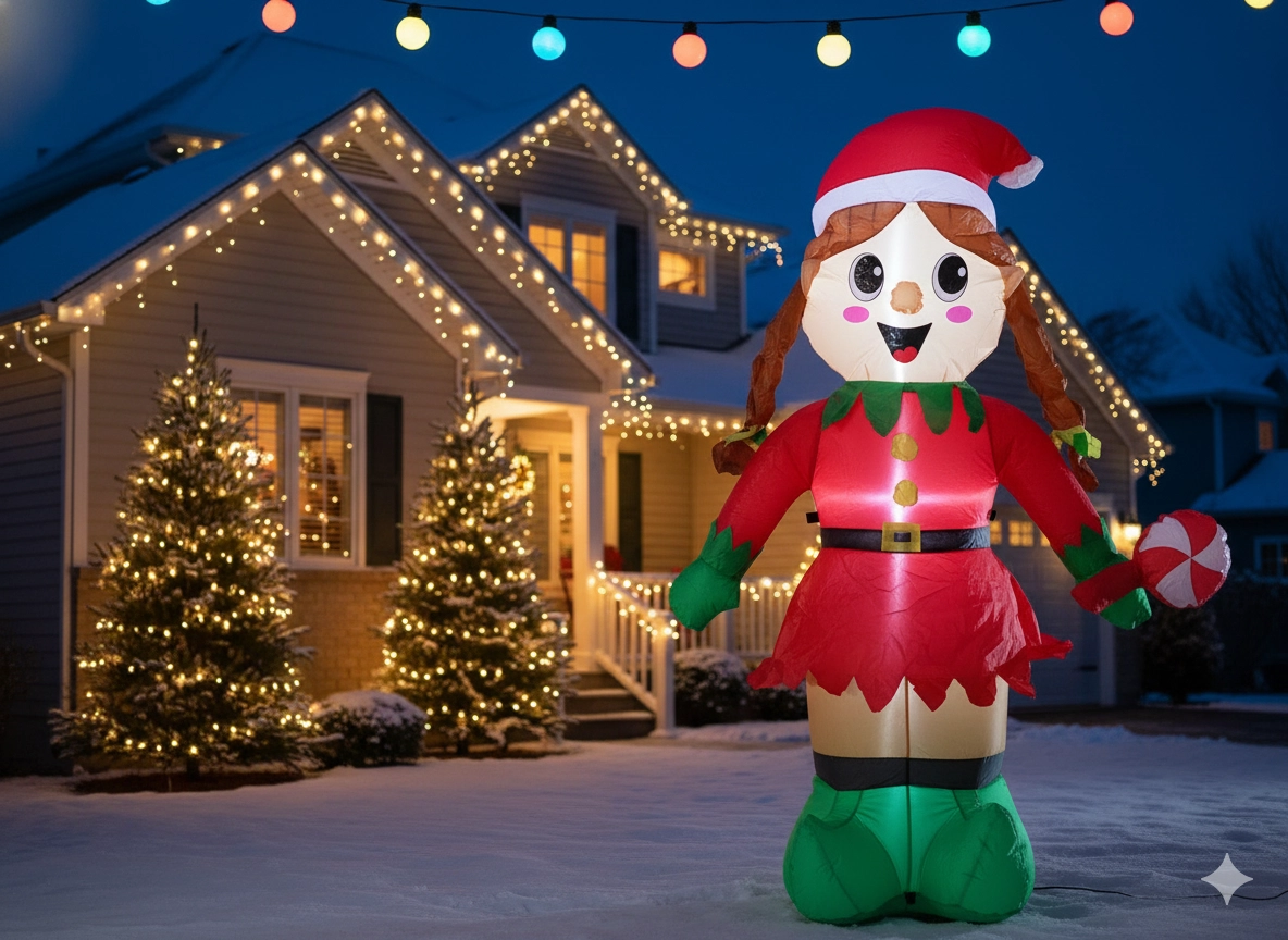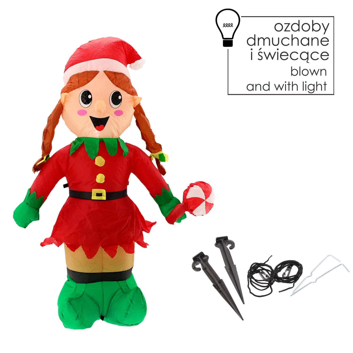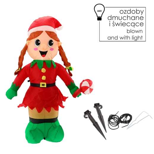 A dekoráció automatikusan felfújódik a beépített ventilátor segítségével, a biztonságos rögzítéshez pedig a csomagban cövekek és feszítőkötelek találhatók. Tartós, vízálló anyaga készen áll a kültéri körülményekre, így gondtalan karácsonyi díszítést élvezhetsz több szezonon át.