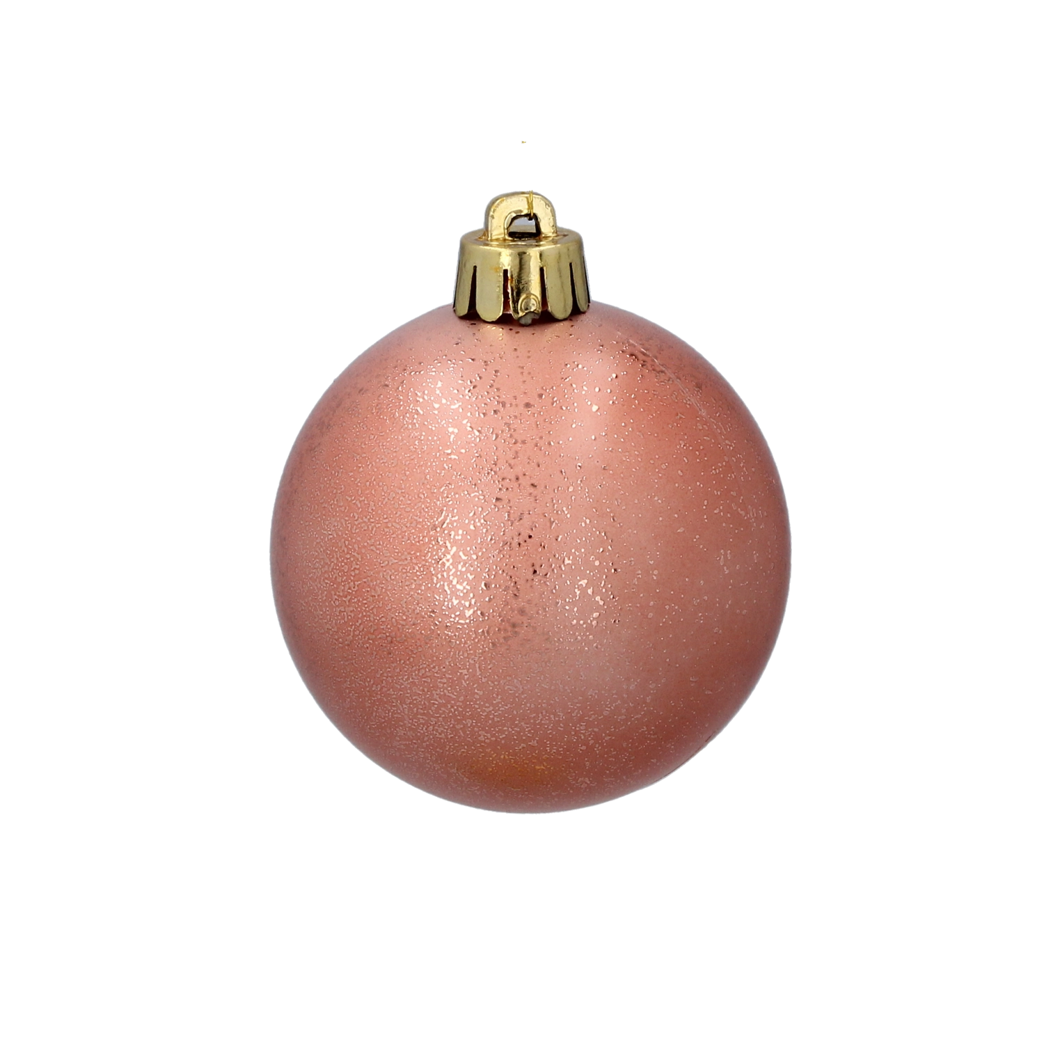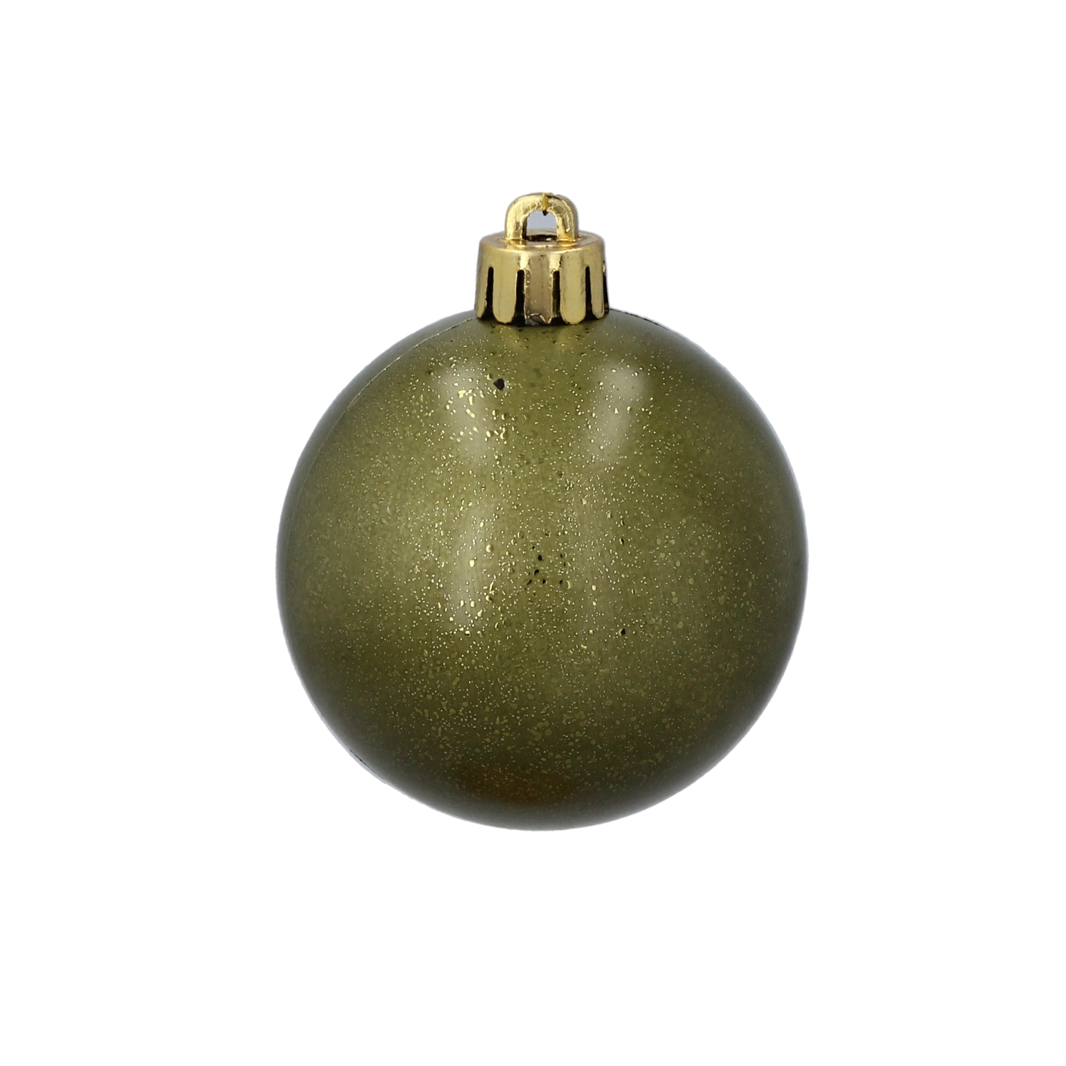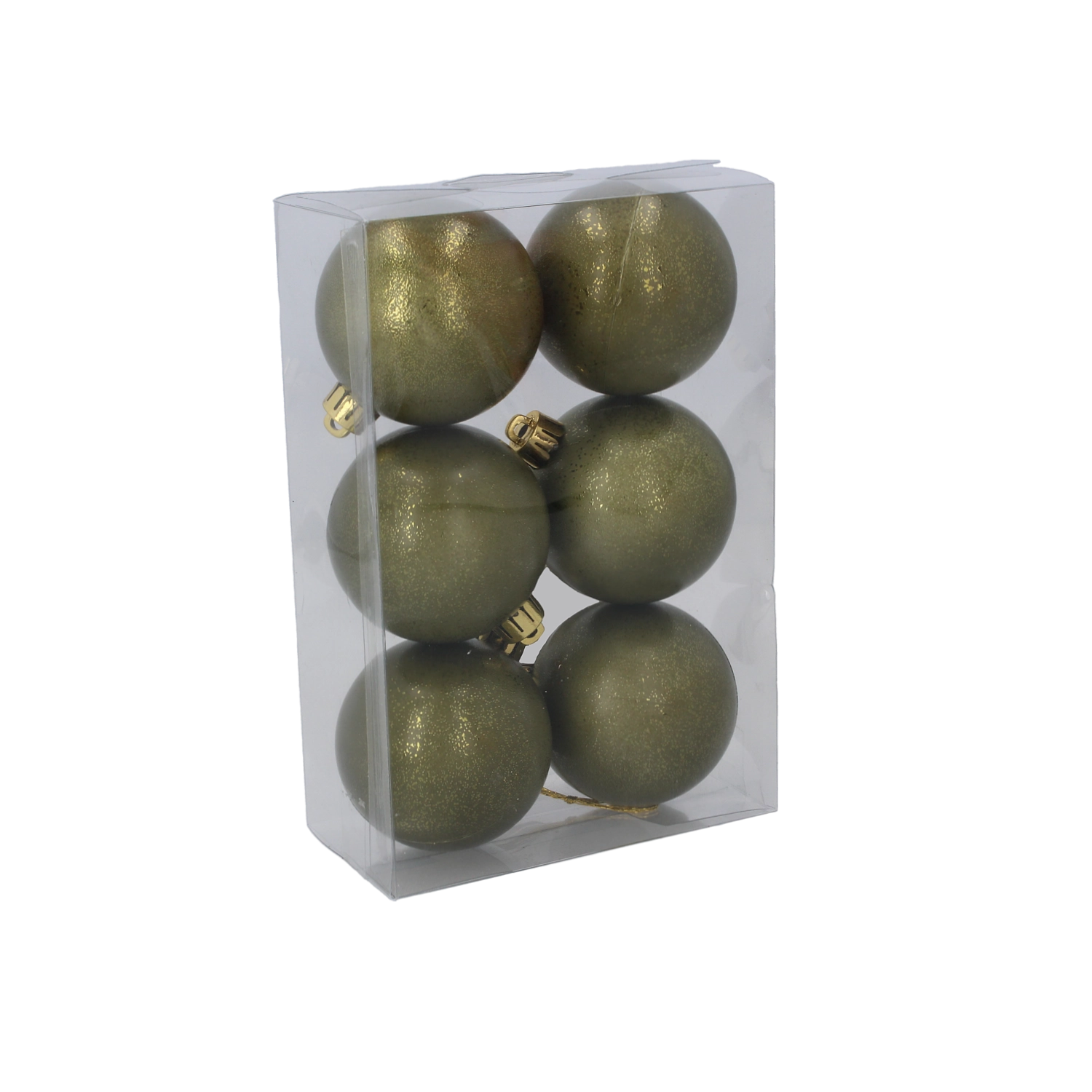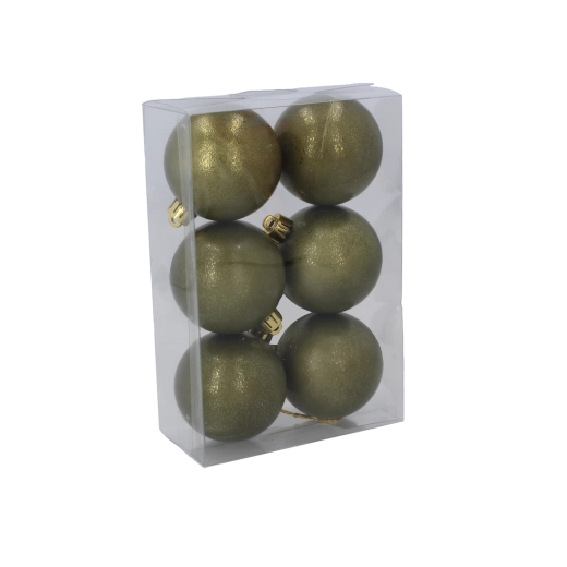 Elegáns karácsonyi díszkészlet harmonikus olívazöld, réz és grafit tónusokban, amely azonnal feldob bármilyen dekorációt. A 6 cm átmérőjű gömbök könnyűek, tartósak és biztonságosak, így nagyszerűen mutatnak a fán, a koszorún és ünnepi asztali kompozíciókban is.