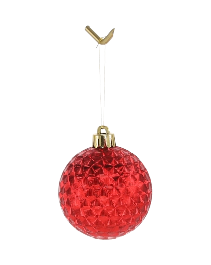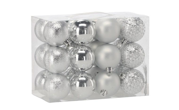 Elegáns, 24 darabos, 6 cm átmérőjű karácsonyi gömbkészlet piros, arany és ezüst színben, vegyes mintákkal, amely klasszikus és modern hangulatot kölcsönöz a fának. A díszek törhetetlen anyagból készülnek a biztonságos használatért gyermekekkel vagy házi kedvencekkel élő otthonokban, és könnyen felakaszthatók a finom akasztózsinóroknak köszönhetően arany vagy ezüst színben.