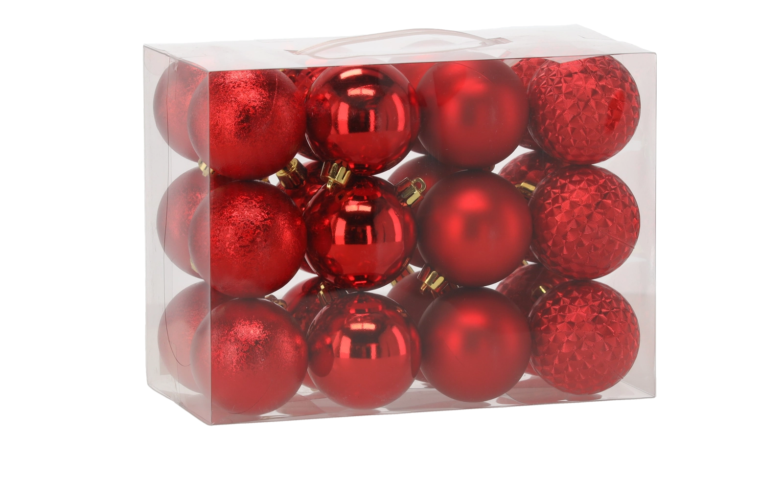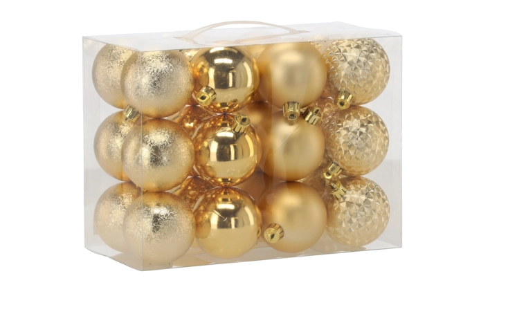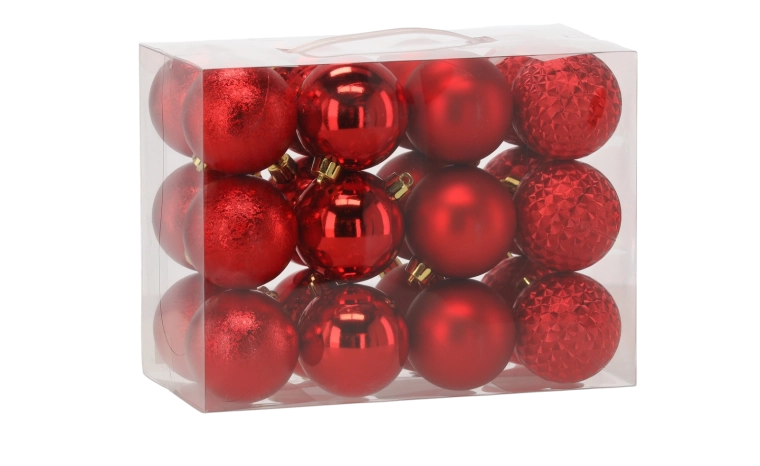 24 darabos karácsonyfadísz készlet 6 cm – piros, arany és ezüst, törhetetlen