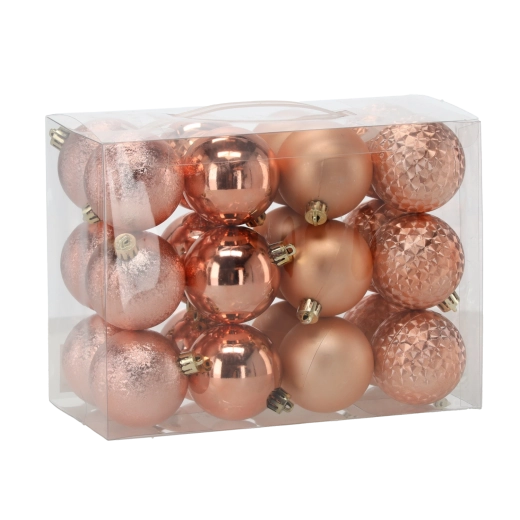 Adj modern lendületet a fának a 24 darabos, 6 cm átmérőjű karácsonyi gömbkészlettel olívazöld, réz és grafit színben. A díszek könnyű műanyagból készültek, így törhetetlenek, ideálisak gyerekekkel és háziállatokkal élő háztartásokba. A különböző felületek – fényes, matt, csillámos és fazonírozott (fazonos) design – látványos mélységet és változatos dekorhatást teremtenek.