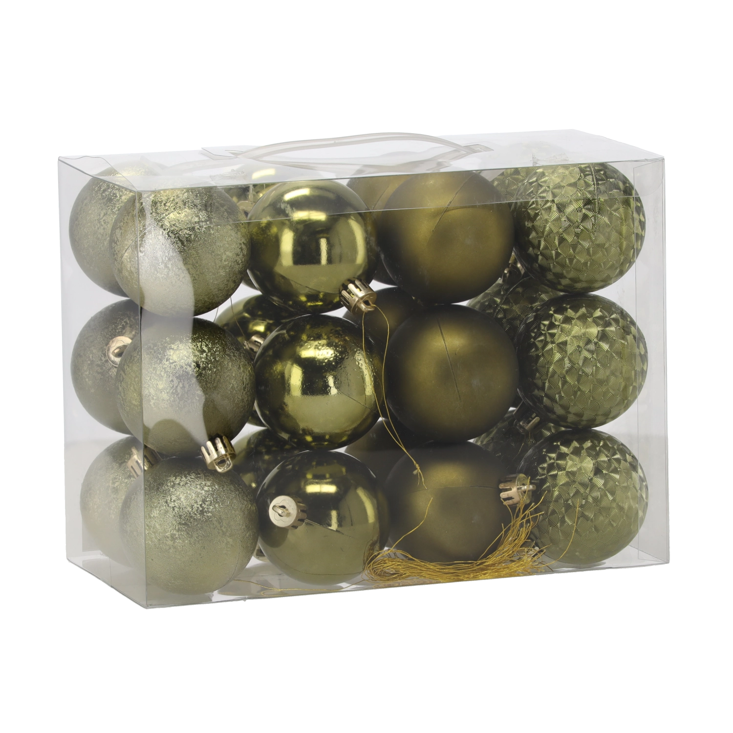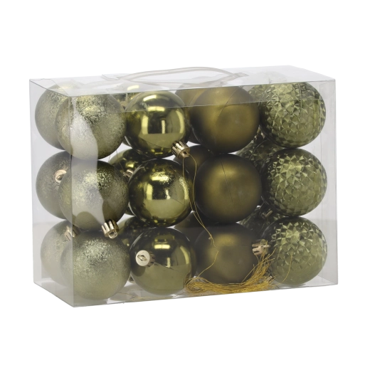 Ez a kiegyensúlyozott szett az olívazöld, réz és grafit modern tónusaiban remek alternatíva a hagyományos színekhez. Az egységes, 6 cm-es átmérőnek köszönhetően a gömbök könnyen kombinálhatók, és közepes vagy nagyobb fákon harmonikus, elegáns összhatást hoznak létre.