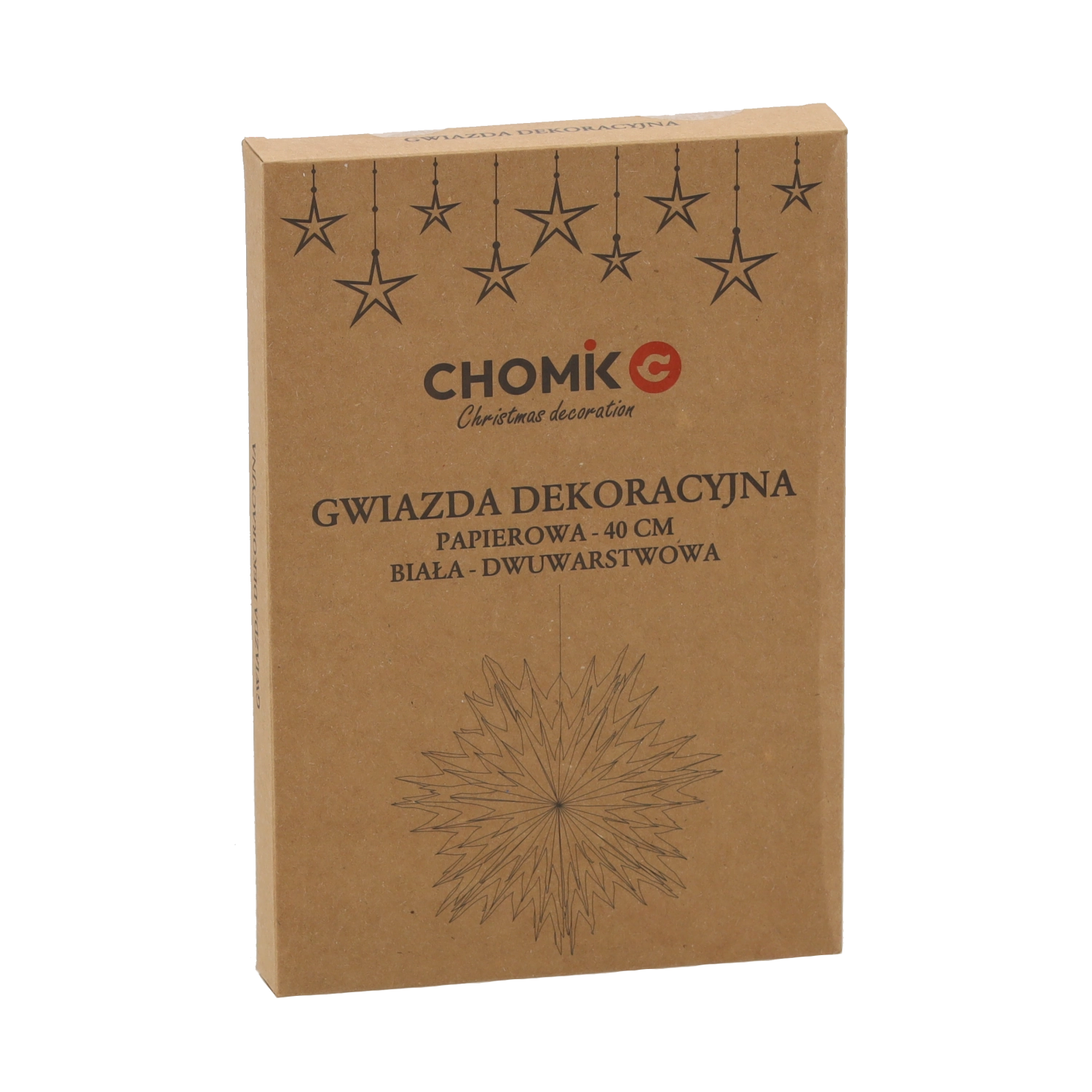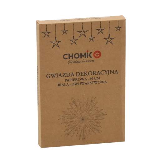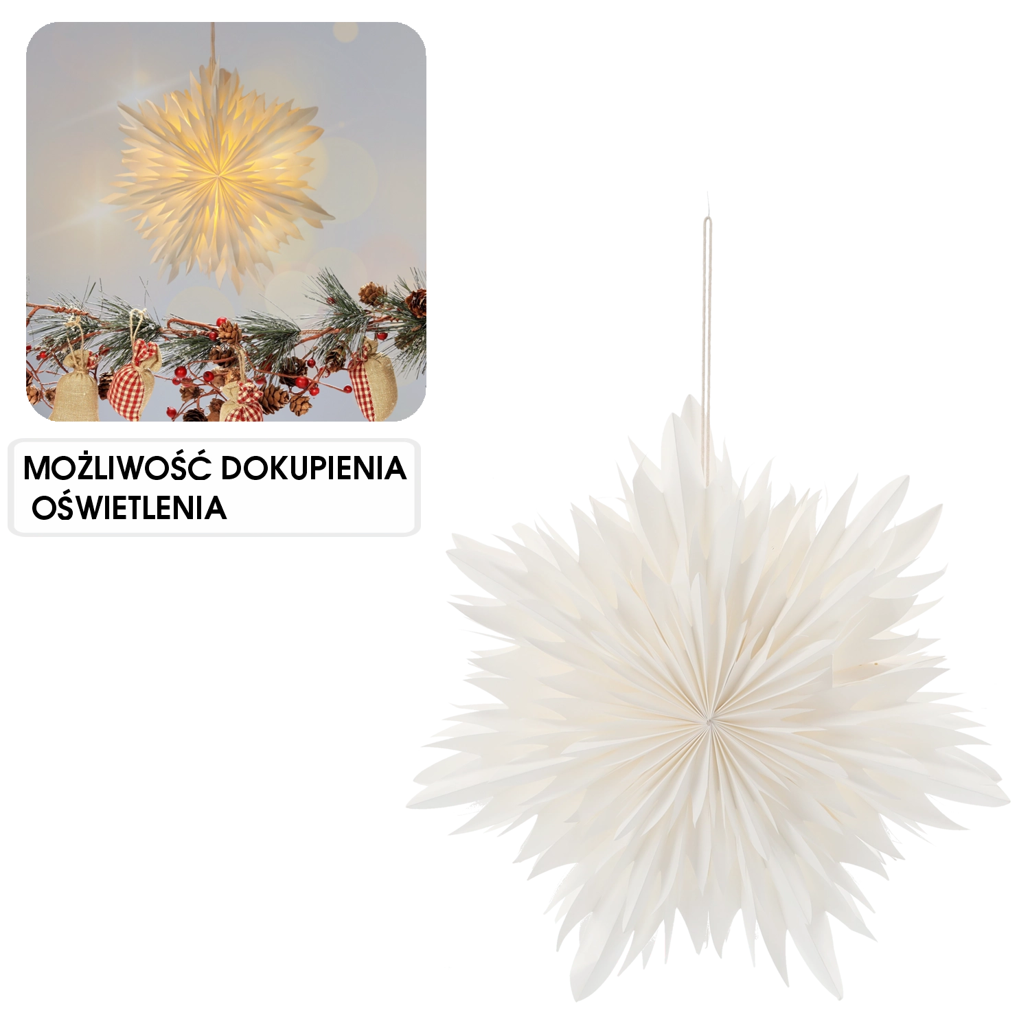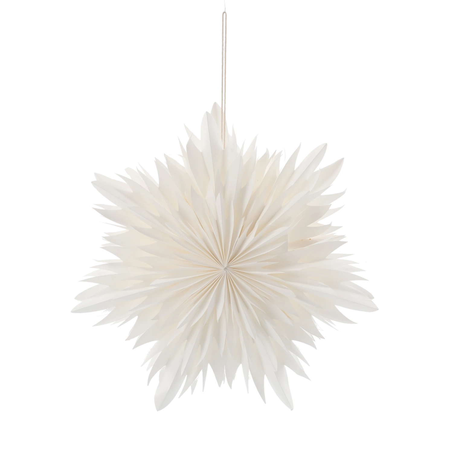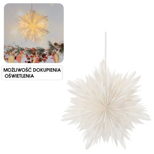 Fedezze fel a letisztult eleganciát a fehér papírcsillag formájában, amely azonnal meghittebbé varázsol bármely helyiséget. A könnyű papír és az átgondolt hajtogatás feltűnő 3D hatást kelt, és szépen veri vissza a fényt. Ideális ablakba, asztal fölé vagy kirakatba függesztve.