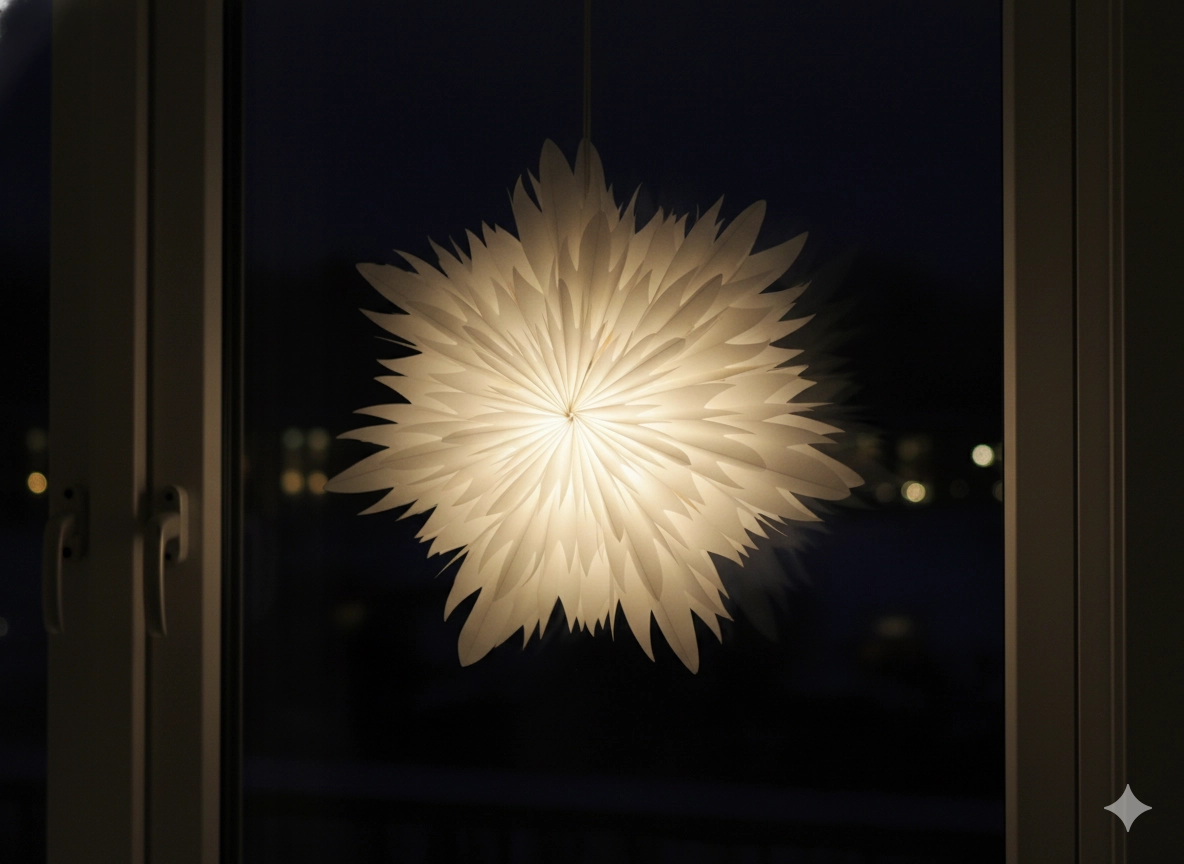 A fehér papír szépen lágyítja a meleg fényt, és puha, ünnepi árnyalatot ad a térnek – ideális ablakba, asztal fölé vagy a nappaliba.
