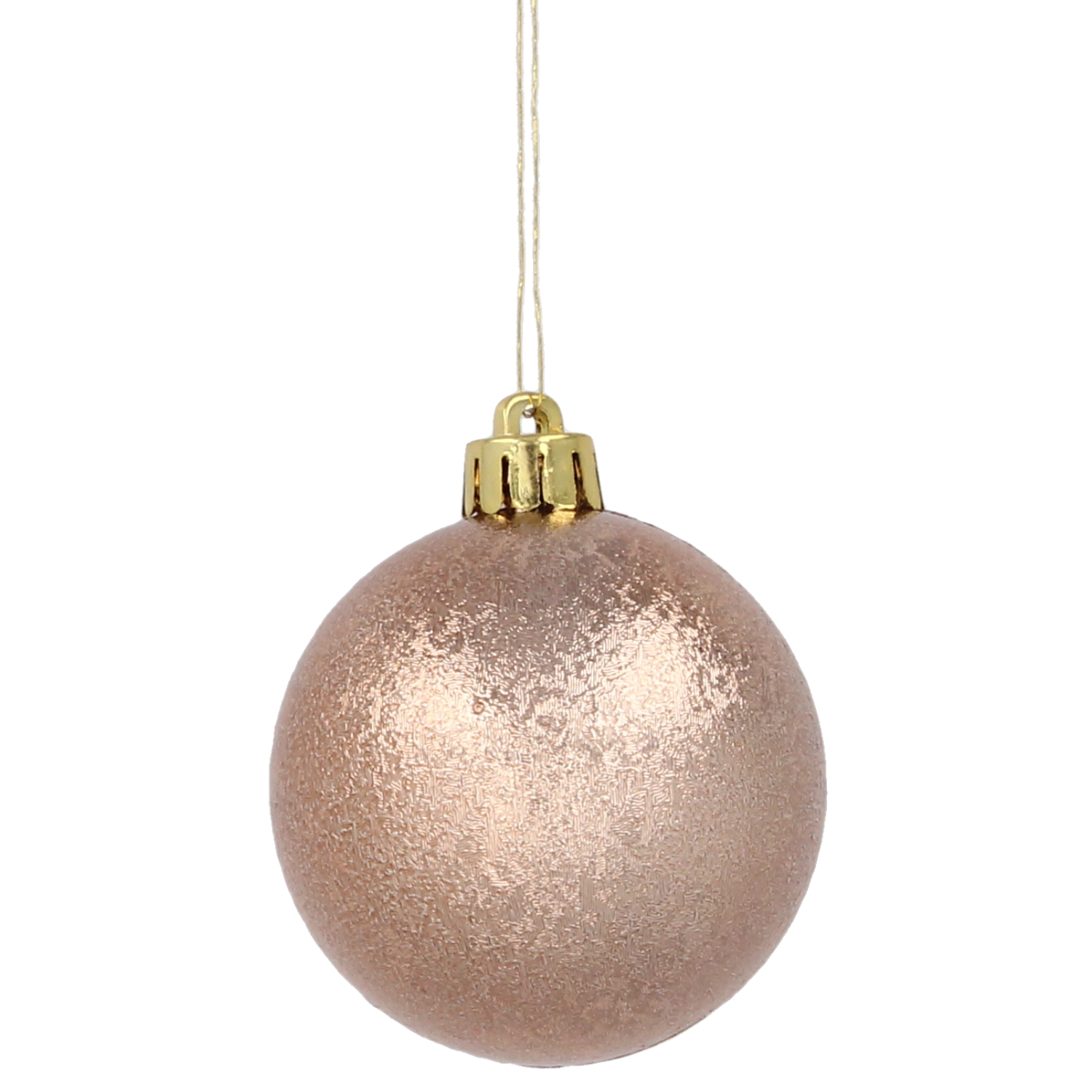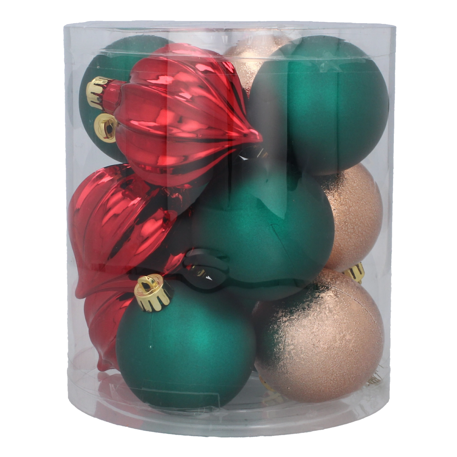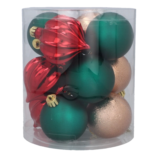 Ez a kiegyensúlyozott díszszett a hagyományos színek és felületek harmóniáját hozza el, amelyek szépen verik vissza a fényt és meghitt karácsonyi hangulatot teremtenek. A strapabíró műanyagnak köszönhetően a gömbök könnyűek, egyszerűen felakaszthatók, és kevésbé hajlamosak a sérülésre, mint az üveg változatok.