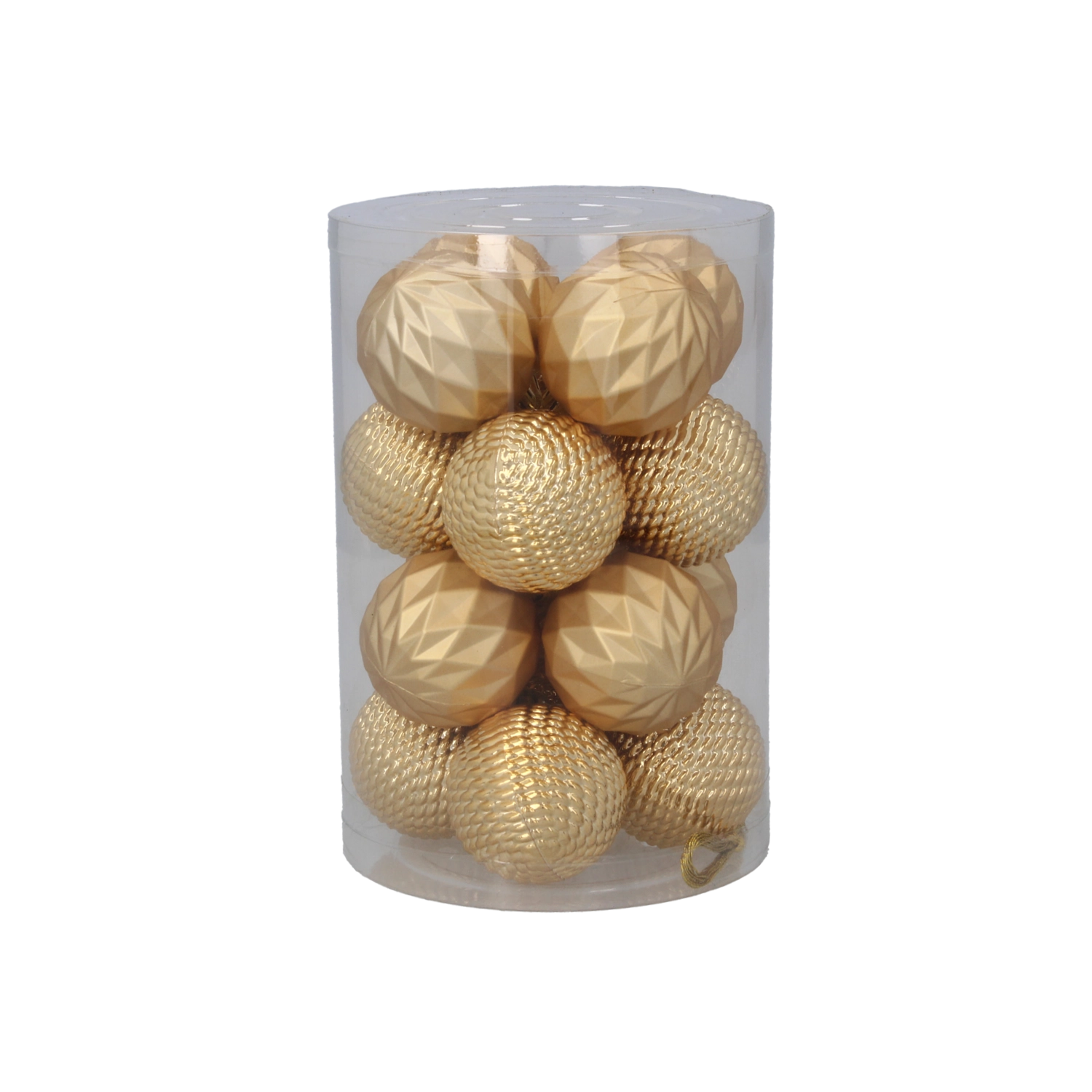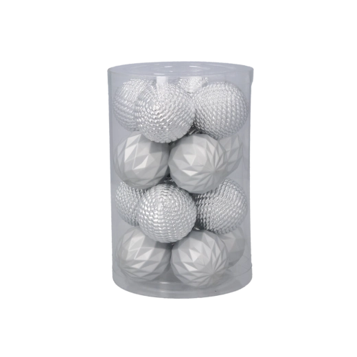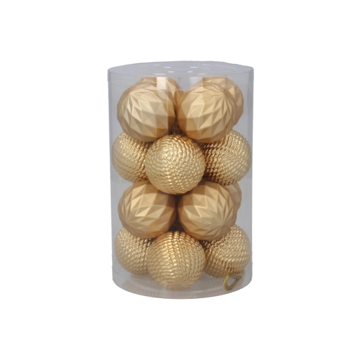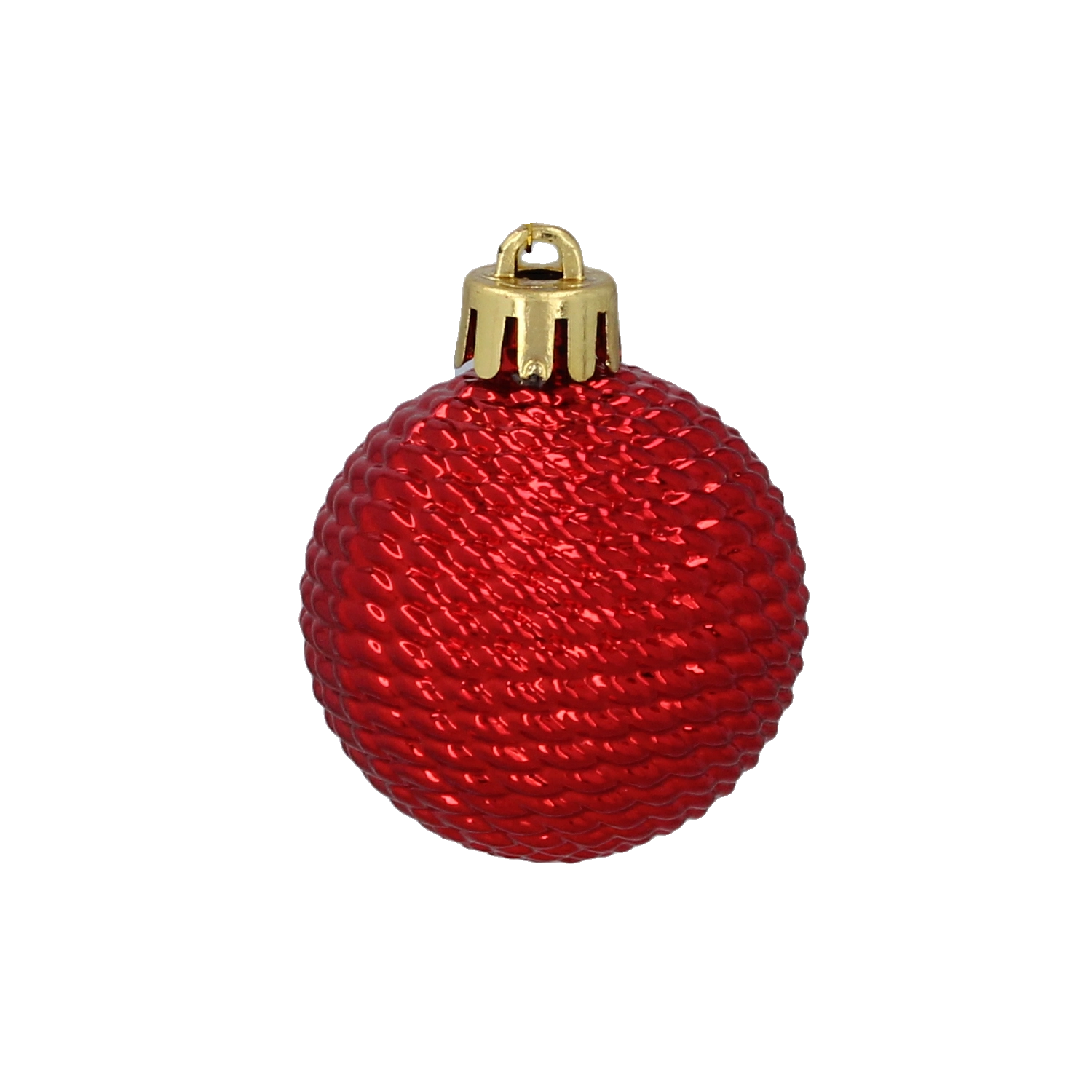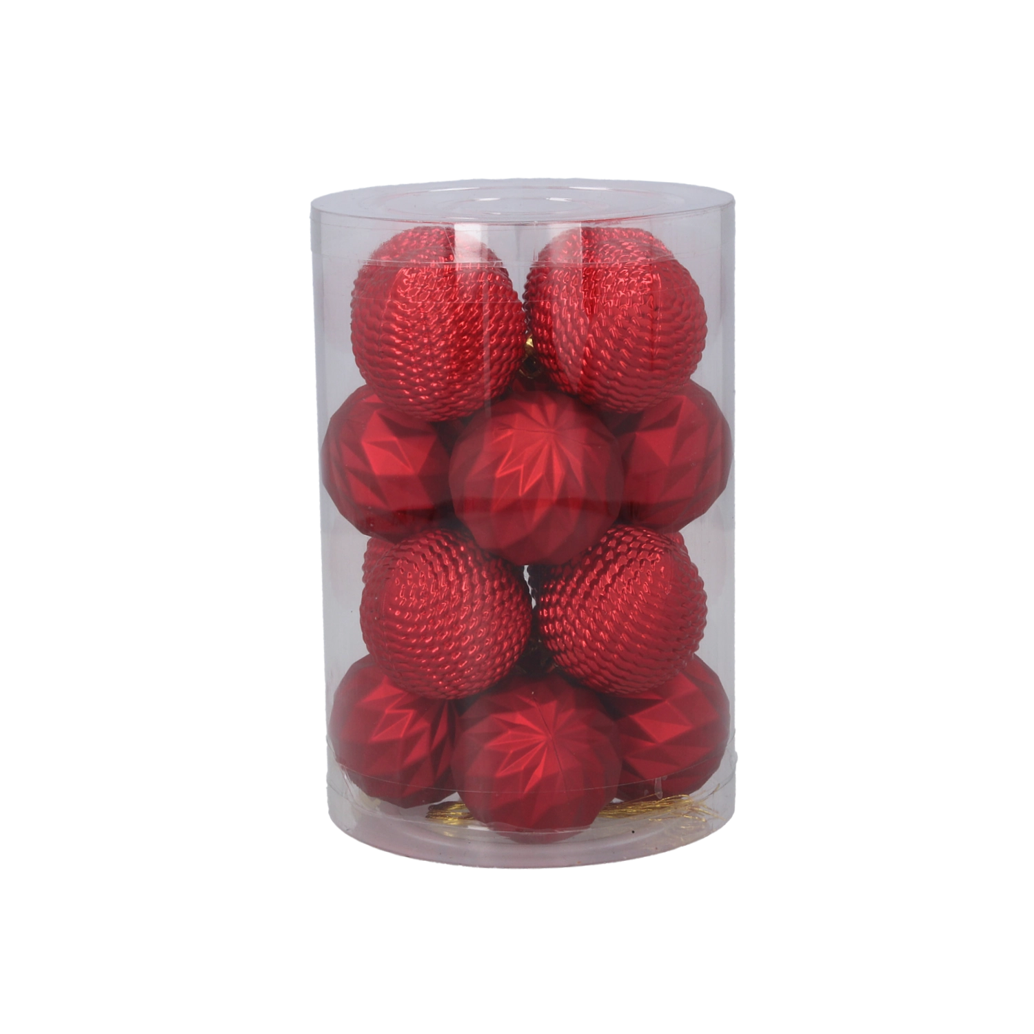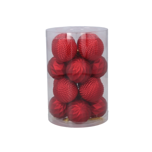 Elegáns, 16 darabos karácsonyi díszszett 4 cm átmérővel, piros, arany és ezüst színkombinációban, amely hagyományos és ünnepi megjelenést kölcsönöz a fának. A törésbiztos anyagból készült díszek biztonságosak, könnyűek és tartósak. A praktikus, átlátszó tubusos csomagolás megkönnyíti a tárolást és a szállítást.