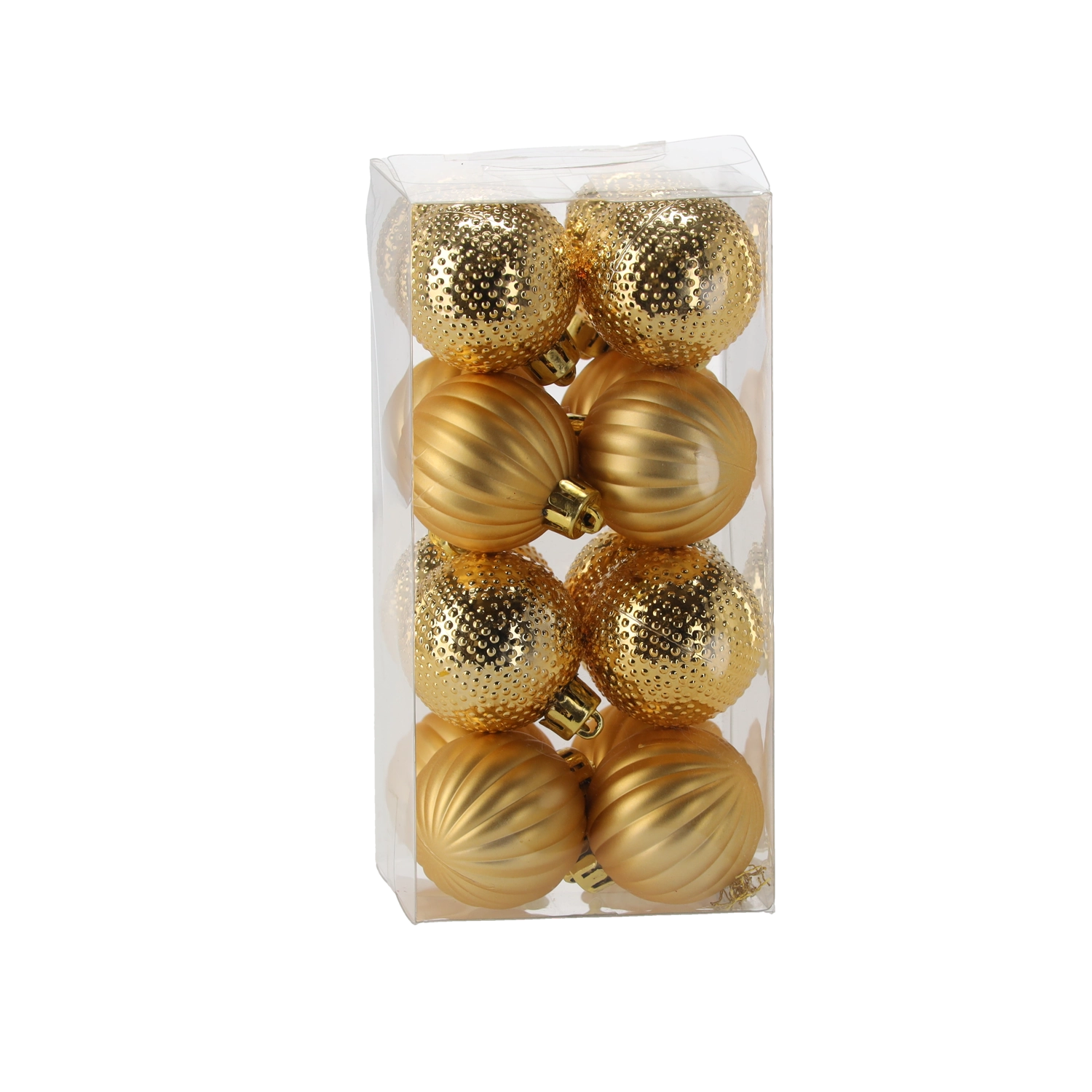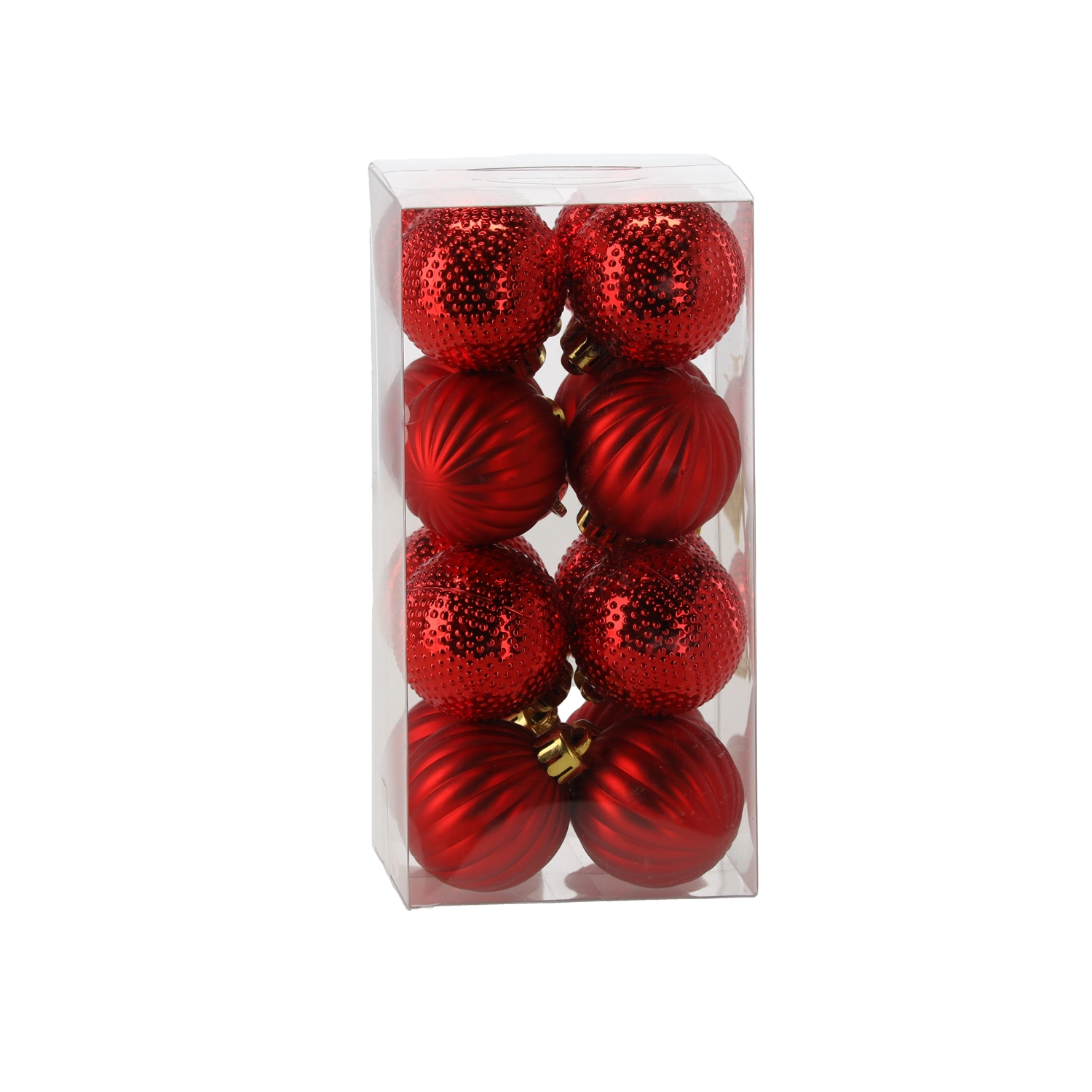 Elegáns, 16 darabos karácsonyi gömbkészlet 4 cm átmérővel, piros, arany és ezüst színkombinációban. Váltakozó fényes és matt felületek dombornyomott mintákkal, amelyek mélységet, csillogást és ünnepi hangulatot adnak a fának. Tartós műanyagból készül a biztonságos és hosszan tartó használatért.