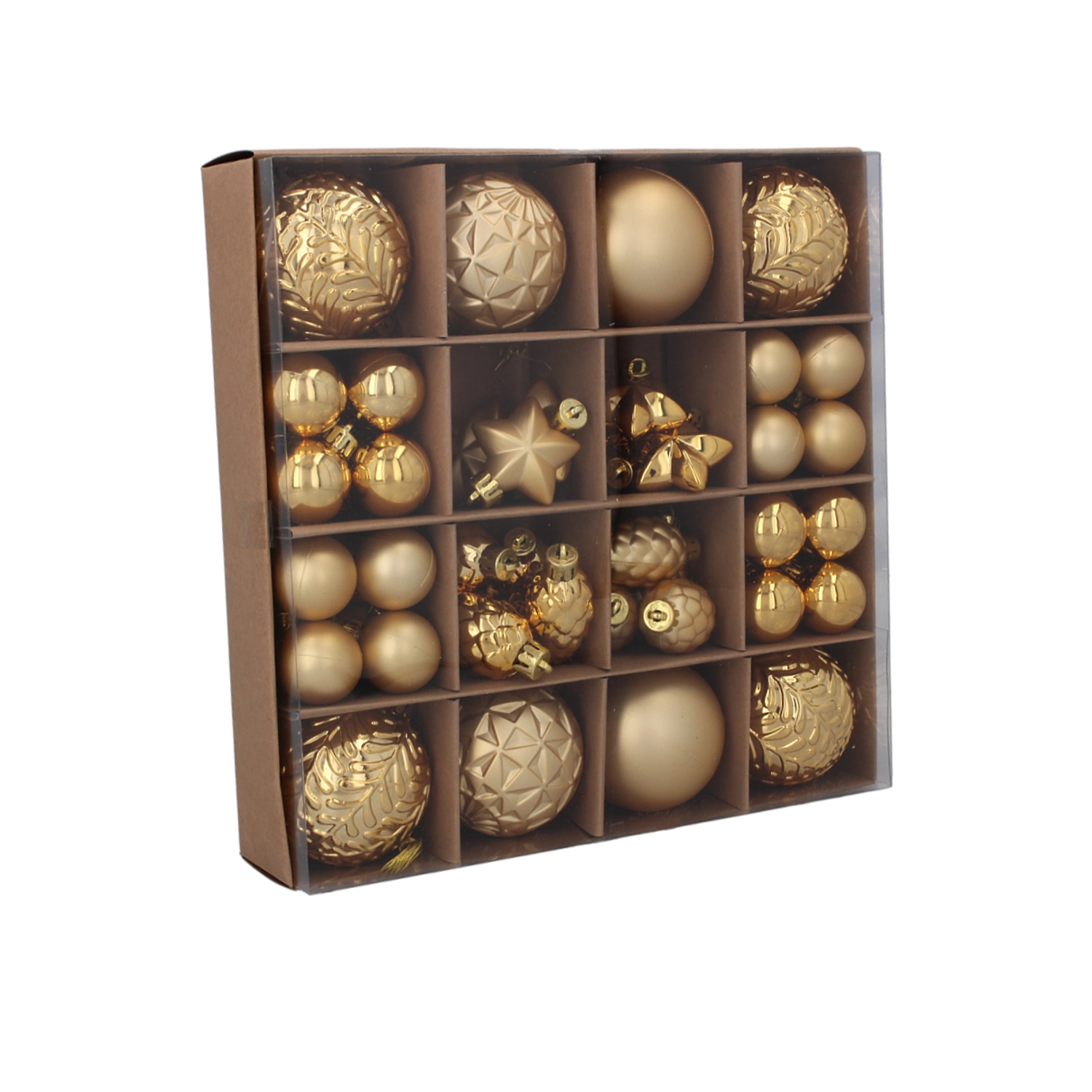 Ez az univerzális készlet klasszikus gömbök, csillagok és tobozok keverékét tartalmazza, harmonikusan összehangolt piros, arany és ezüst árnyalatokban. A matt, fényes és domború felületek kombinációjának köszönhetően kiegyensúlyozott, elegáns dekorációt érhet el, amely szépen veri vissza a fényt és kiemeli az ünnepi hangulatot.