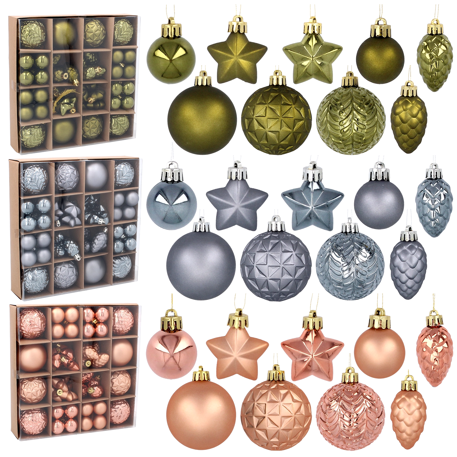 Alkoss stílusos ünnepi fát a 60 darabos díszkészlettel olívazöld, réz és grafit kombinációjában. A könnyű és strapabíró műanyag anyag ideális gyermekes és kisállatos otthonokba is, míg a változatos minták és felületek modern, elegáns hangulatot kölcsönöznek a belső térnek.